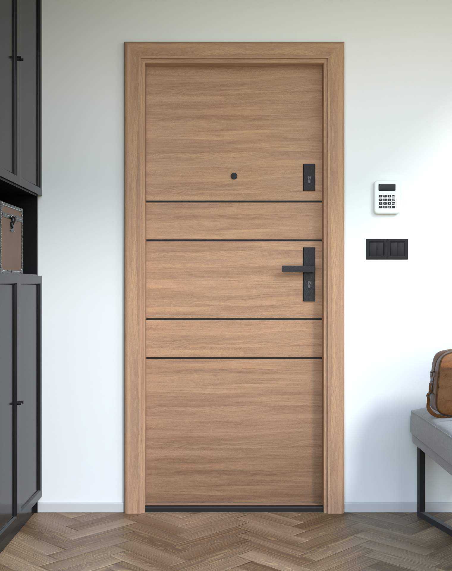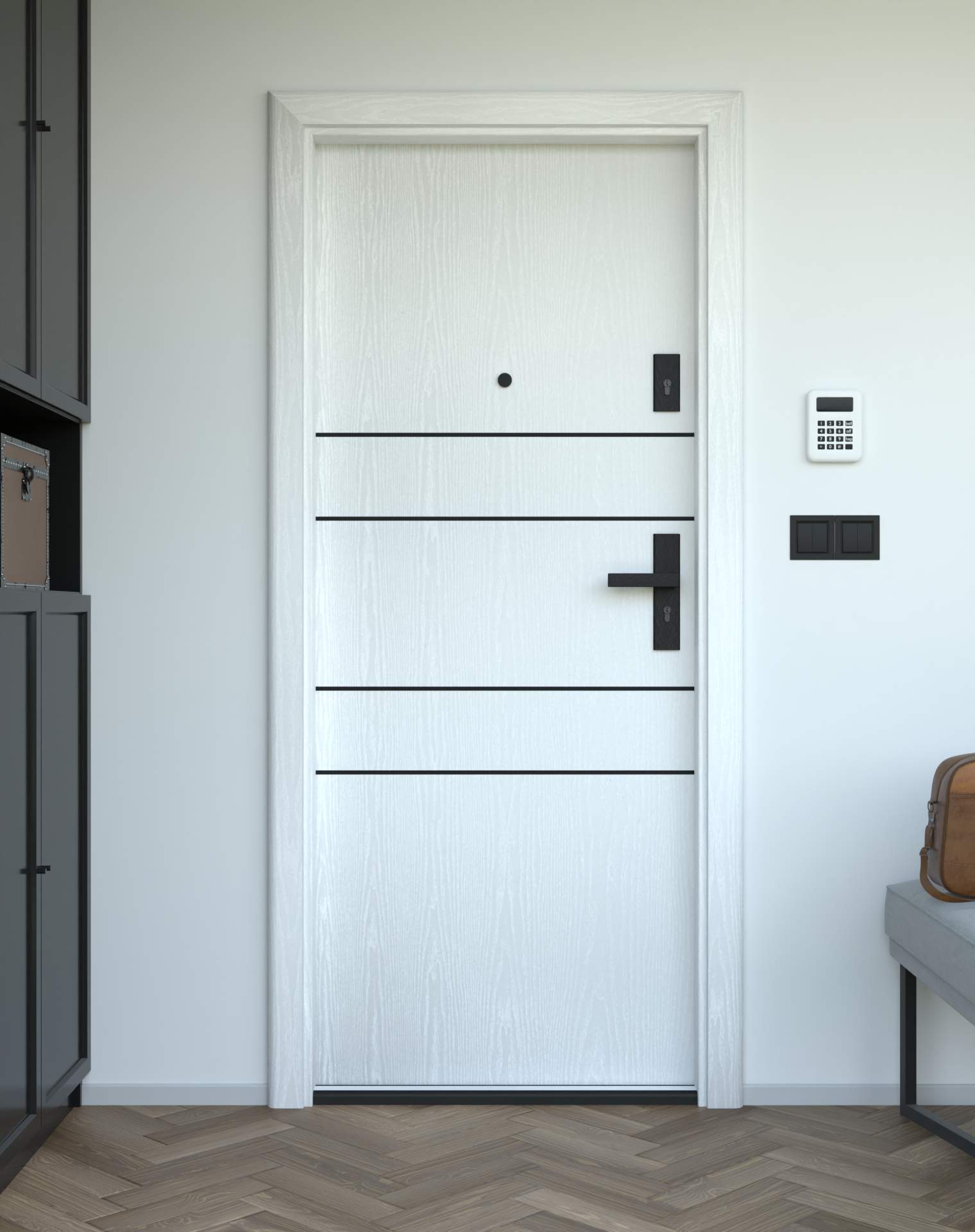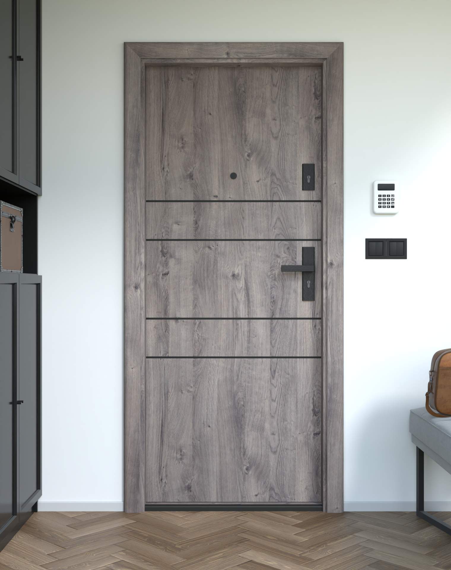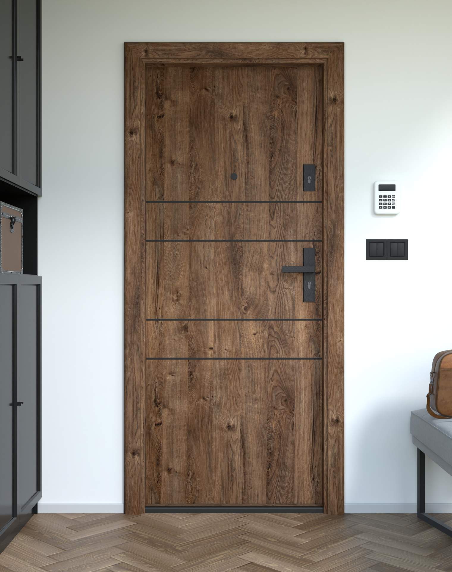 Drzwi z kolekcji Bastion Alu wyróżniają się nowoczesnym wzornictwem uzupełnionym o aluminiowe intarsje w kolorze Inox (srebrnym), rozmieszczone pionowo lub poziomo w zależności od modelu. Wstawki mogą być smukłe lub pogrubione, rozmieszczone pionowo bądź poziomo, tworząc elegancki kontrast z powierzchnią skrzydła, która może być gładka lub wzbogacona frezowaniem. Solidna konstrukcja z płytą dźwiękochłonną lub panelem wyciszającym gwarantuje trwałość i bardzo dobrą izolację akustyczną.