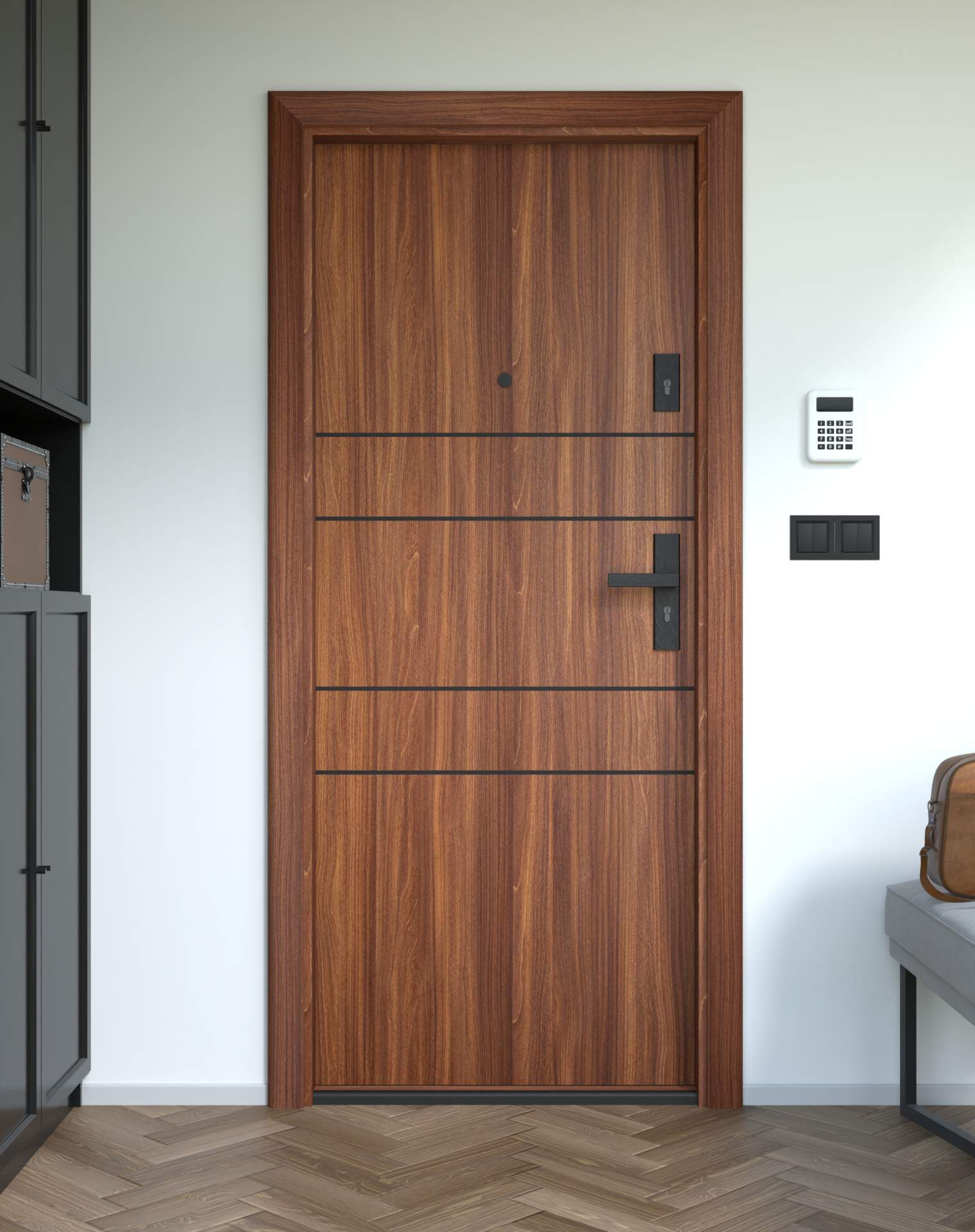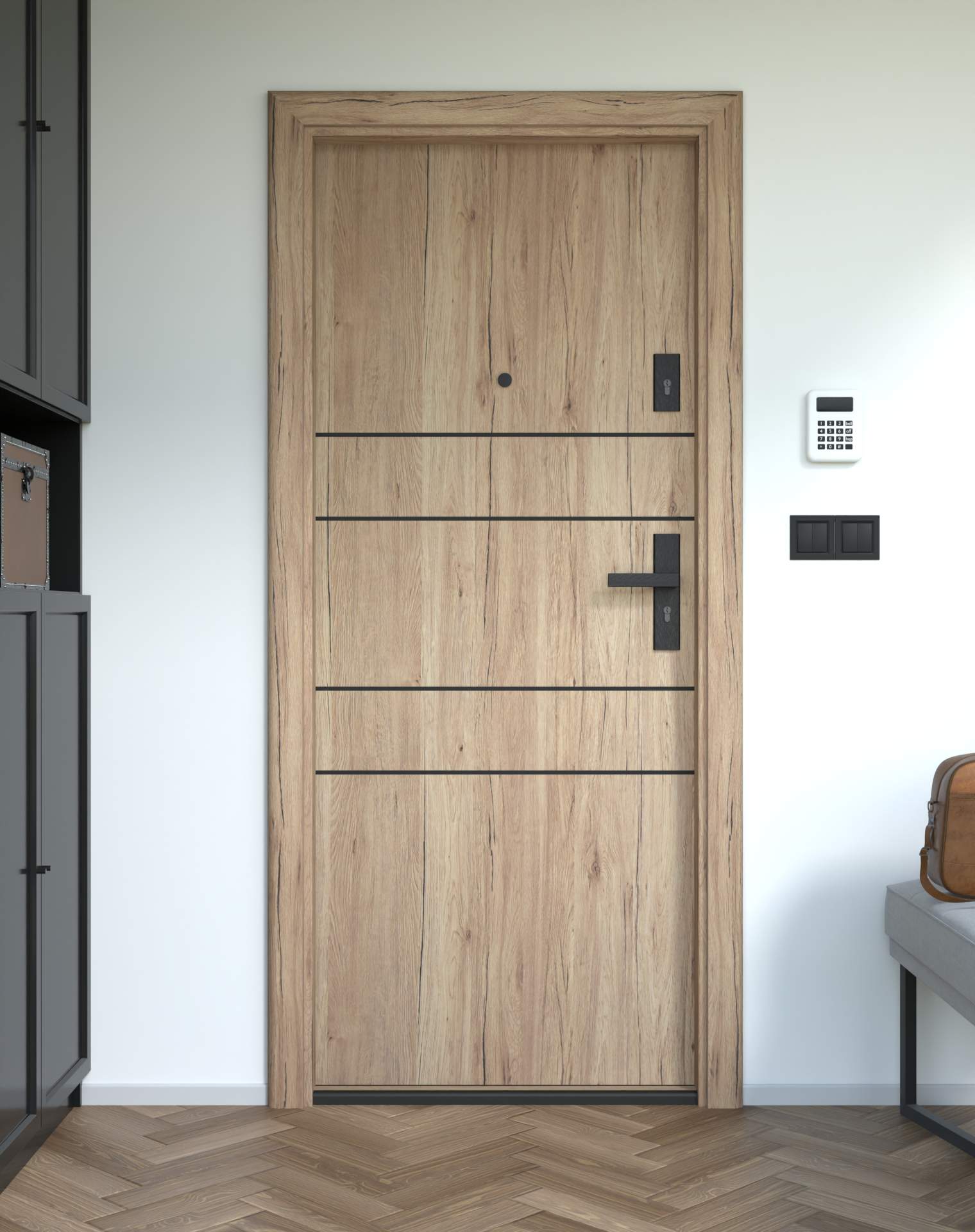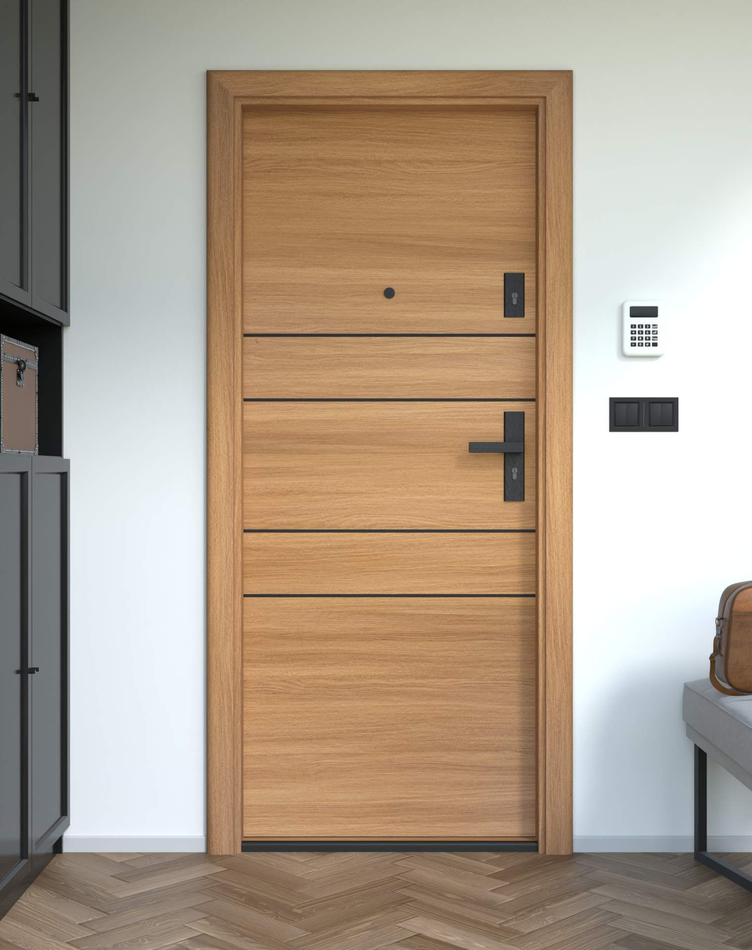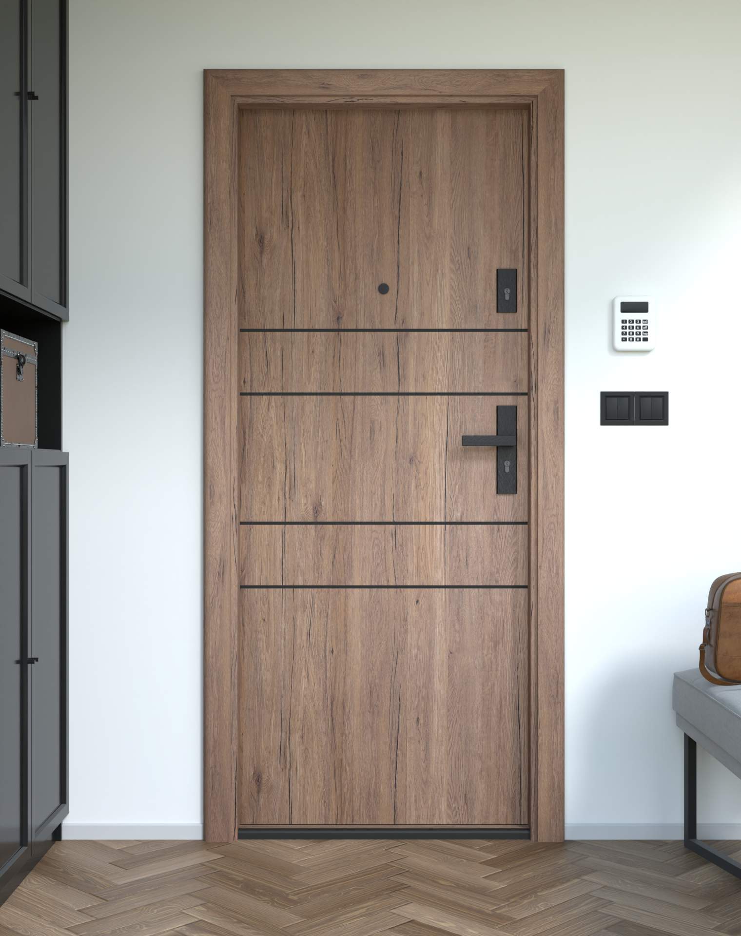 Drzwi z kolekcji Bastion Alu wyróżniają się nowoczesnym wzornictwem uzupełnionym o aluminiowe intarsje w kolorze Inox (srebrnym), rozmieszczone pionowo lub poziomo w zależności od modelu. Wstawki mogą być smukłe lub pogrubione, rozmieszczone pionowo bądź poziomo, tworząc elegancki kontrast z powierzchnią skrzydła, która może być gładka lub wzbogacona frezowaniem. Solidna konstrukcja z płytą dźwiękochłonną lub panelem wyciszającym gwarantuje trwałość i bardzo dobrą izolację akustyczną.
