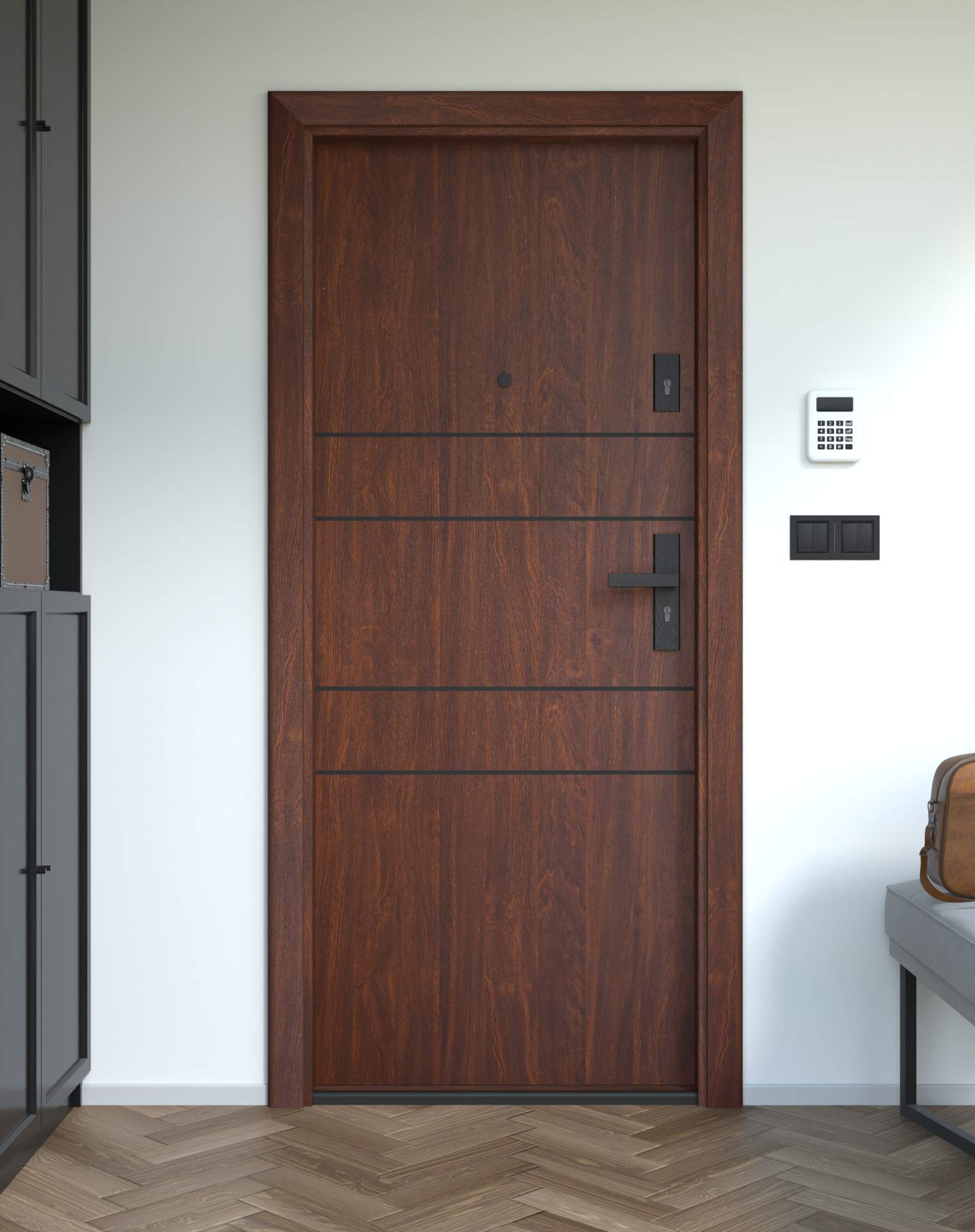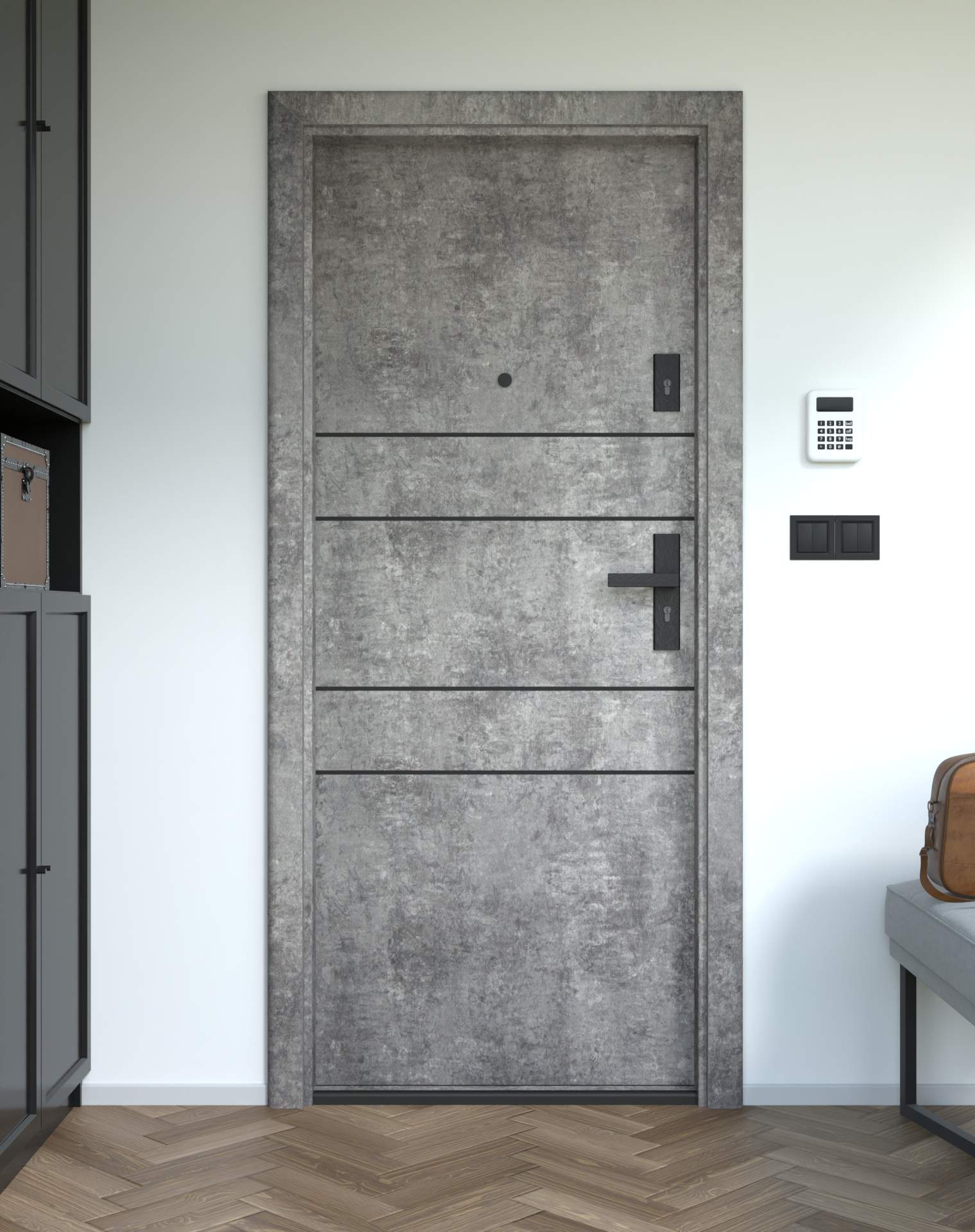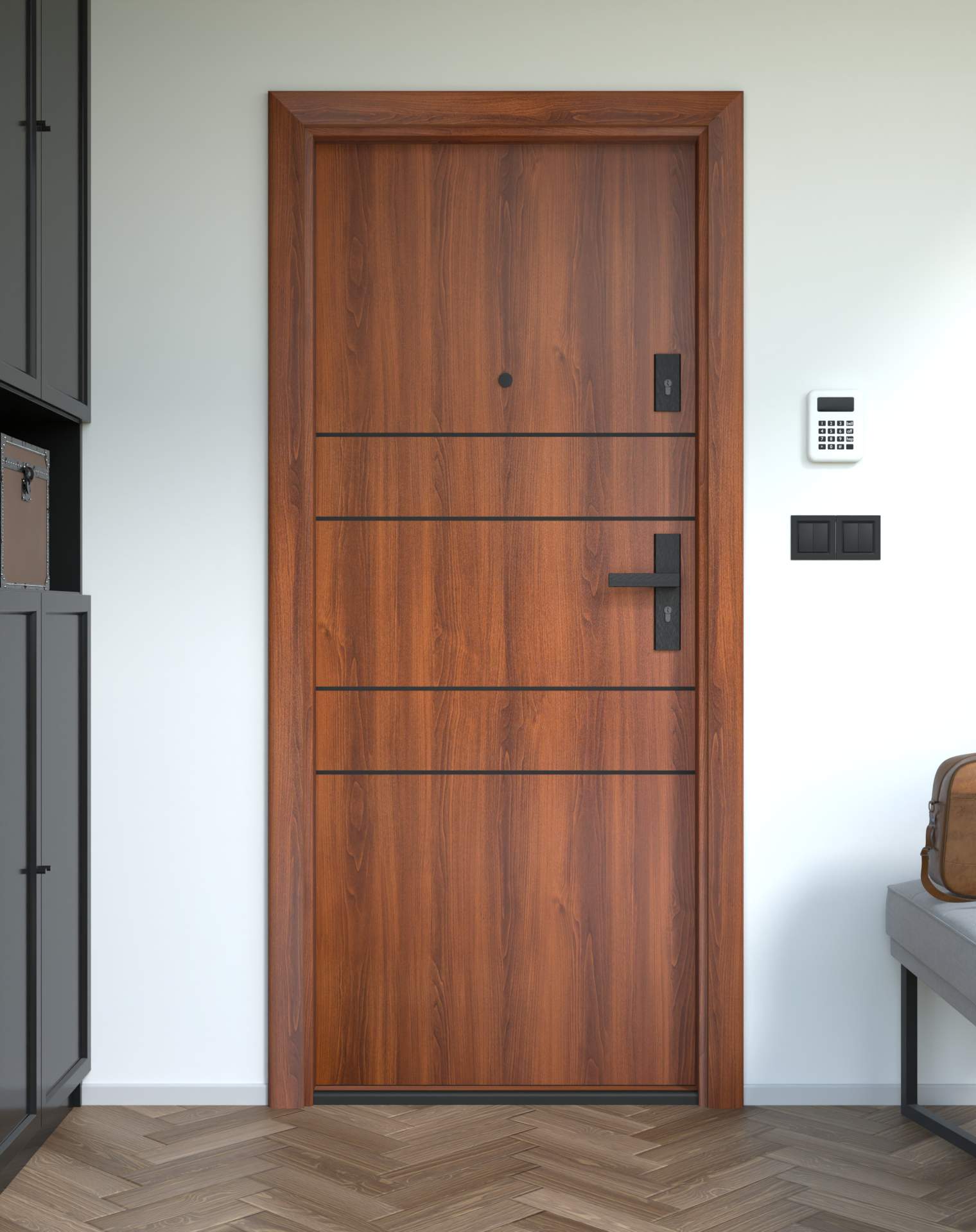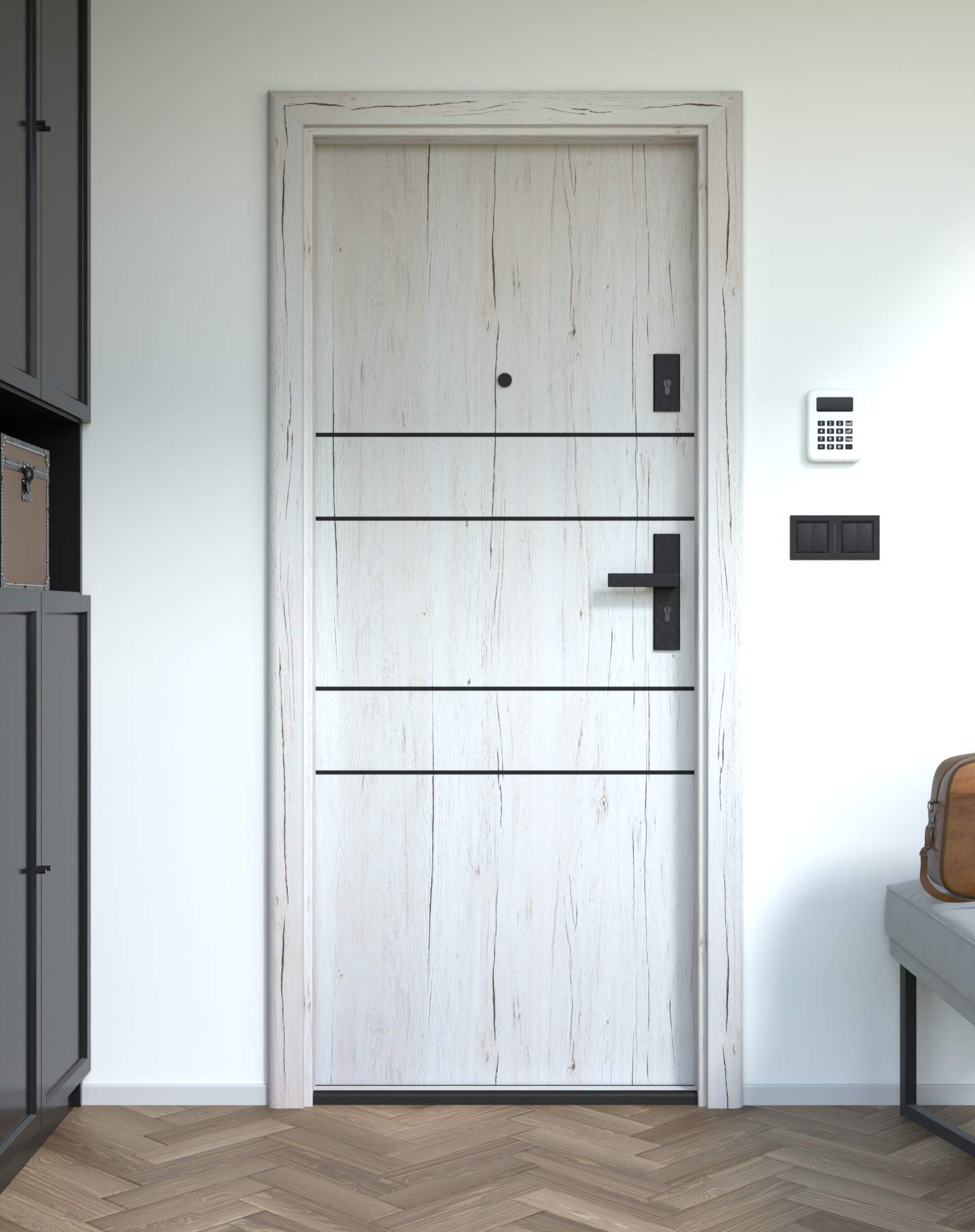 Drzwi z kolekcji Bastion Alu wyróżniają się nowoczesnym wzornictwem uzupełnionym o aluminiowe intarsje w kolorze Inox (srebrnym), rozmieszczone pionowo lub poziomo w zależności od modelu. Wstawki mogą być smukłe lub pogrubione, rozmieszczone pionowo bądź poziomo, tworząc elegancki kontrast z powierzchnią skrzydła, która może być gładka lub wzbogacona frezowaniem. Solidna konstrukcja z płytą dźwiękochłonną lub panelem wyciszającym gwarantuje trwałość i bardzo dobrą izolację akustyczną.