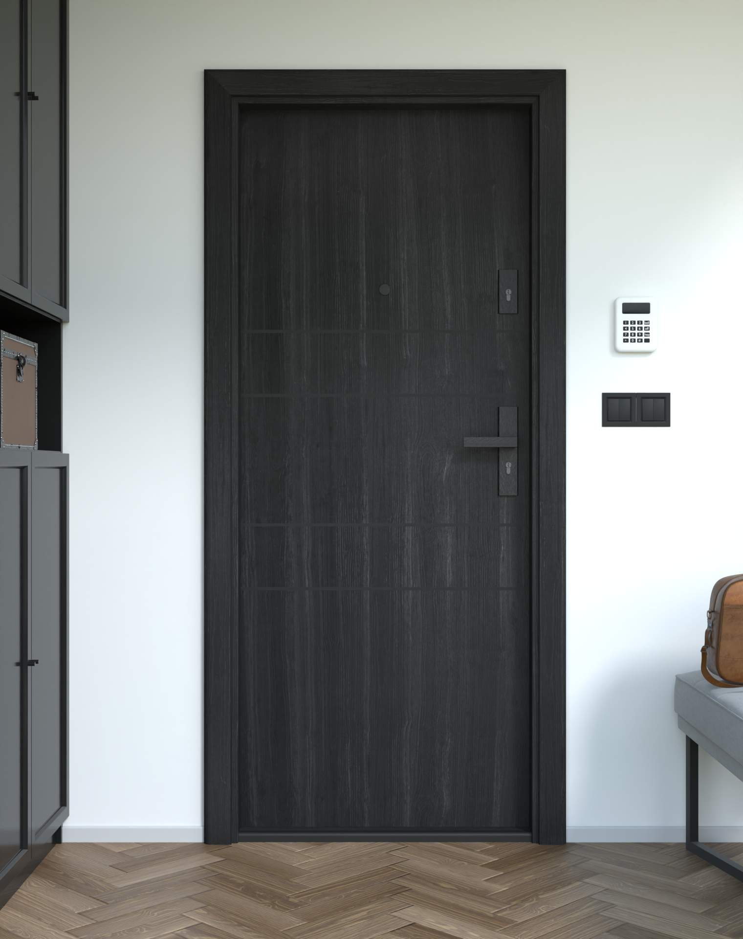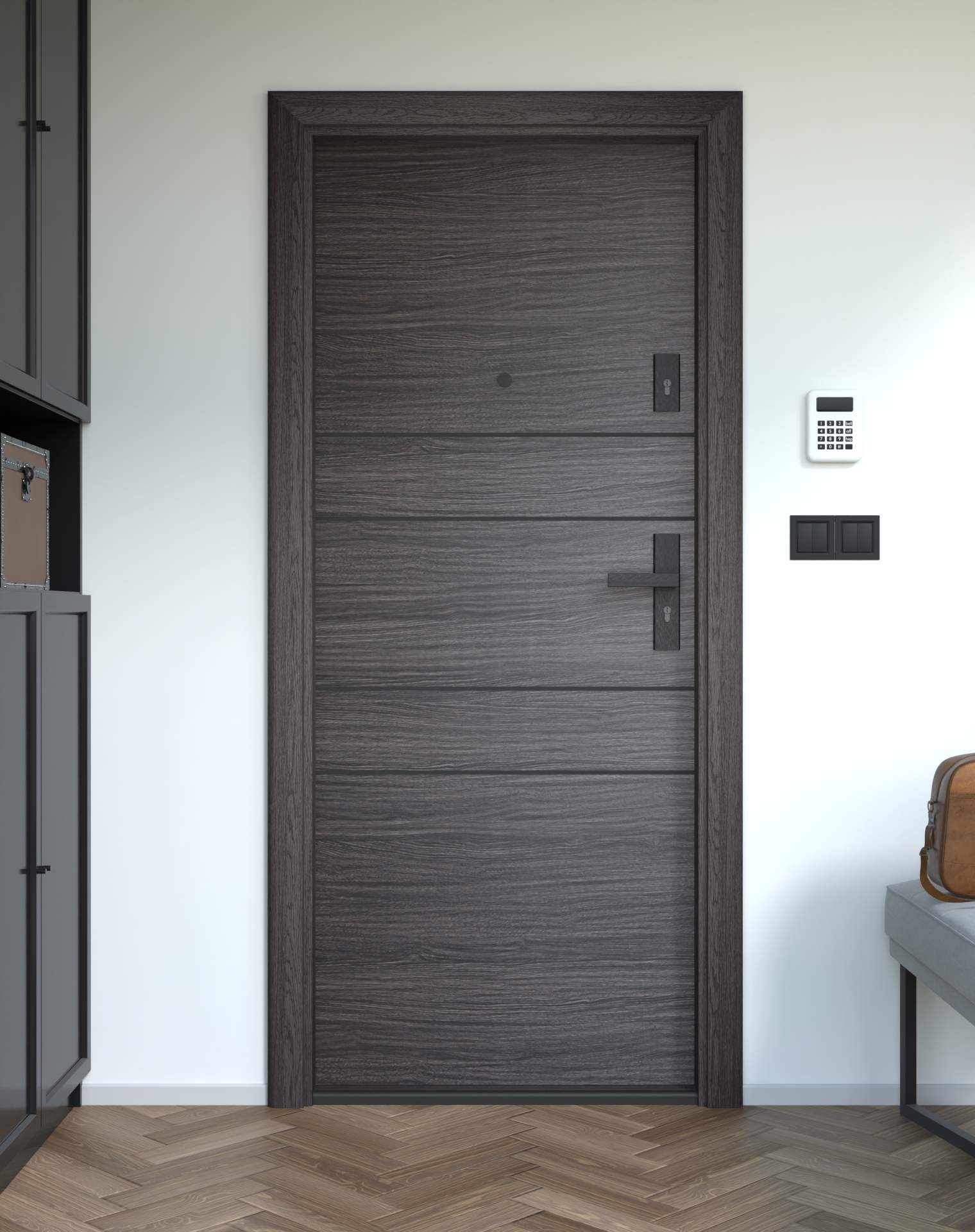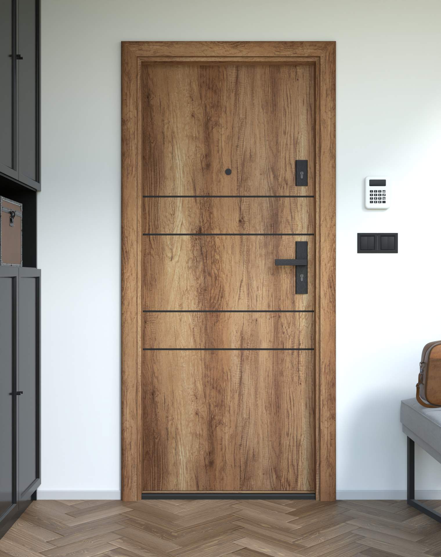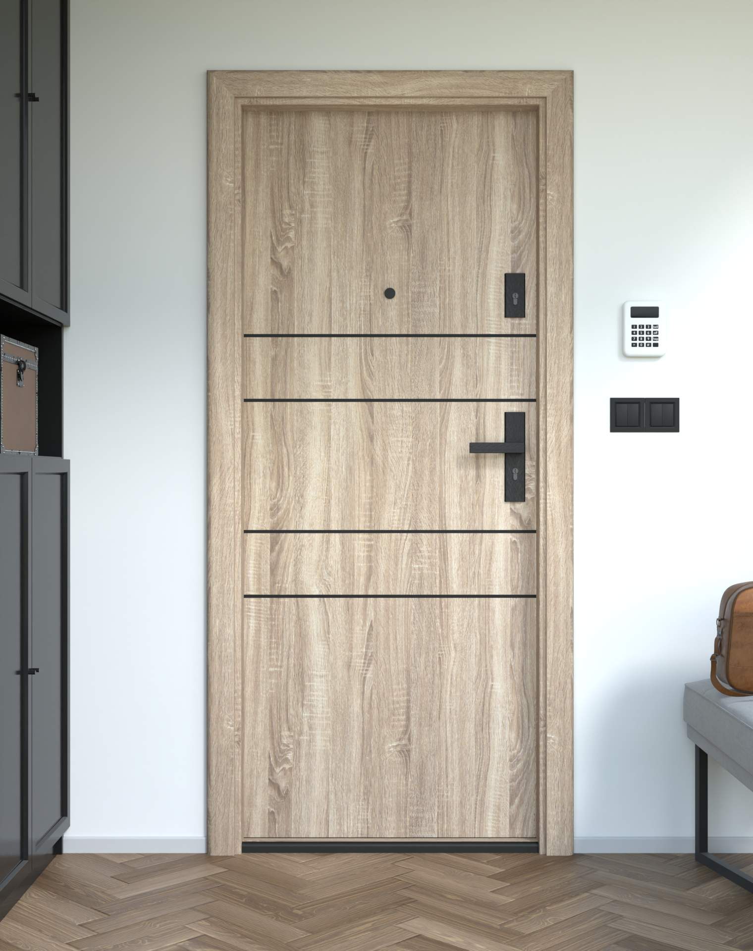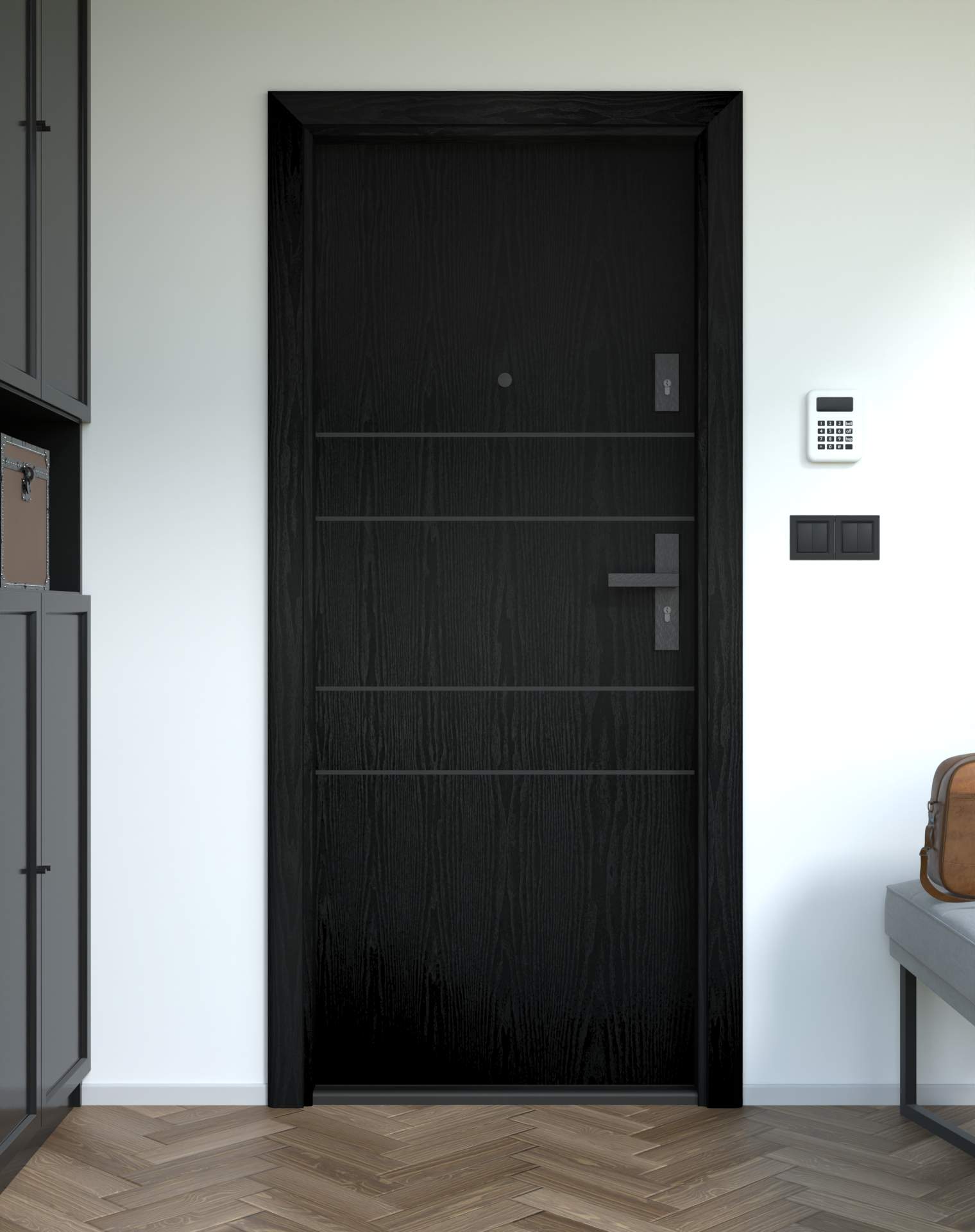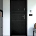 Nowoczesne drzwi wejściowe z poziomymi intarsjami z aluminium w kolorze czarnym.