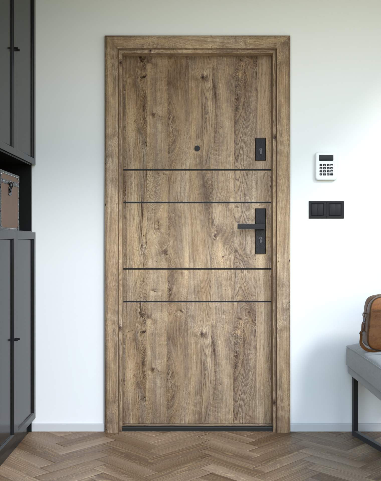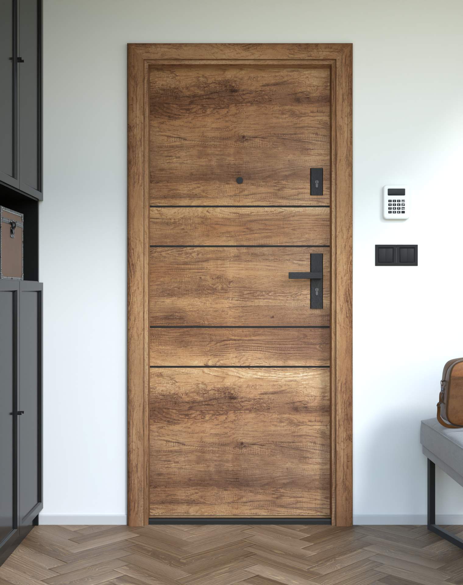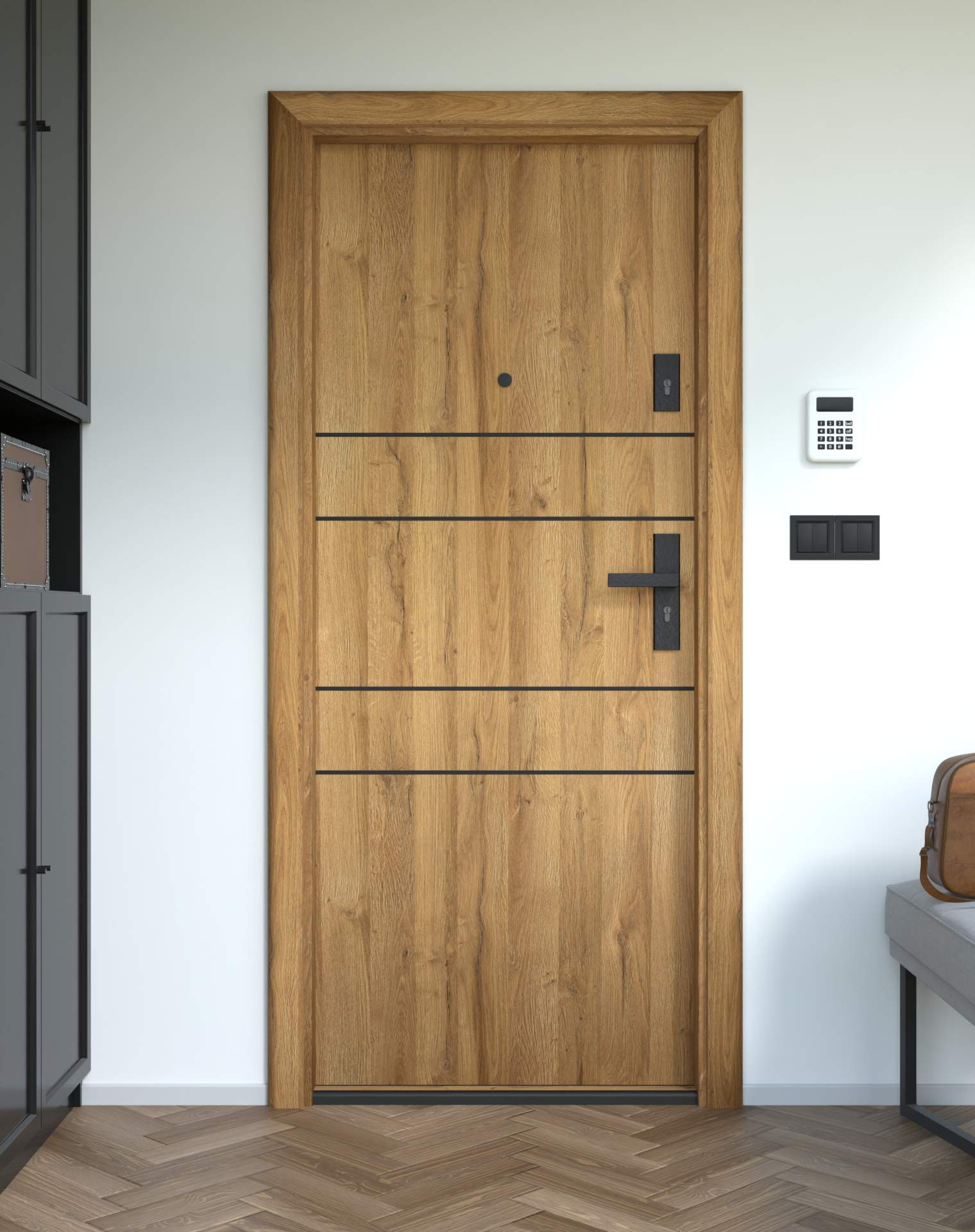 Okucia antywłamaniowe z anodowanego aluminium, odporne na zarysowania i próby włamania, zgodne z normą RC2. Komplet obejmuje rozwiązania konstrukcyjne zwiększające ochronę drzwi wejściowych.