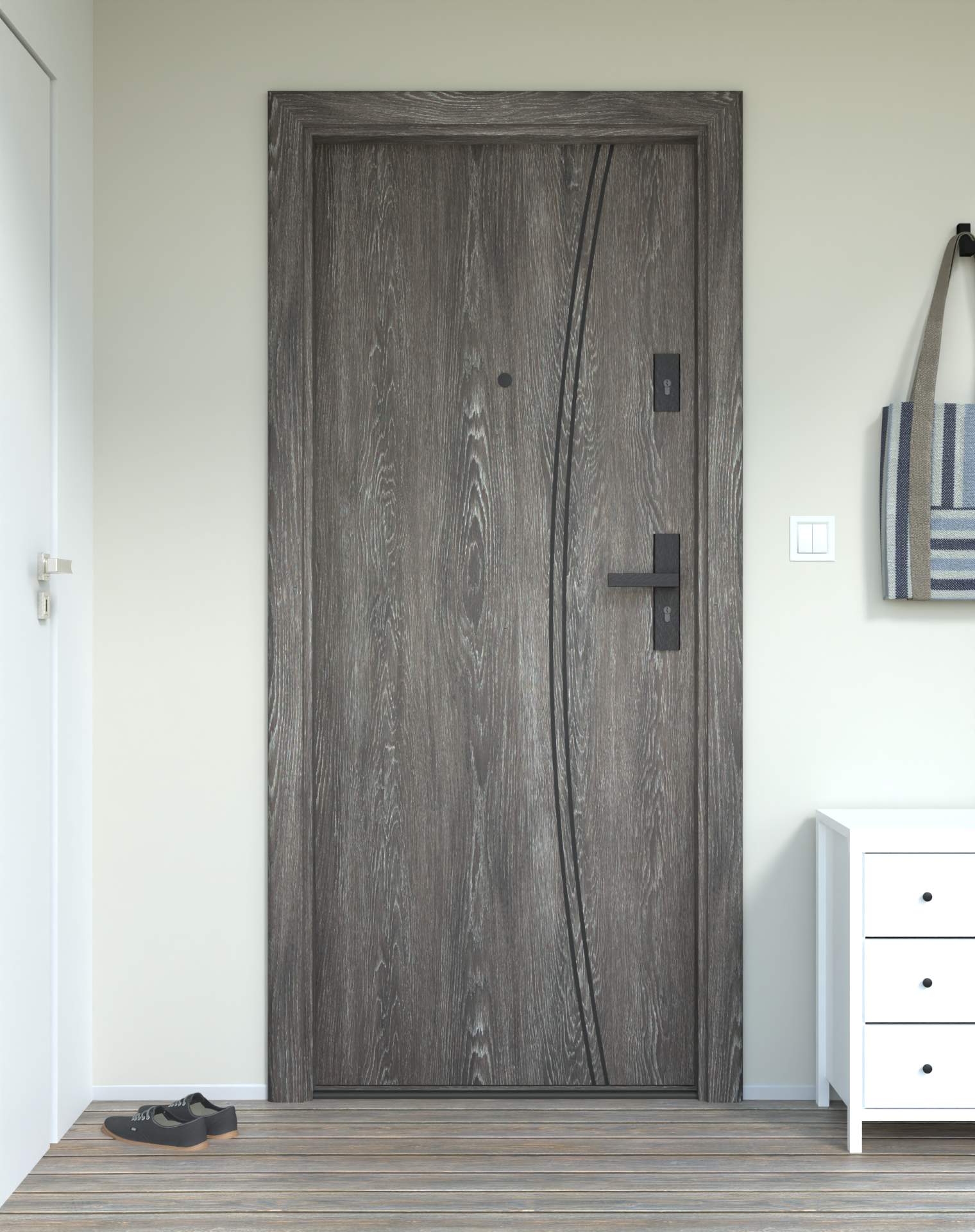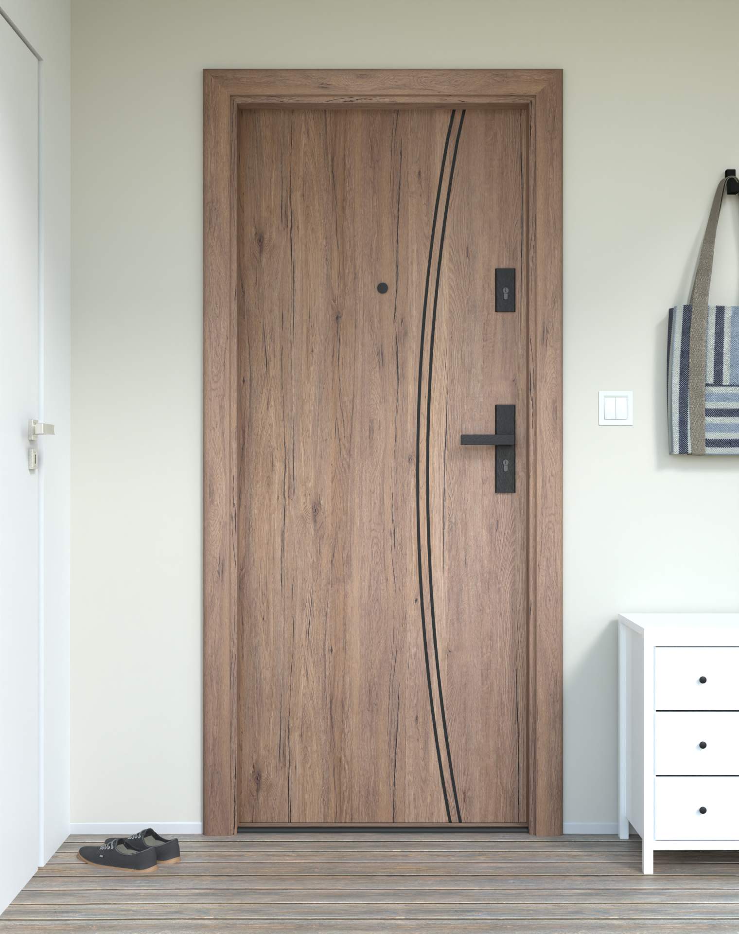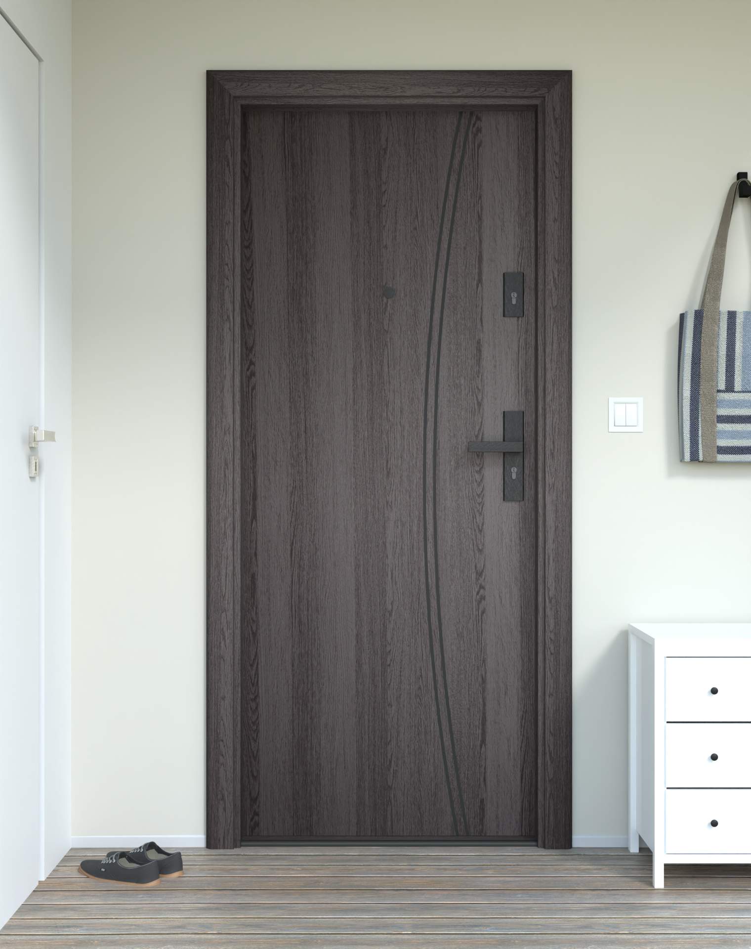 Okucia antywłamaniowe z anodowanego aluminium, odporne na zarysowania i próby włamania, zgodne z normą RC2. Komplet obejmuje rozwiązania konstrukcyjne zwiększające ochronę drzwi wejściowych.