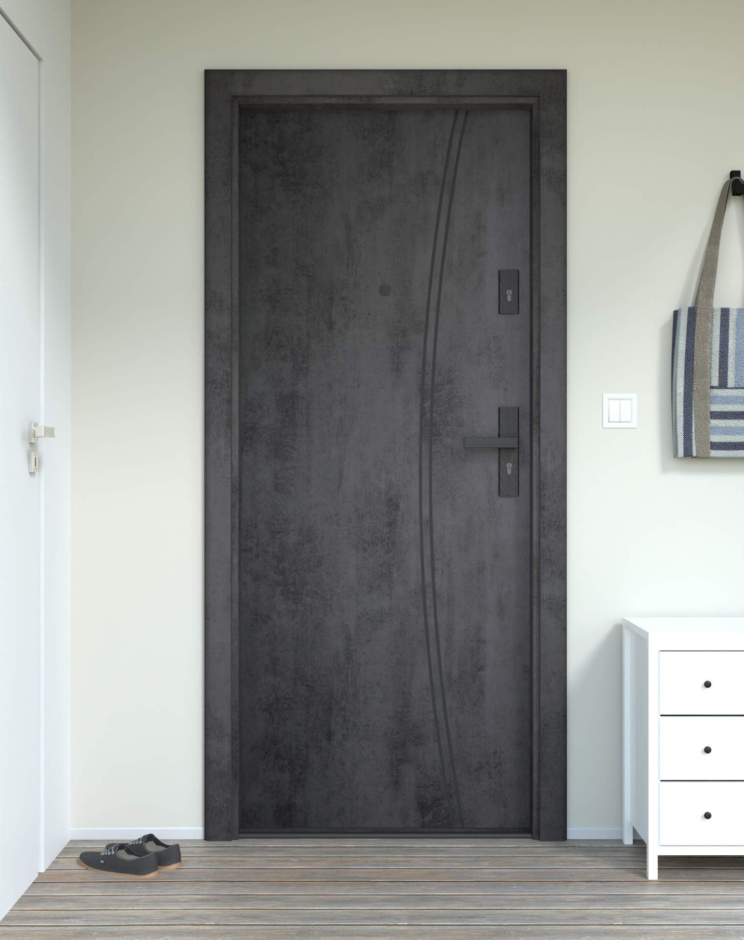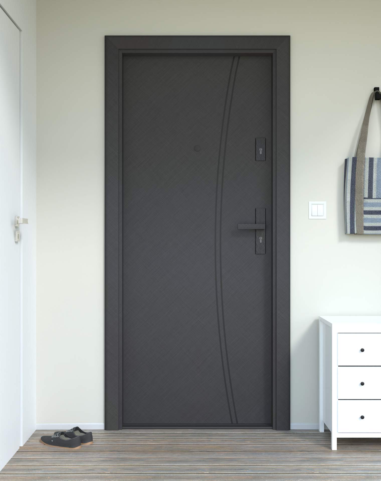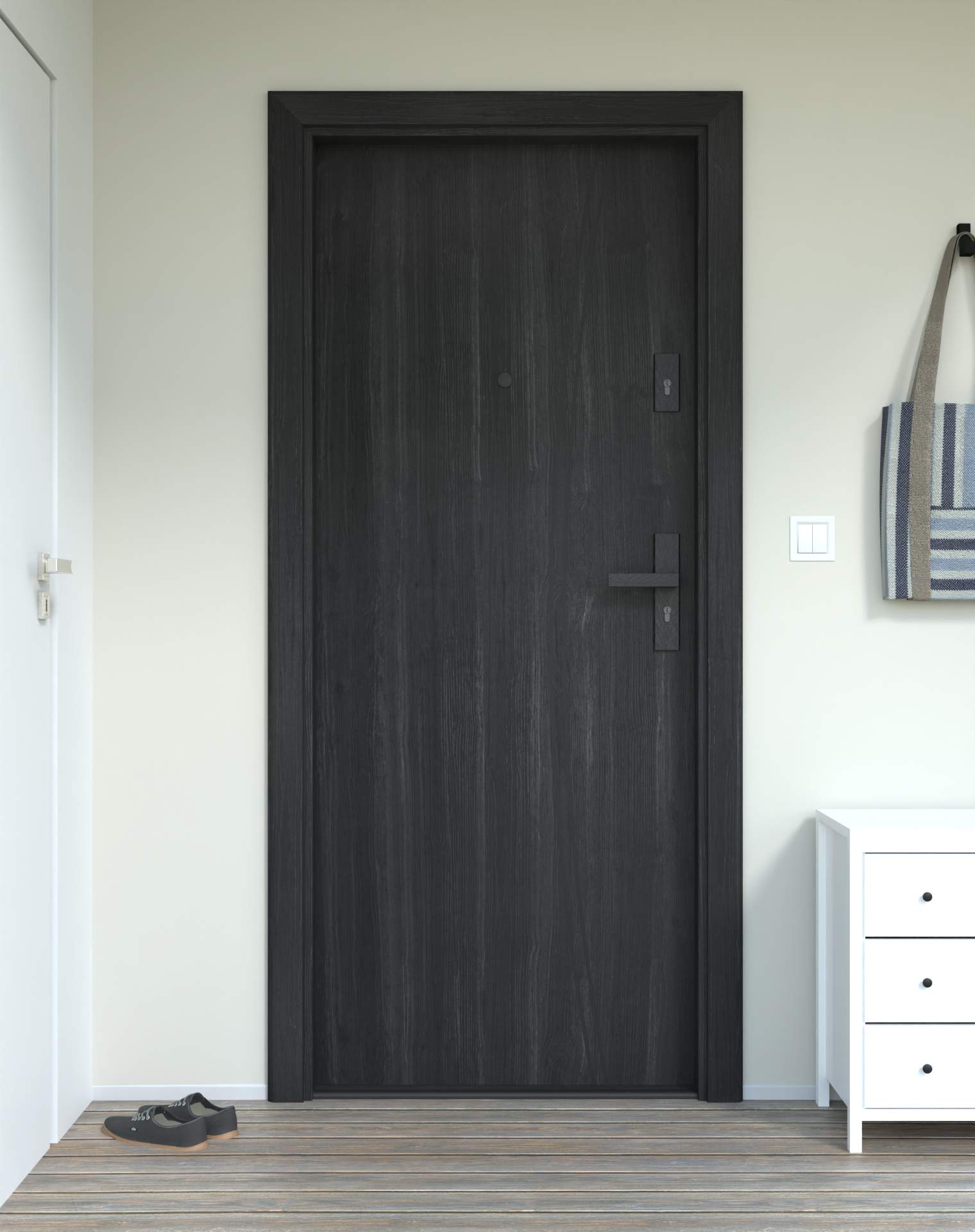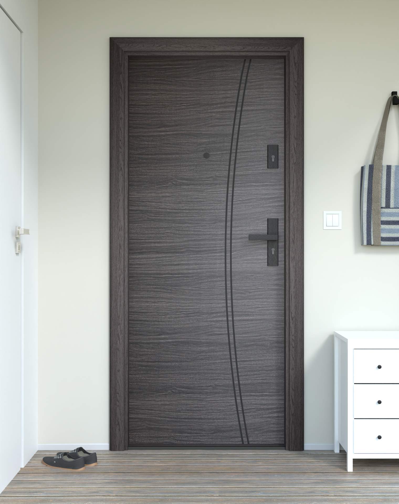 Okucia antywłamaniowe z anodowanego aluminium, odporne na zarysowania i próby włamania, zgodne z normą RC2. Komplet obejmuje rozwiązania konstrukcyjne zwiększające ochronę drzwi wejściowych.