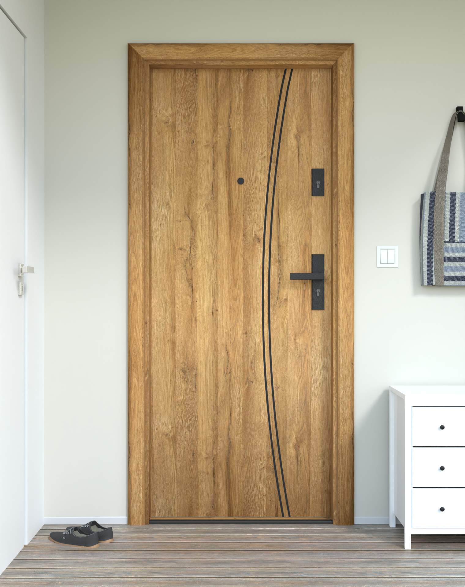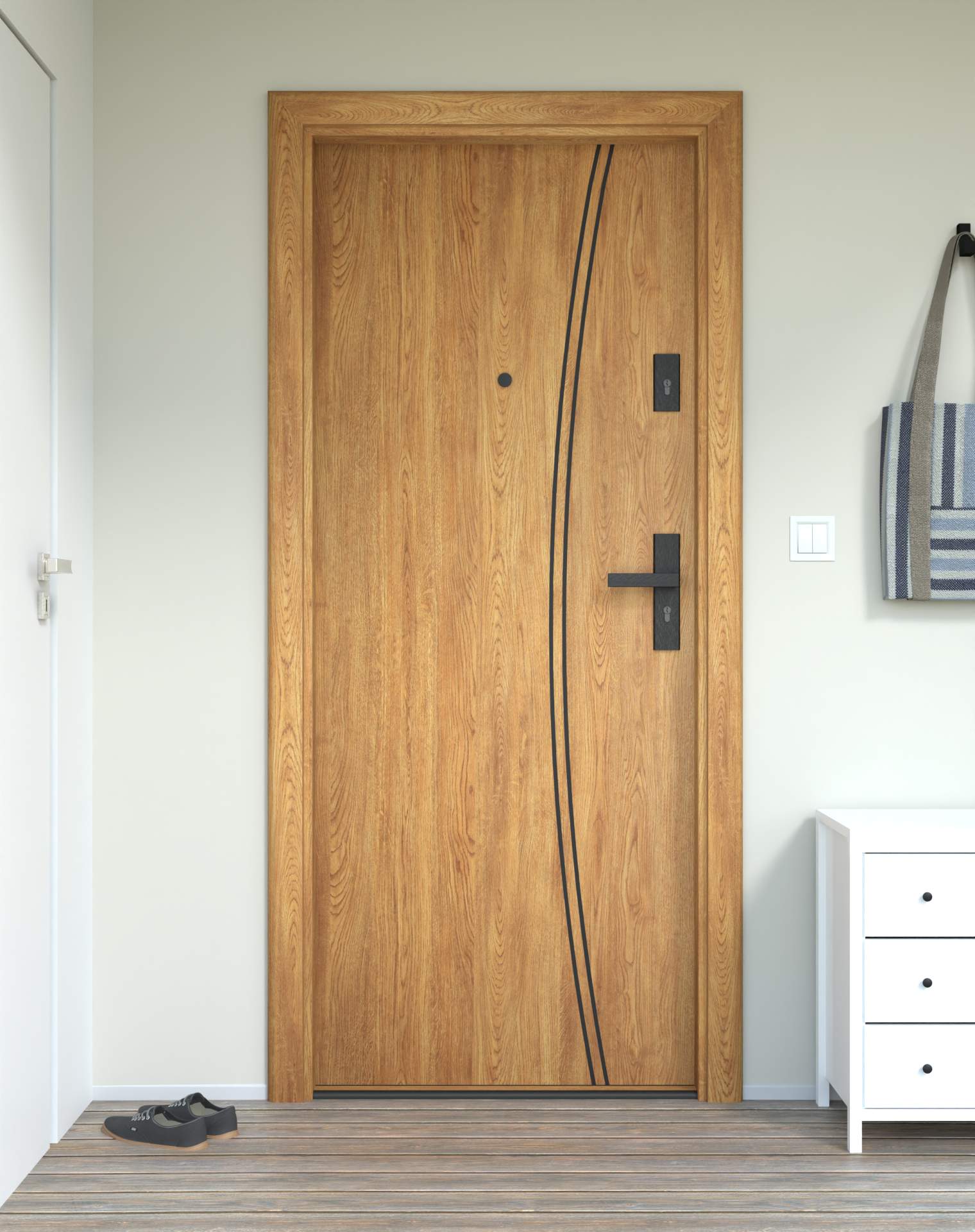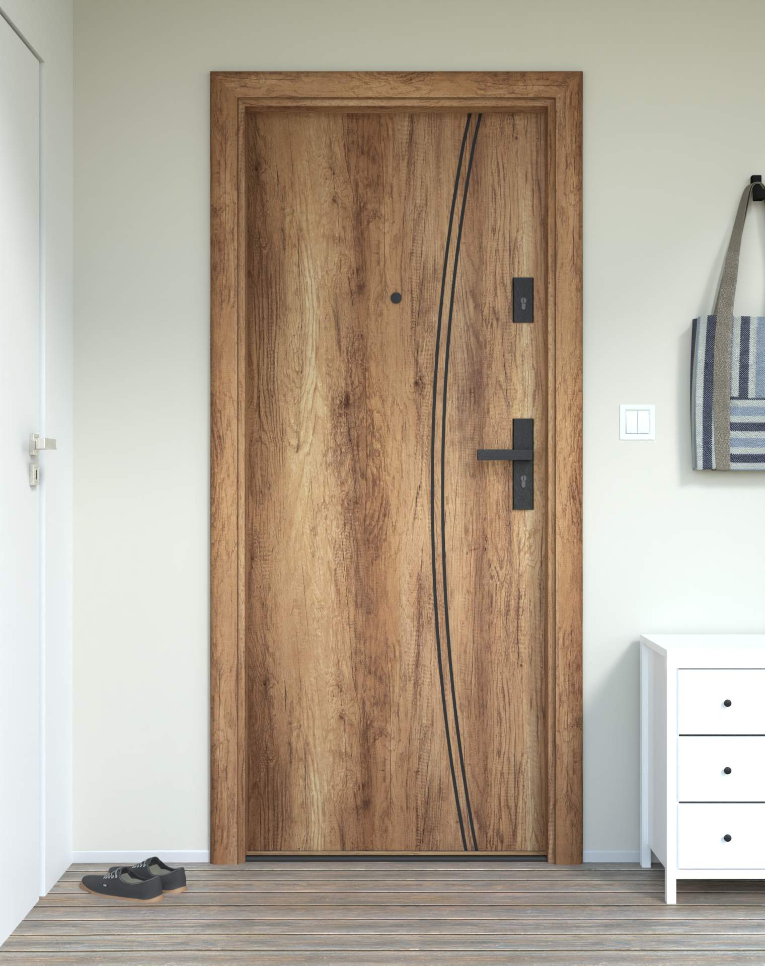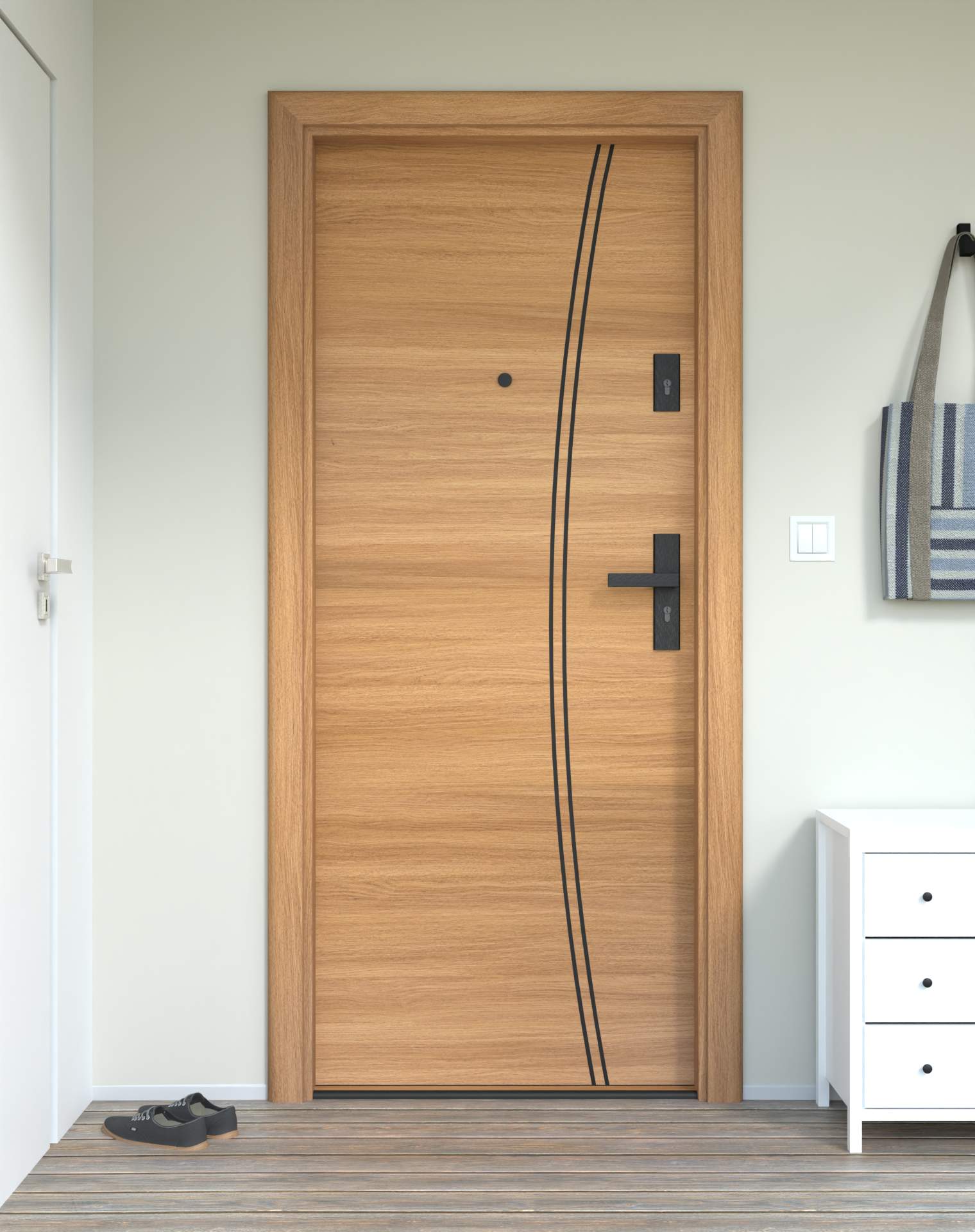 Model z aluminiowymi intrasjami o zaokrąglonym kształcie, umieszczonymi bliżej okuć, nadających drzwiom lekkości.