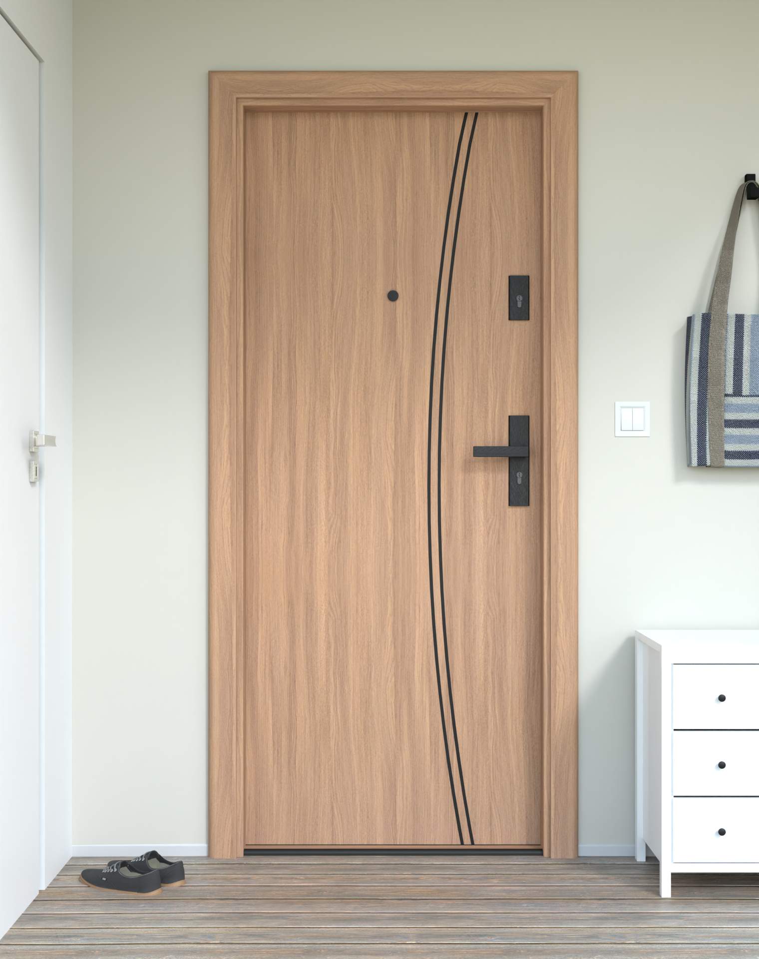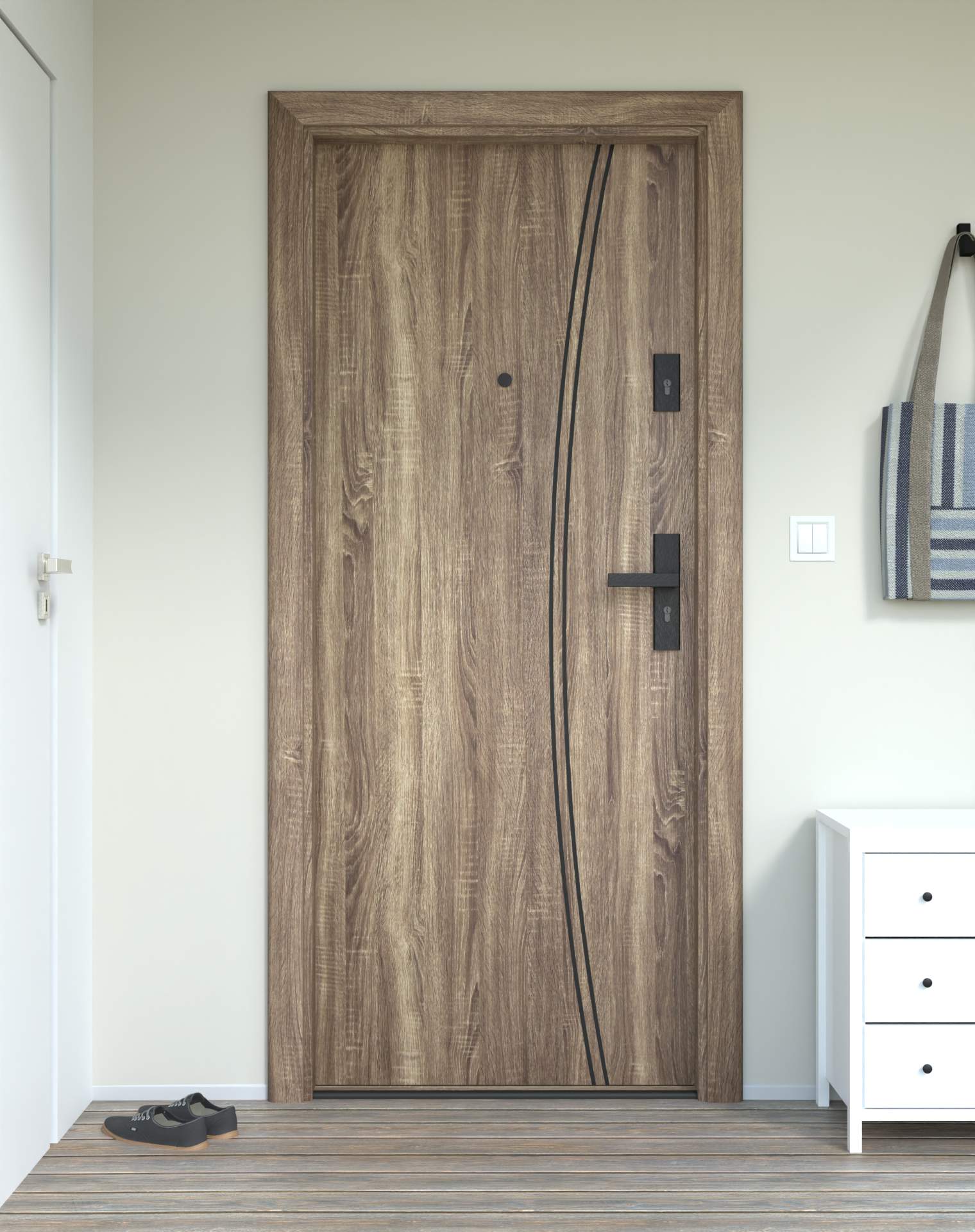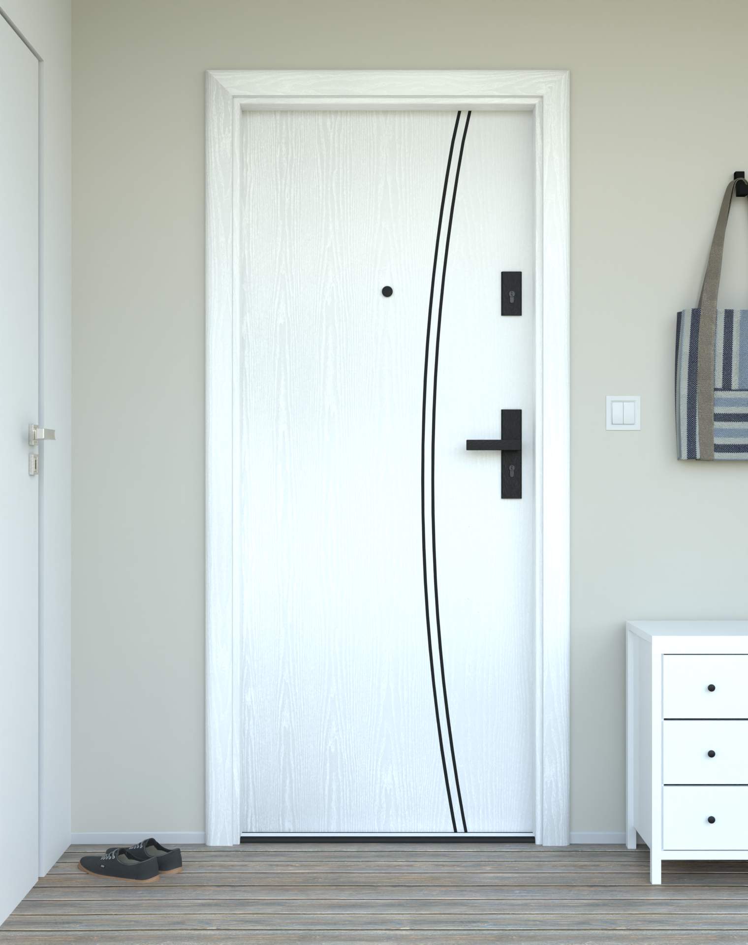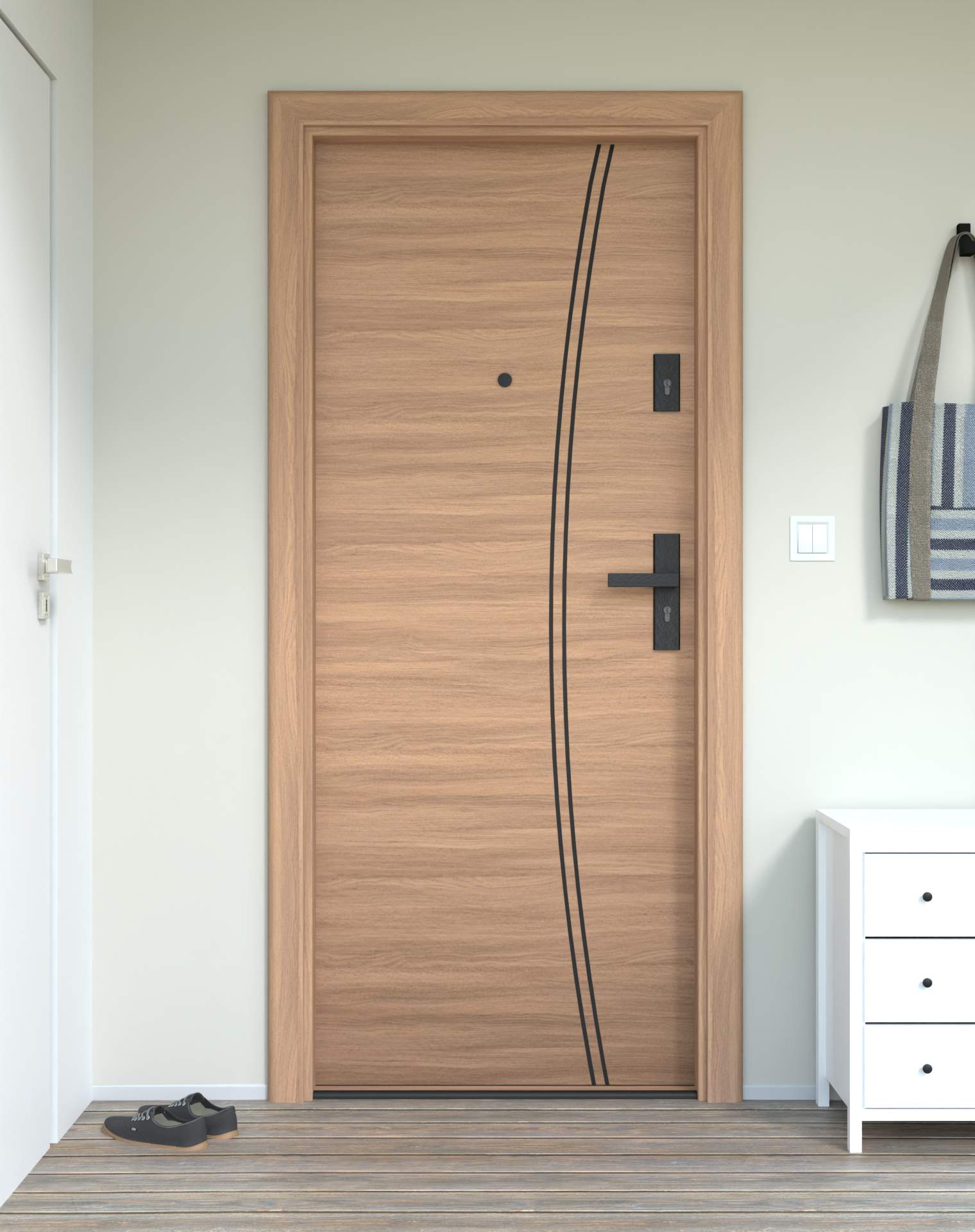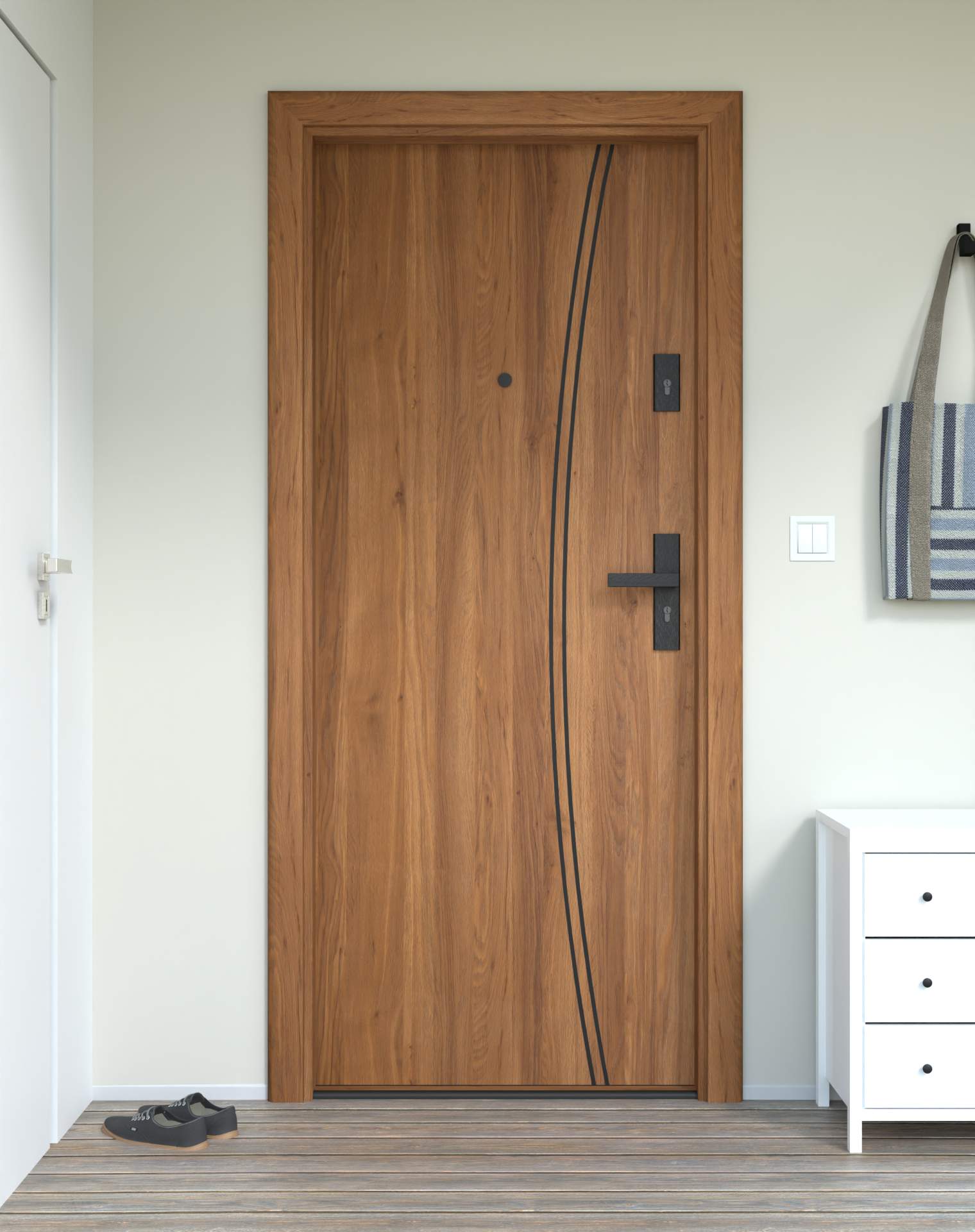 Model z aluminiowymi intrasjami o zaokrąglonym kształcie, umieszczonymi bliżej okuć, nadających drzwiom lekkości.
