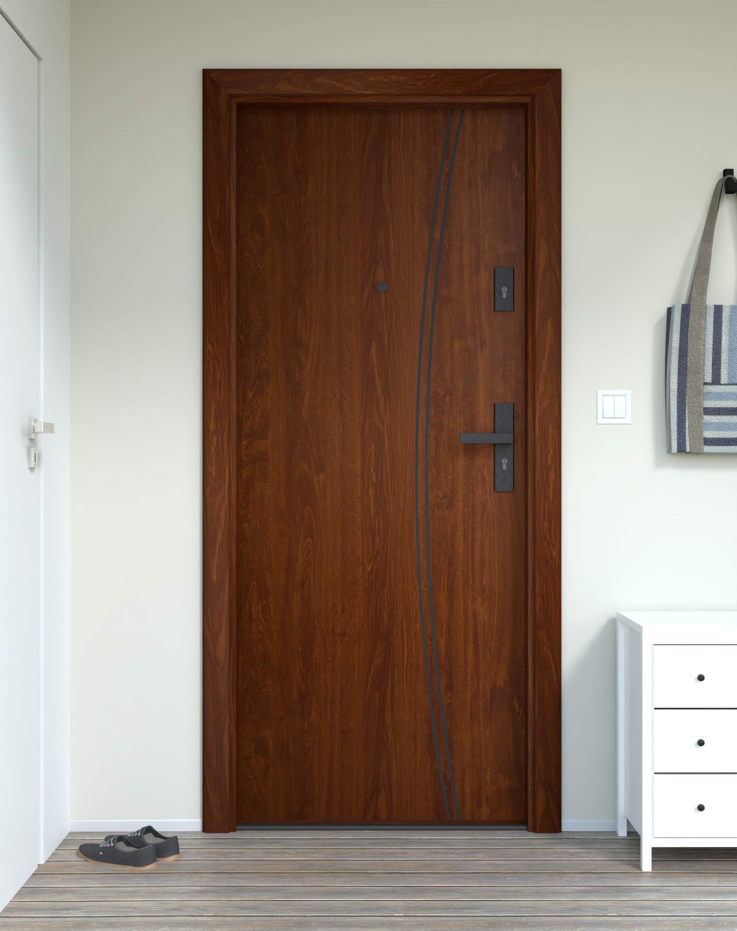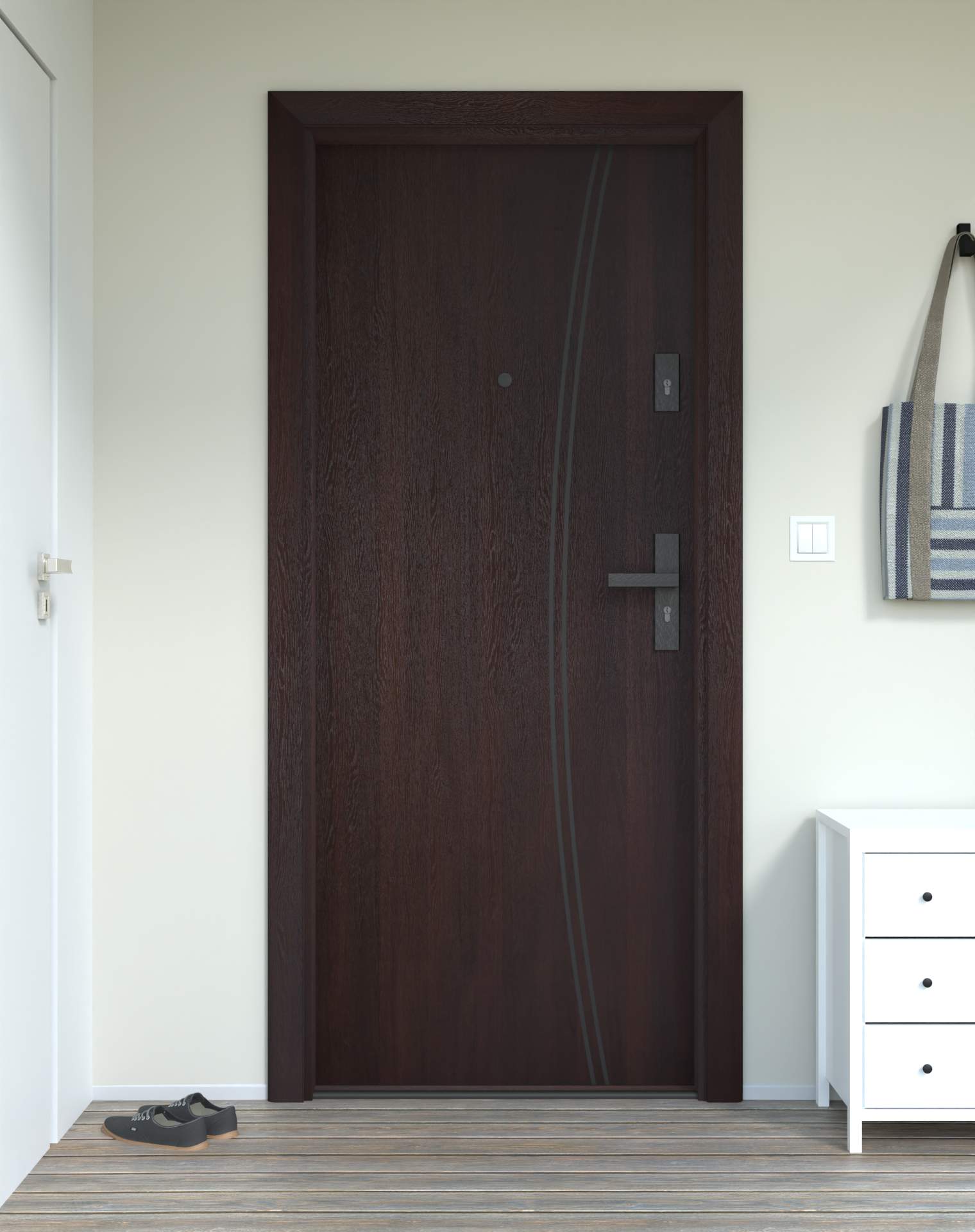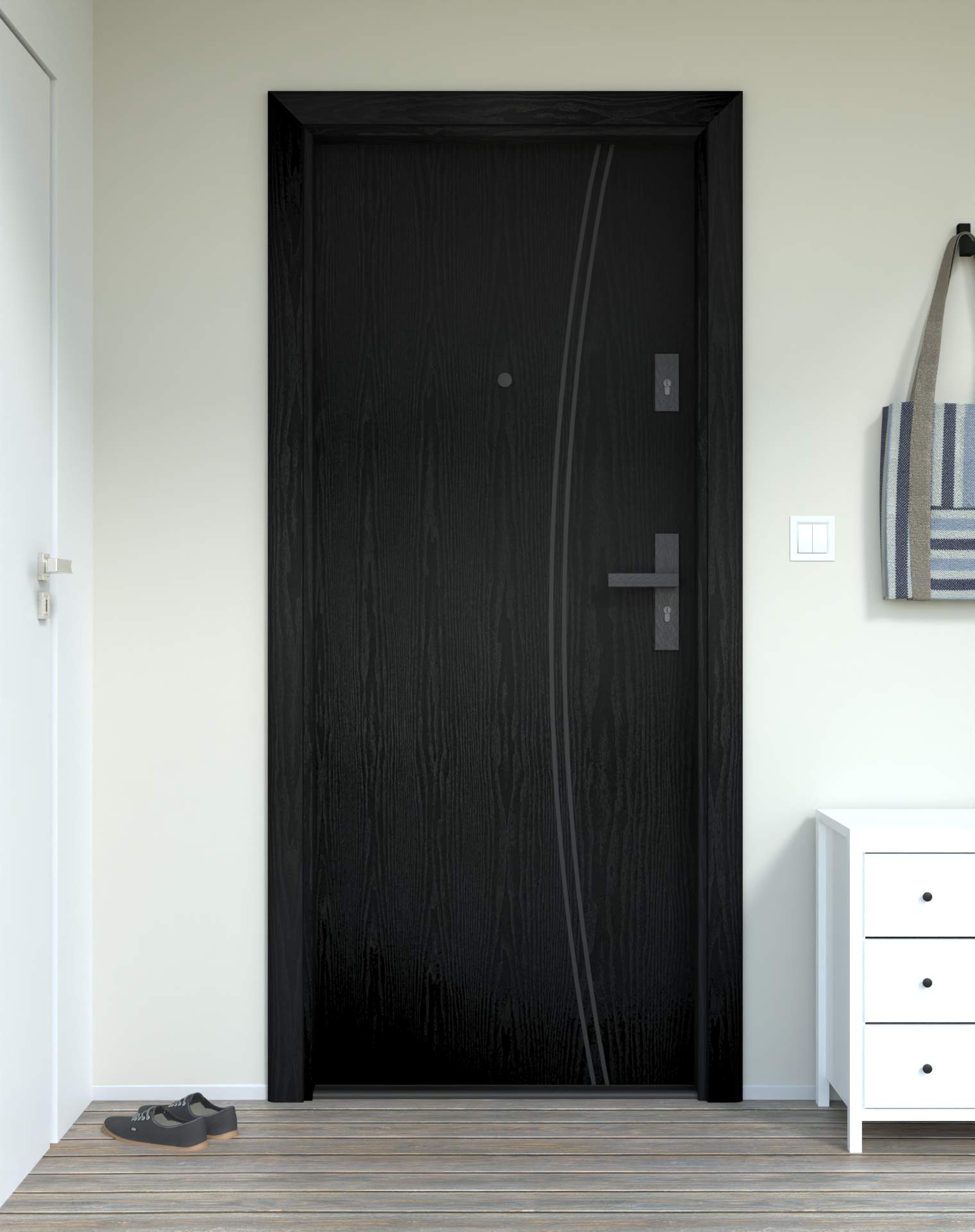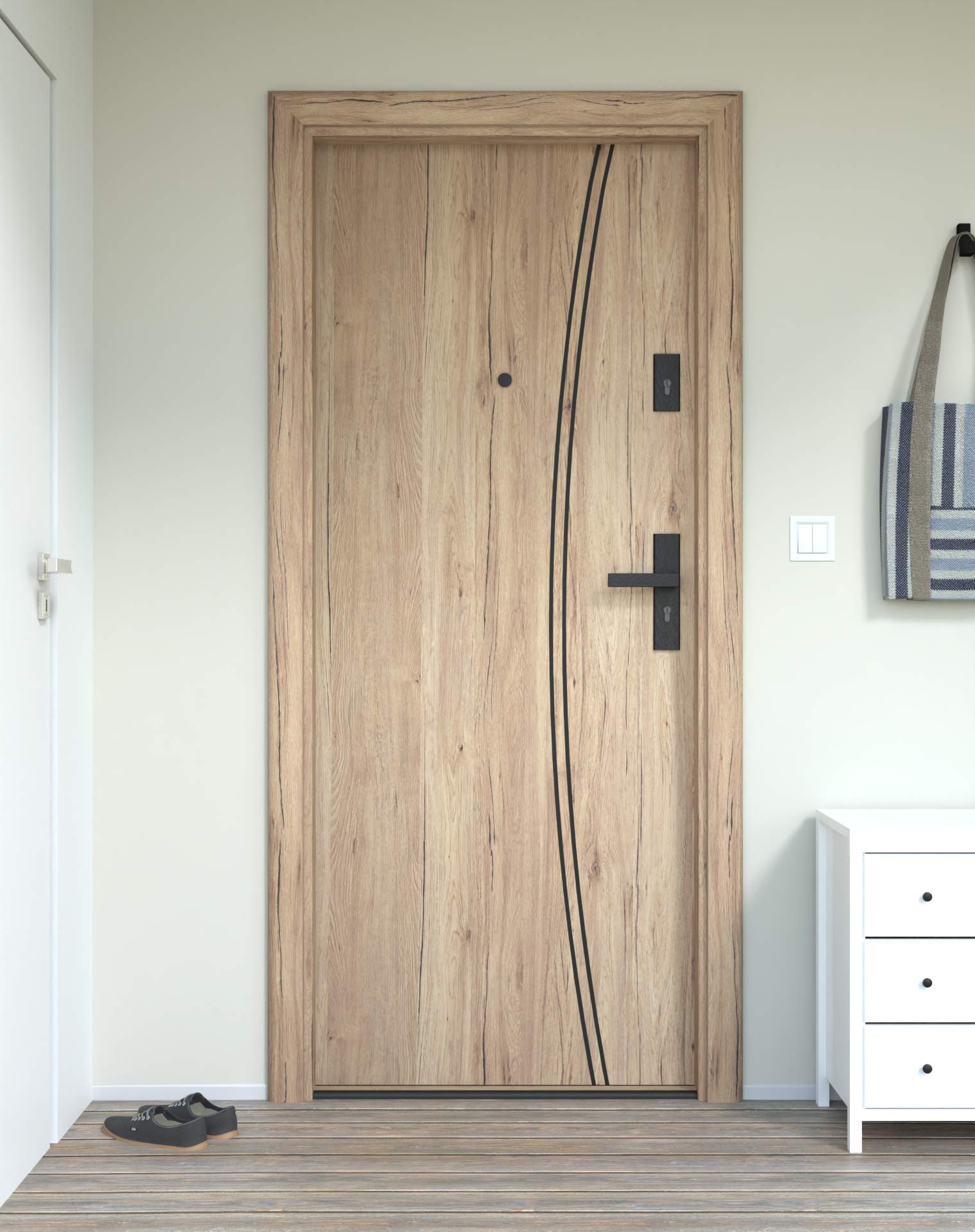 Model z aluminiowymi intrasjami o zaokrąglonym kształcie, umieszczonymi bliżej okuć, nadających drzwiom lekkości.