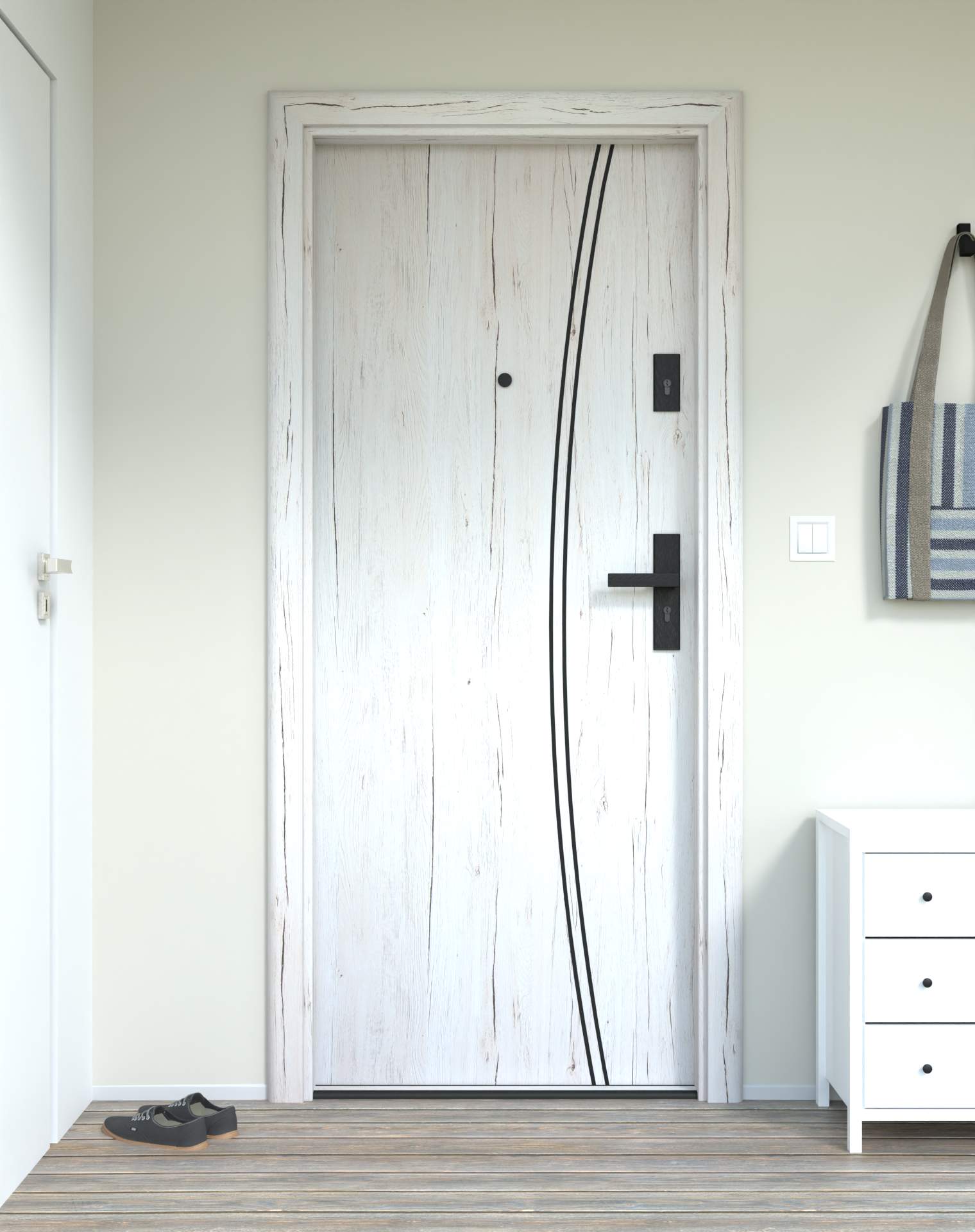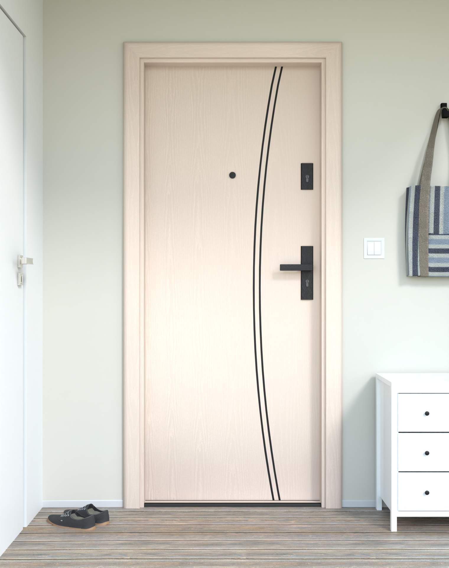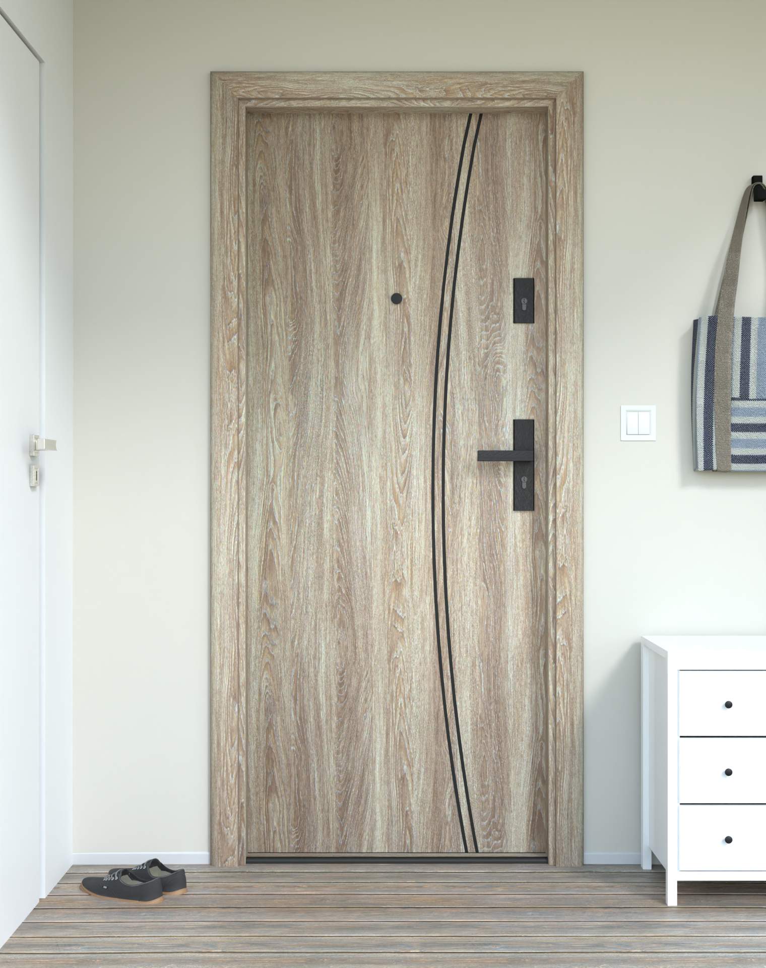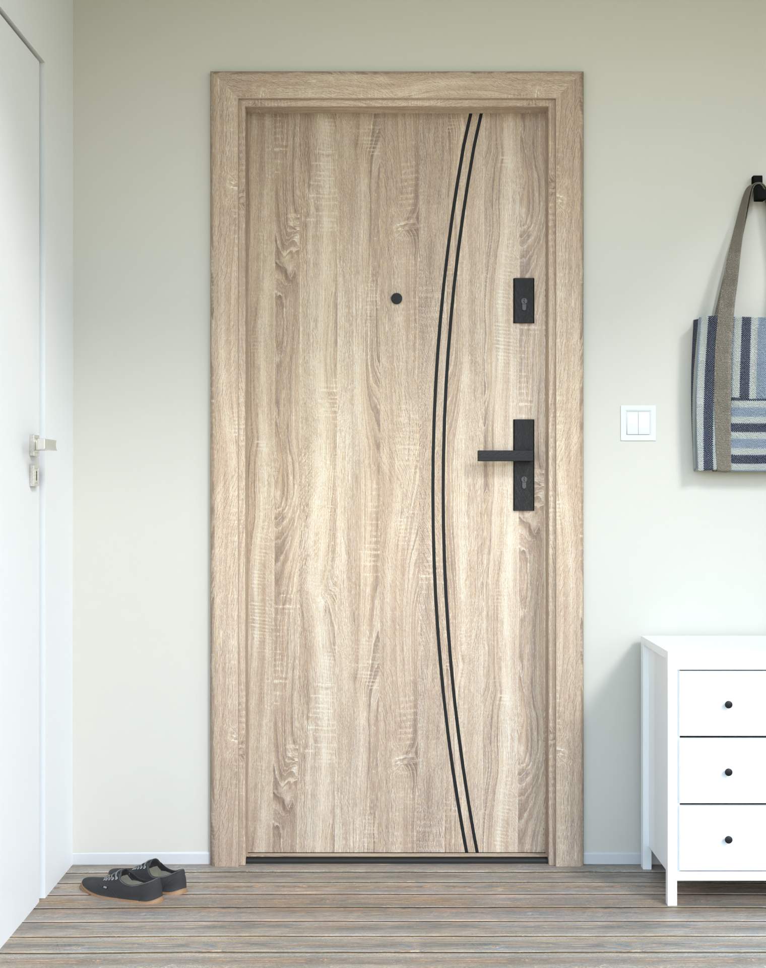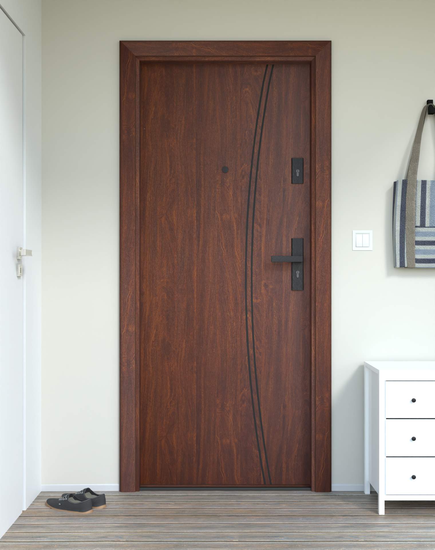 Model z aluminiowymi intrasjami o zaokrąglonym kształcie, umieszczonymi bliżej okuć, nadających drzwiom lekkości.