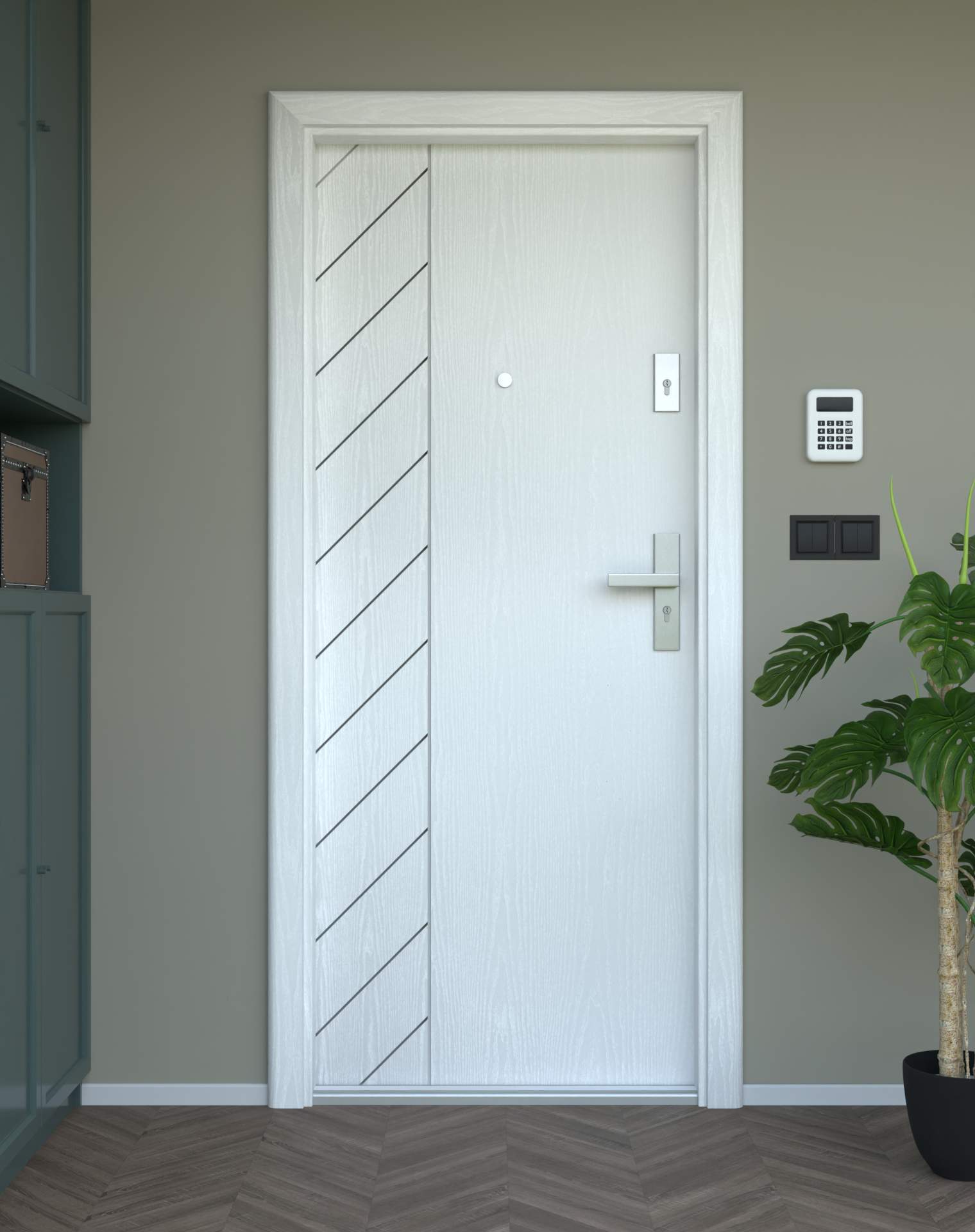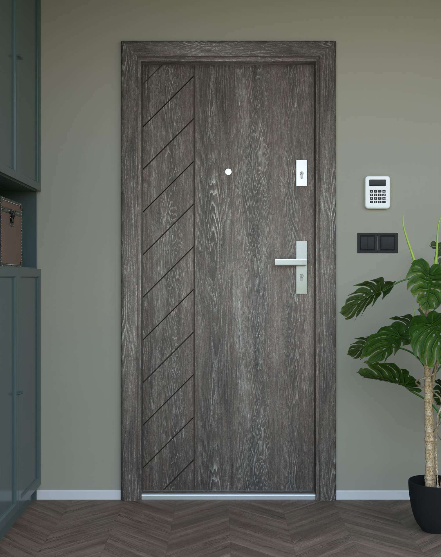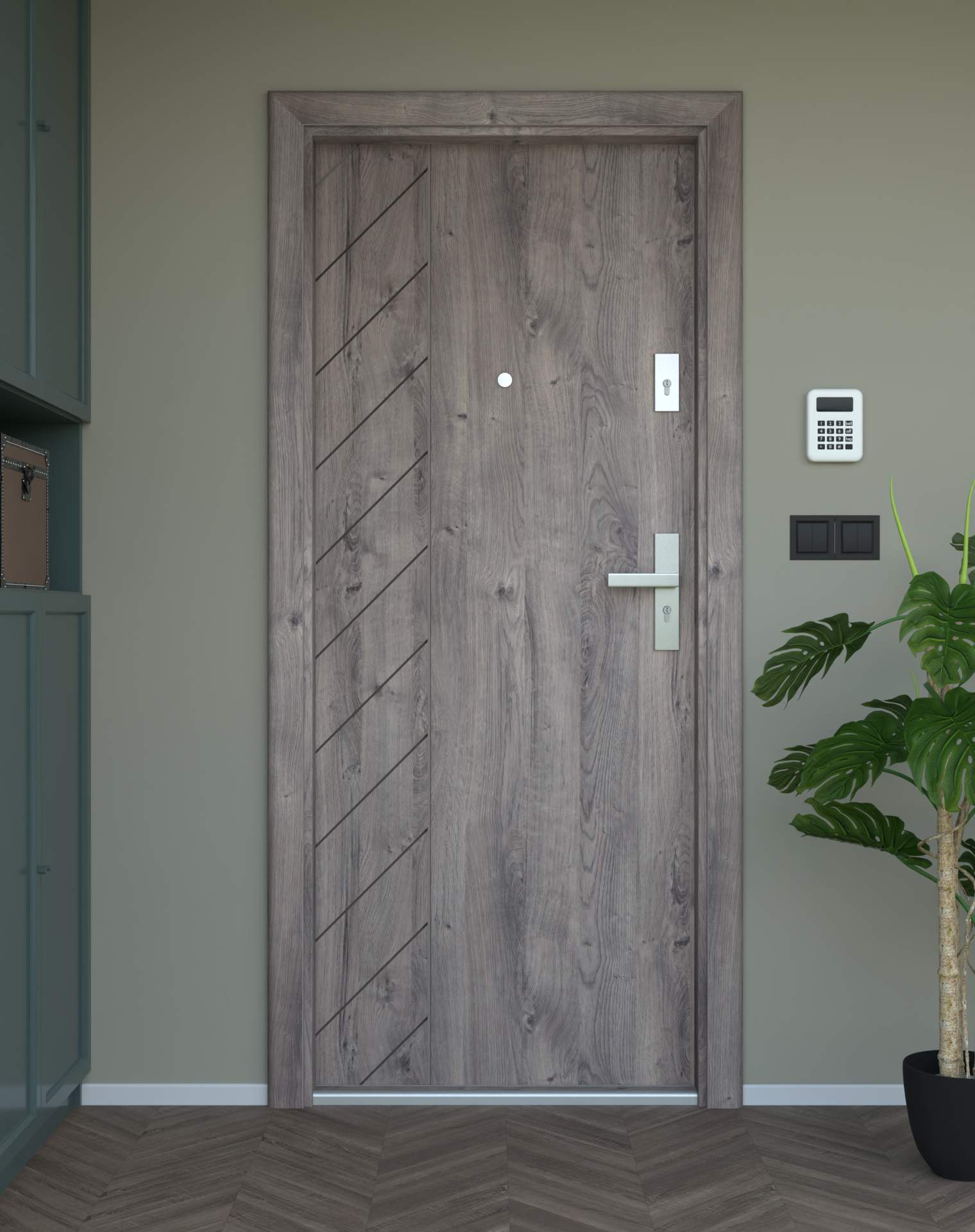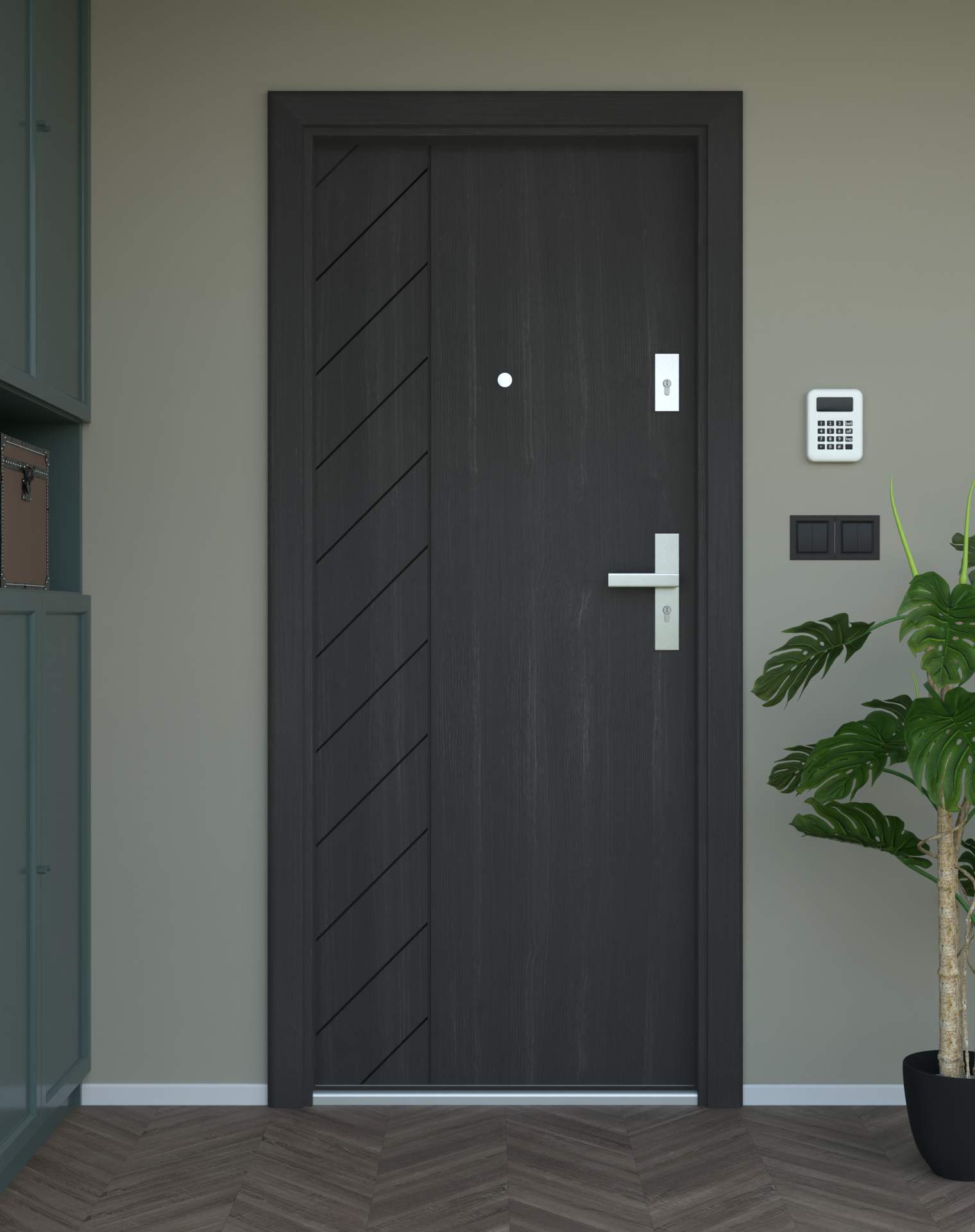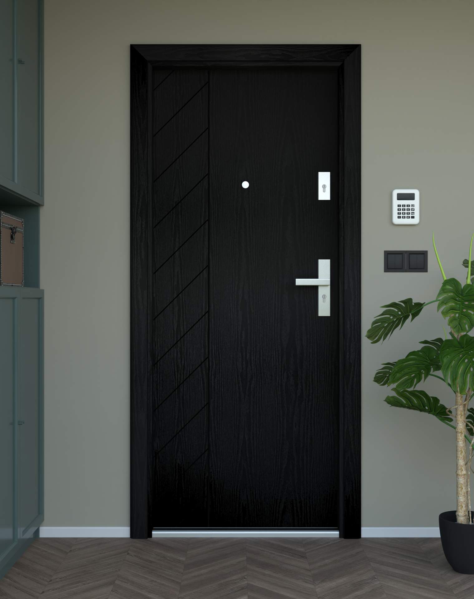 Okucia antywłamaniowe z anodowanego aluminium, odporne na zarysowania i próby włamania, zgodne z normą RC2. Komplet obejmuje rozwiązania konstrukcyjne zwiększające ochronę drzwi wejściowych.