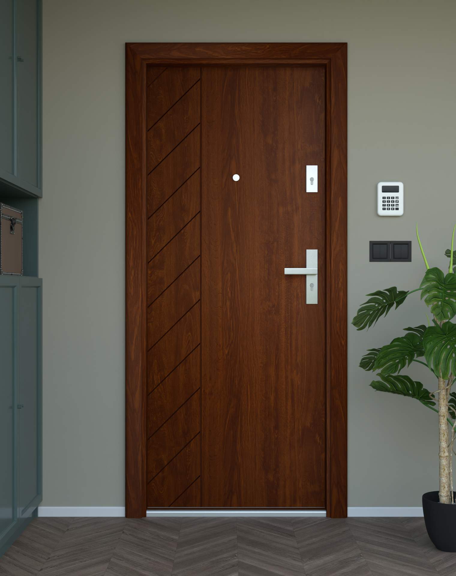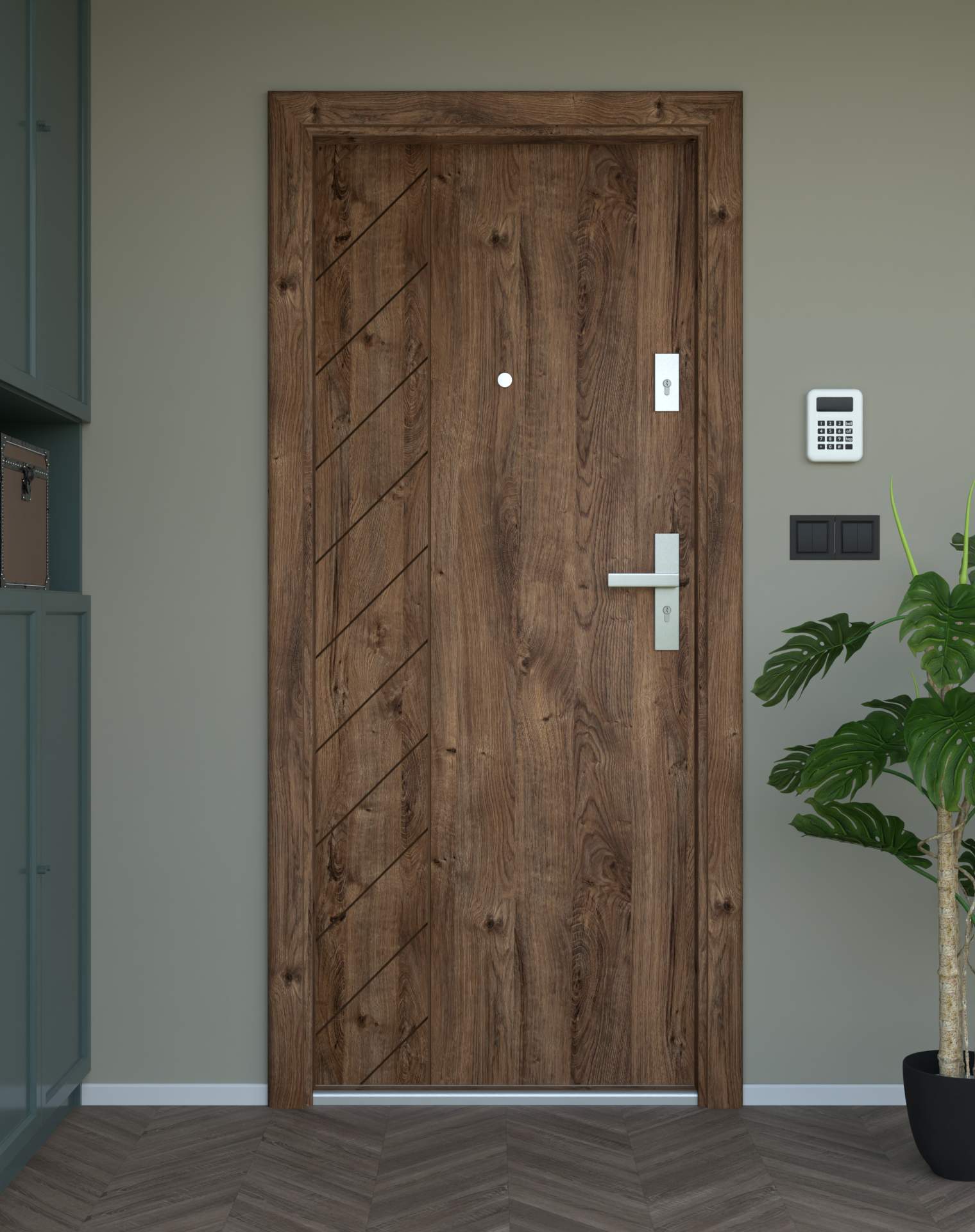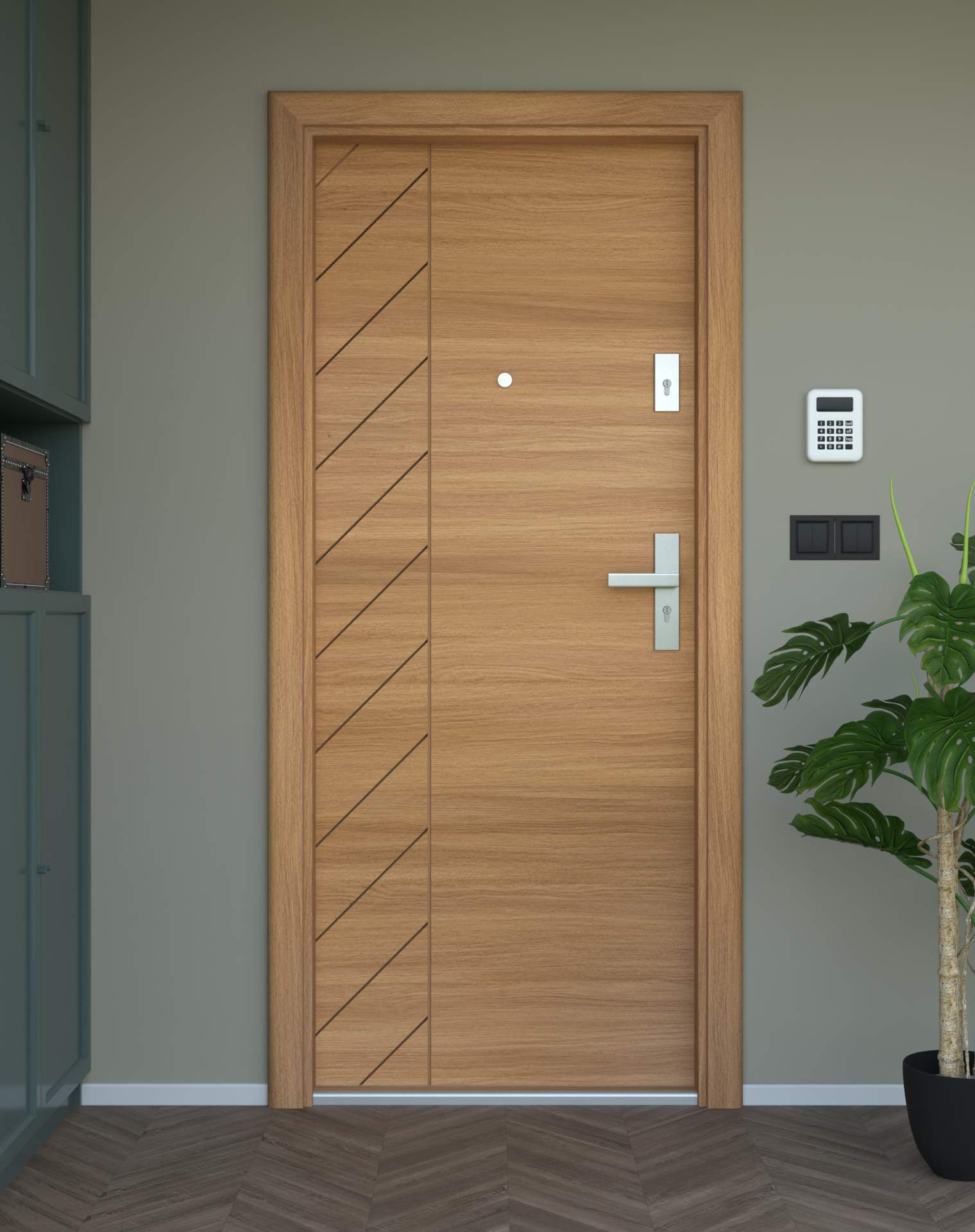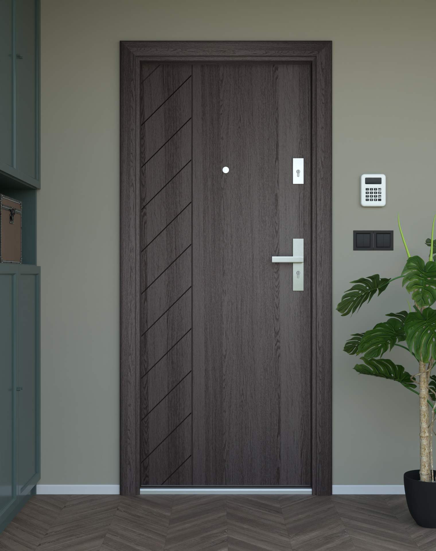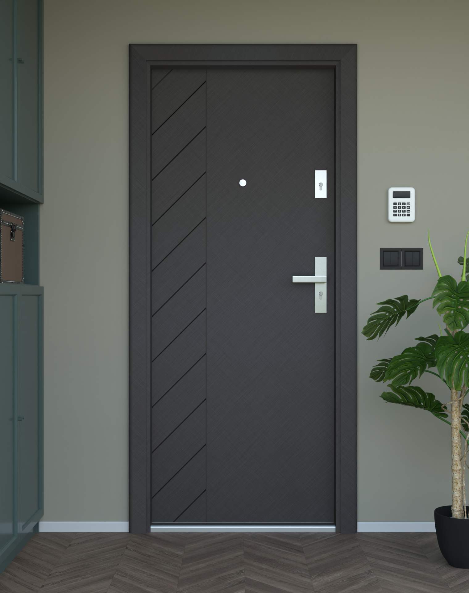 Okucia antywłamaniowe z anodowanego aluminium, odporne na zarysowania i próby włamania, zgodne z normą RC2. Komplet obejmuje rozwiązania konstrukcyjne zwiększające ochronę drzwi wejściowych.