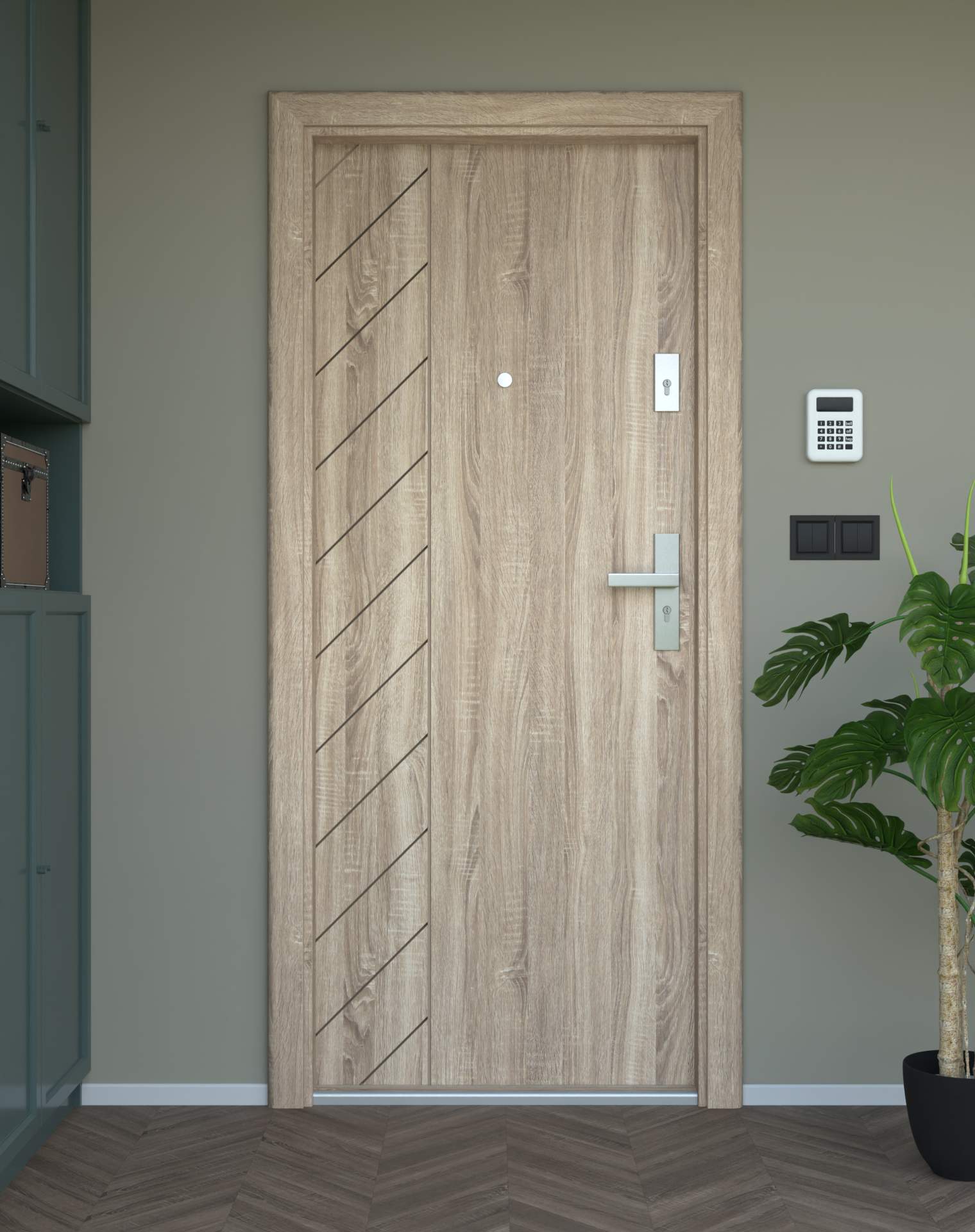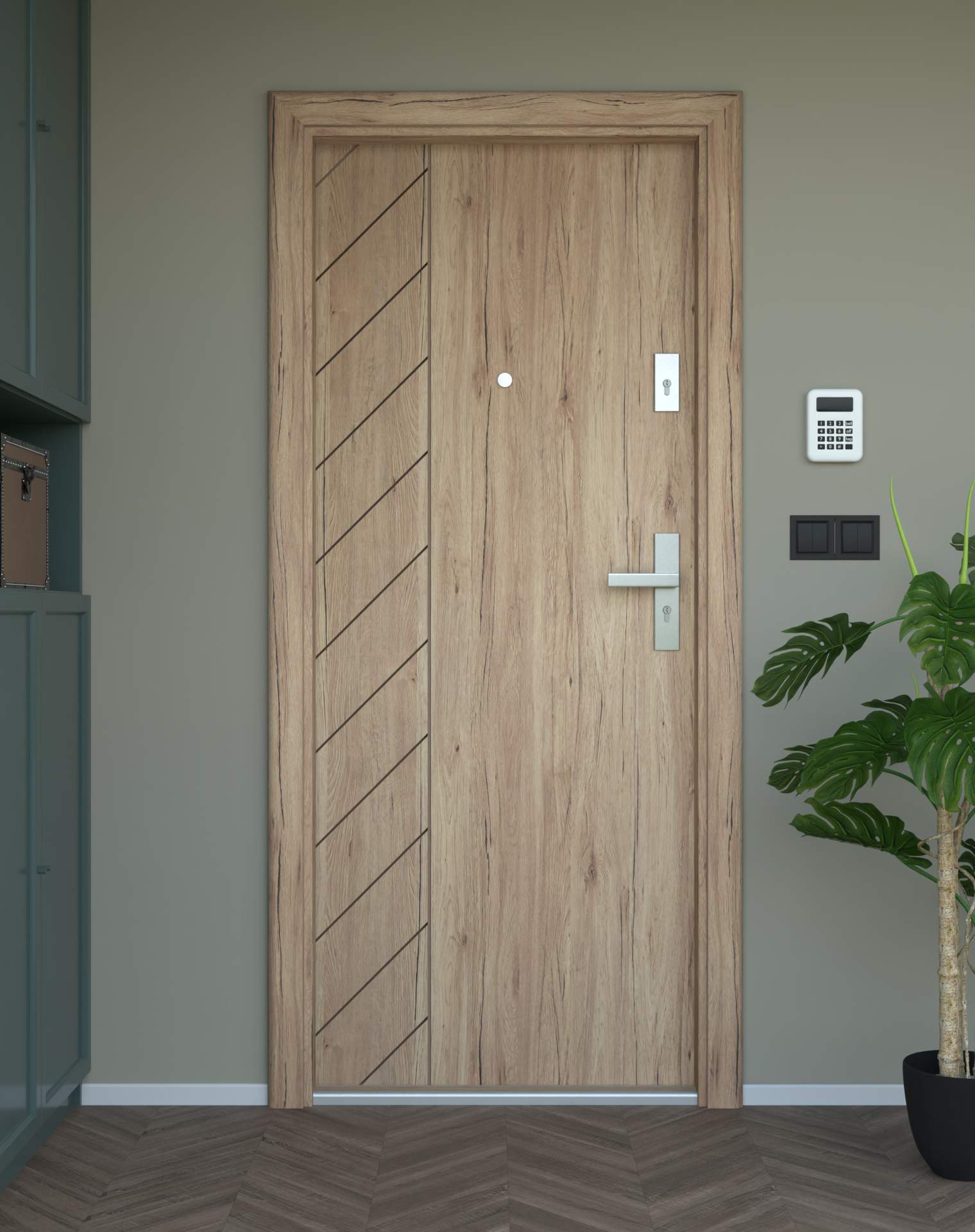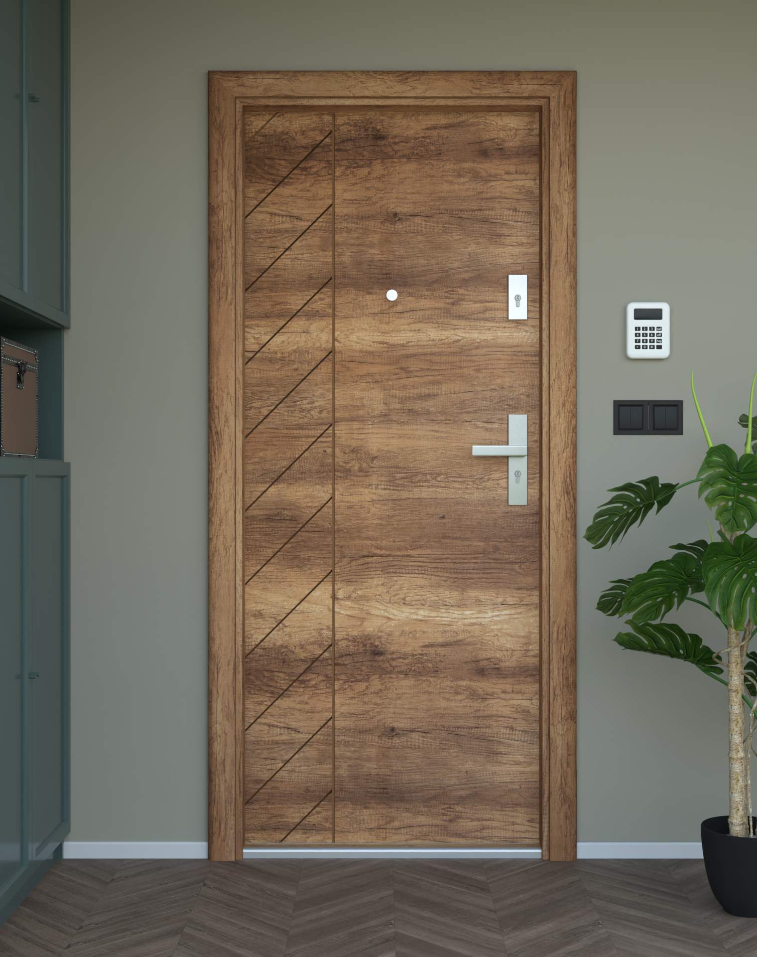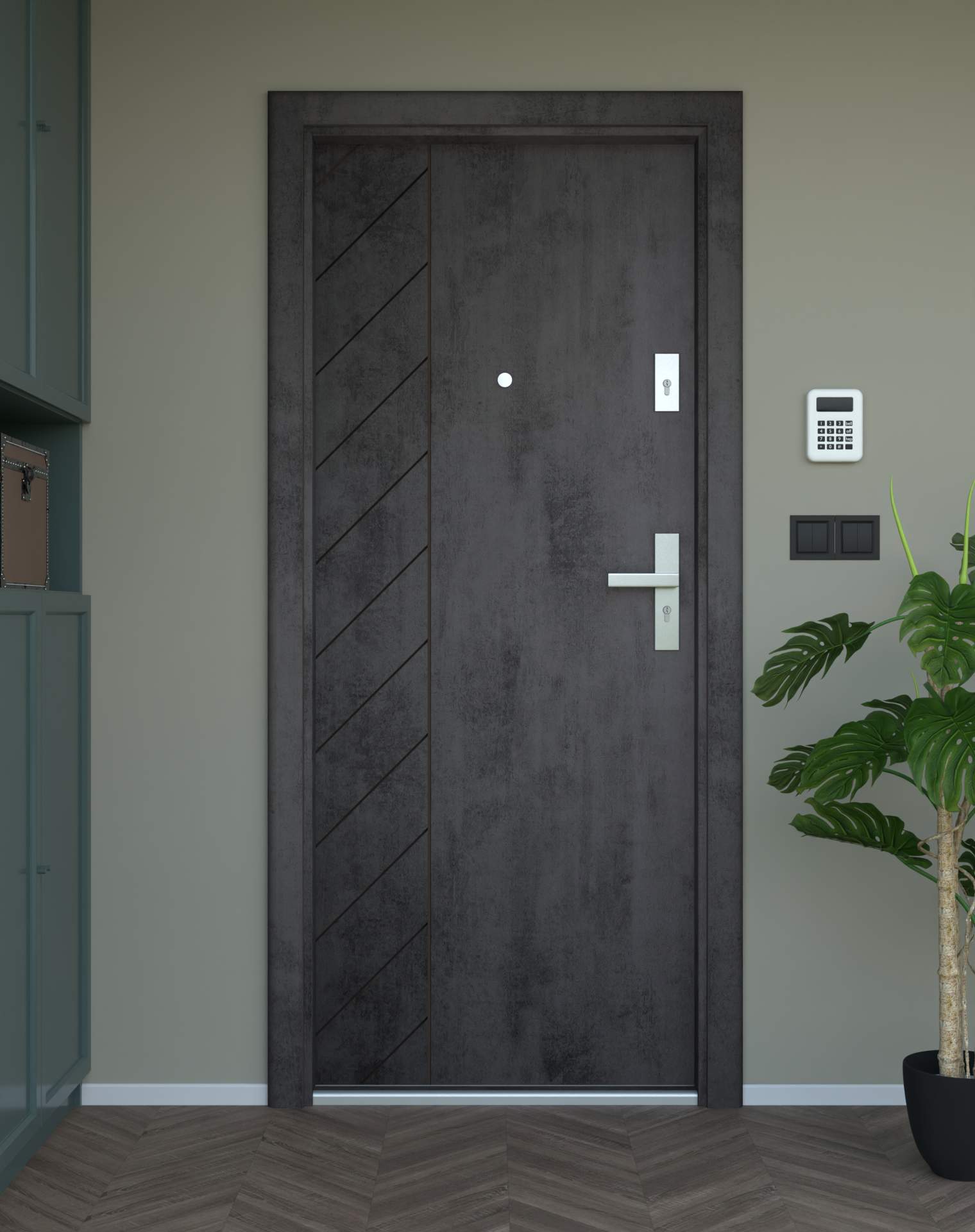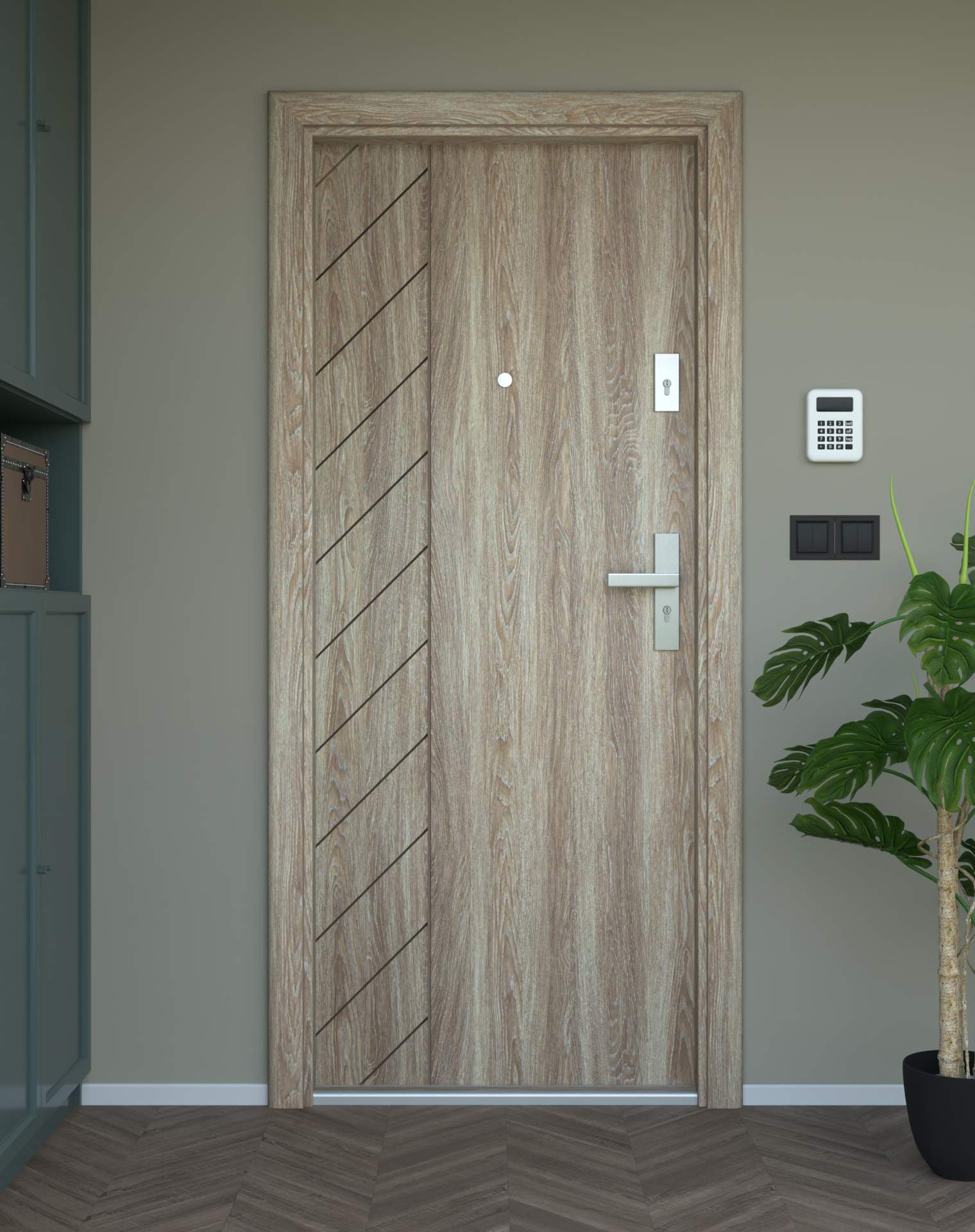 Okucia antywłamaniowe z anodowanego aluminium, odporne na zarysowania i próby włamania, zgodne z normą RC2. Komplet obejmuje rozwiązania konstrukcyjne zwiększające ochronę drzwi wejściowych.