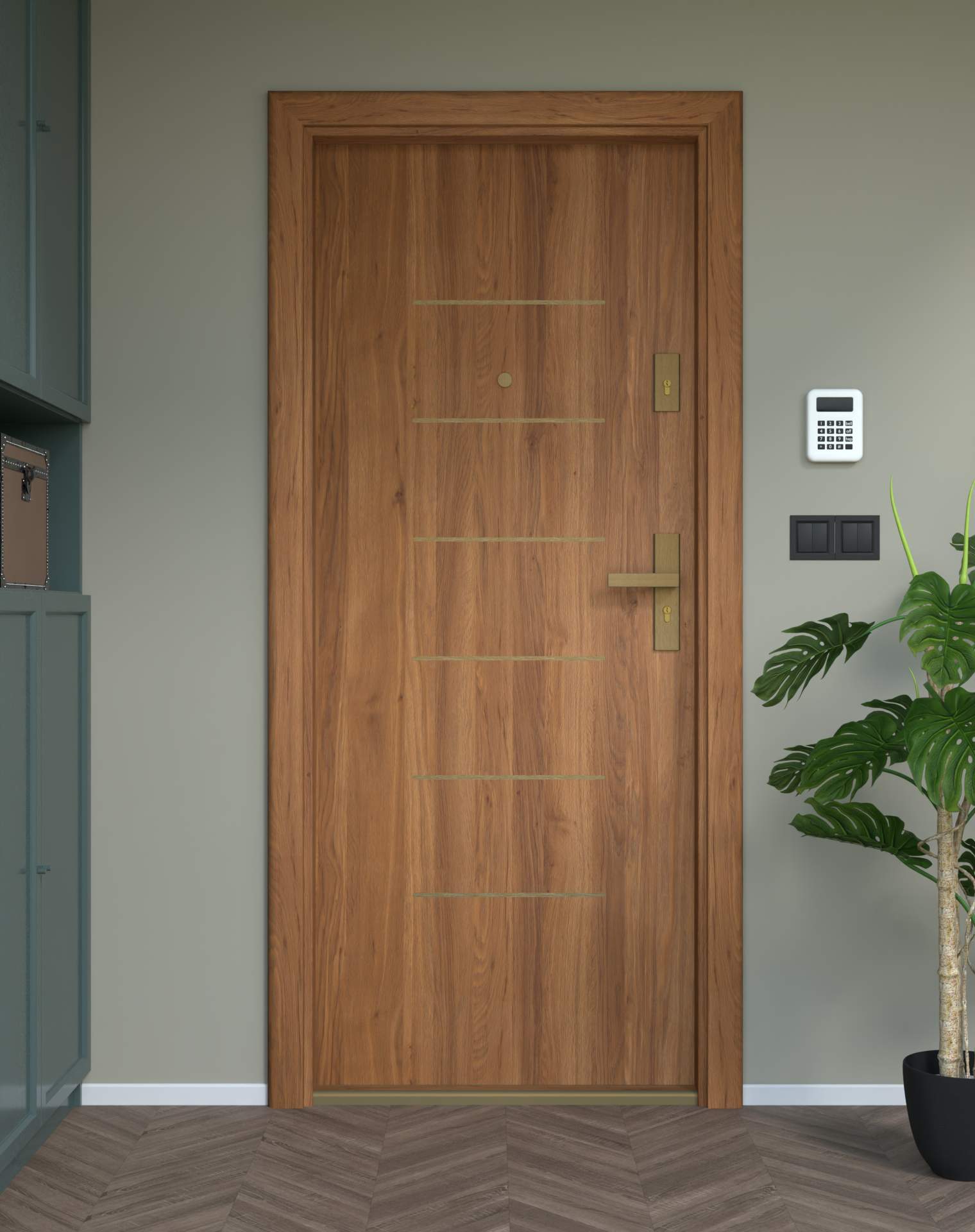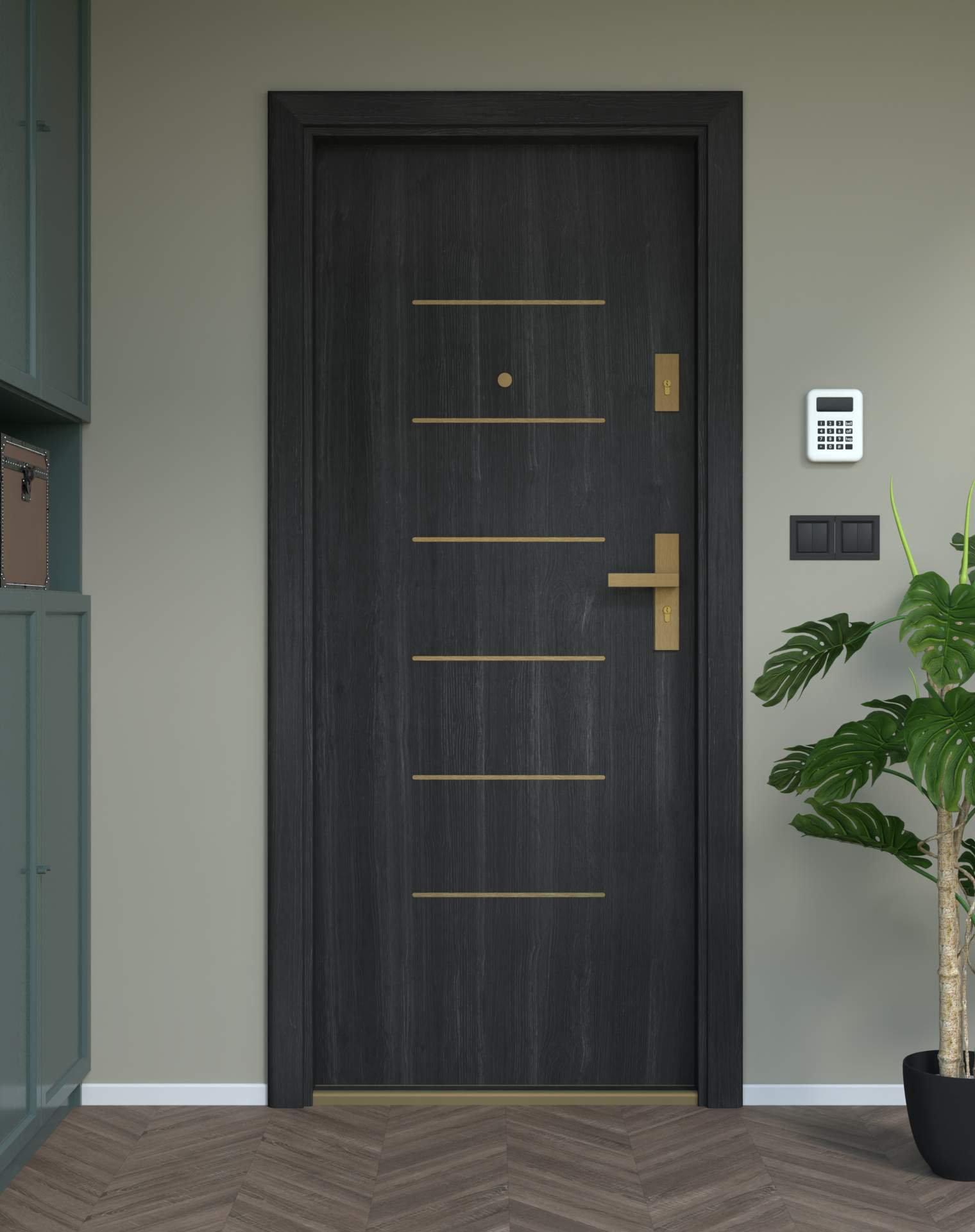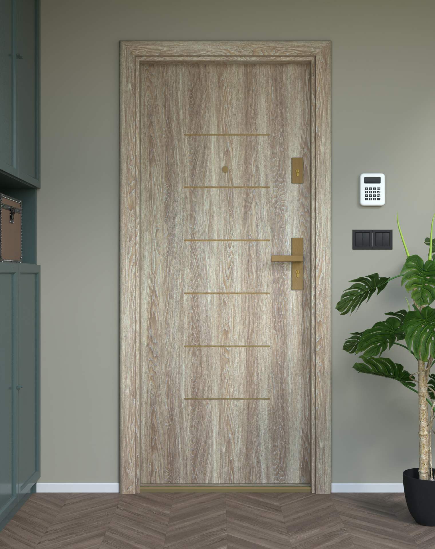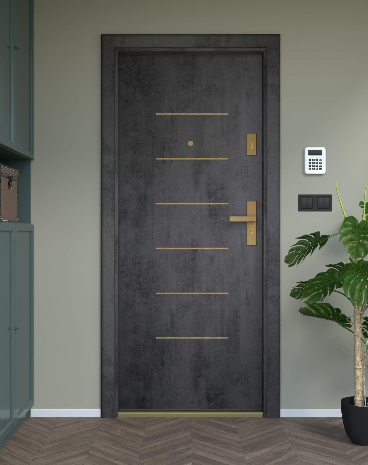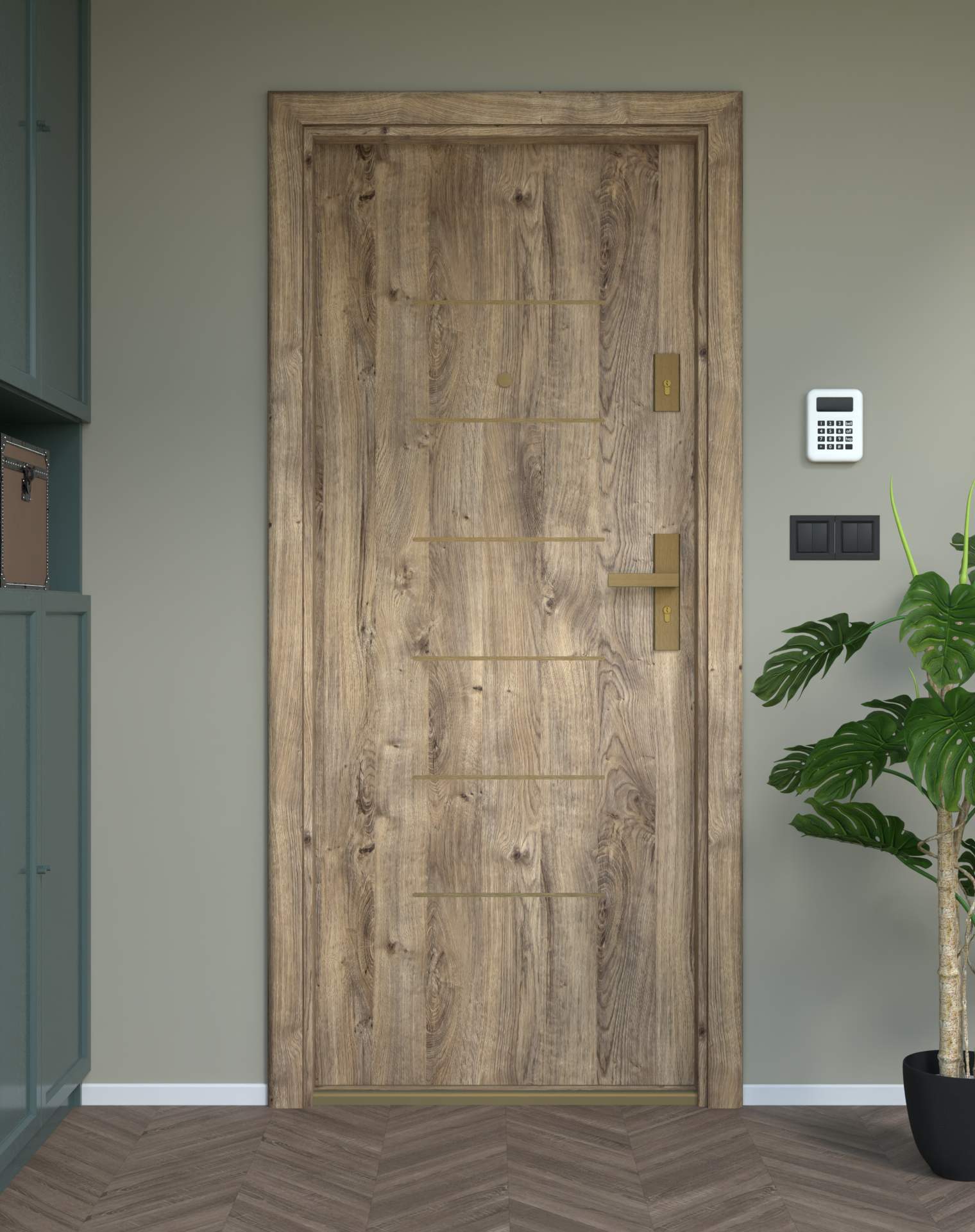 Drzwi z kolekcji Bastion Alu wyróżniają się nowoczesnym wzornictwem uzupełnionym o aluminiowe intarsje w kolorze Inox (srebrnym), rozmieszczone pionowo lub poziomo w zależności od modelu. Wstawki mogą być smukłe lub pogrubione, rozmieszczone pionowo bądź poziomo, tworząc elegancki kontrast z powierzchnią skrzydła, która może być gładka lub wzbogacona frezowaniem. Solidna konstrukcja z płytą dźwiękochłonną lub panelem wyciszającym gwarantuje trwałość i bardzo dobrą izolację akustyczną.