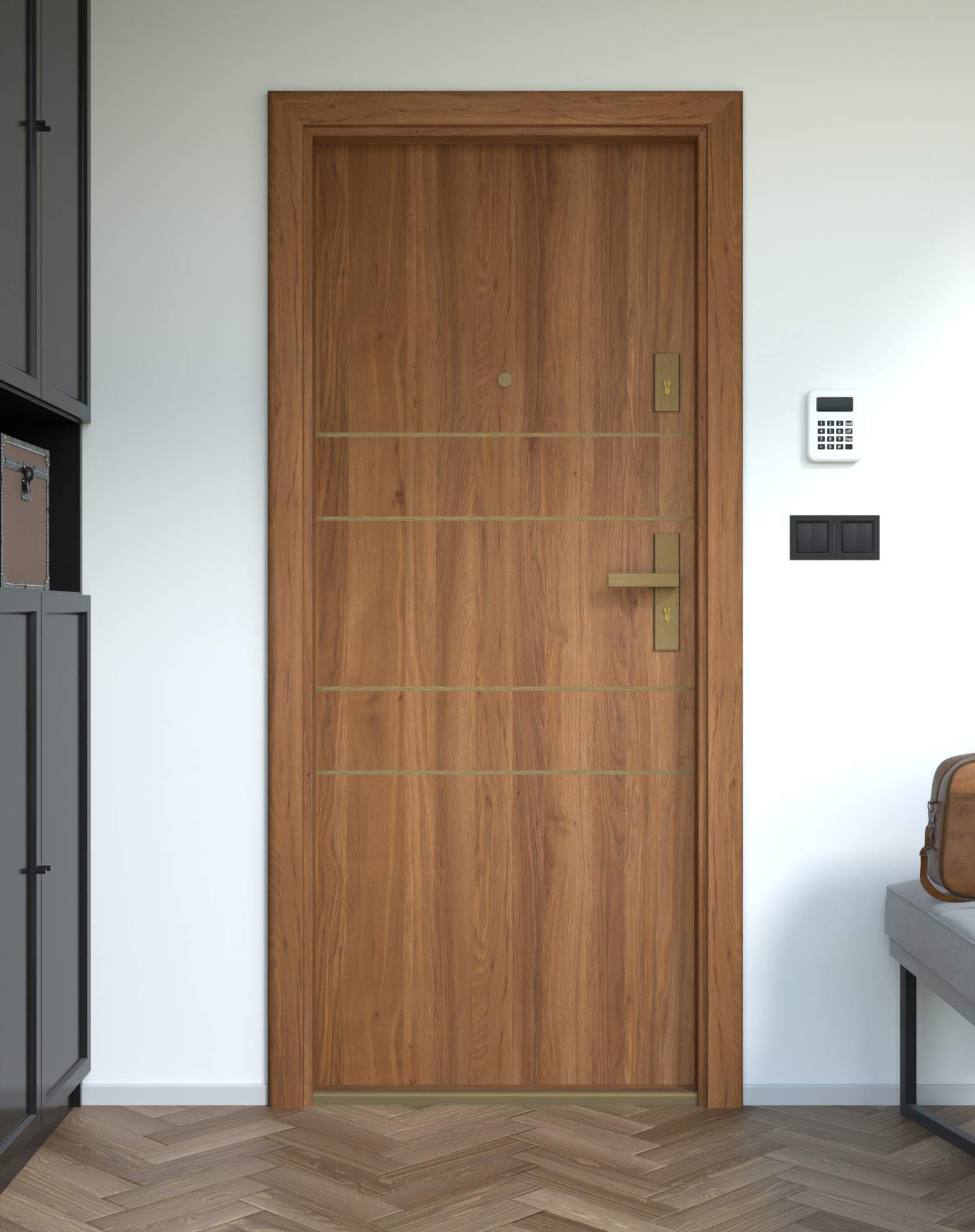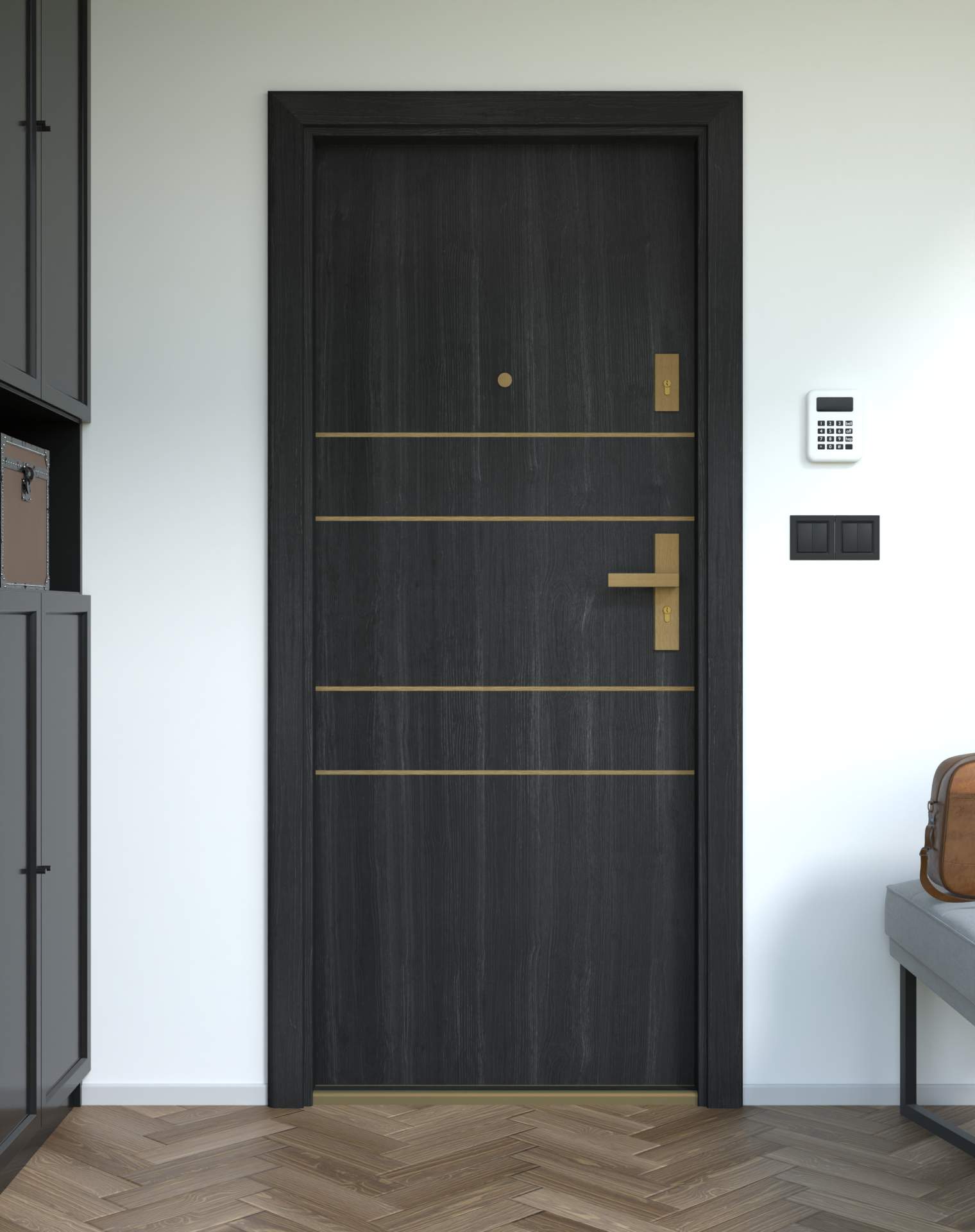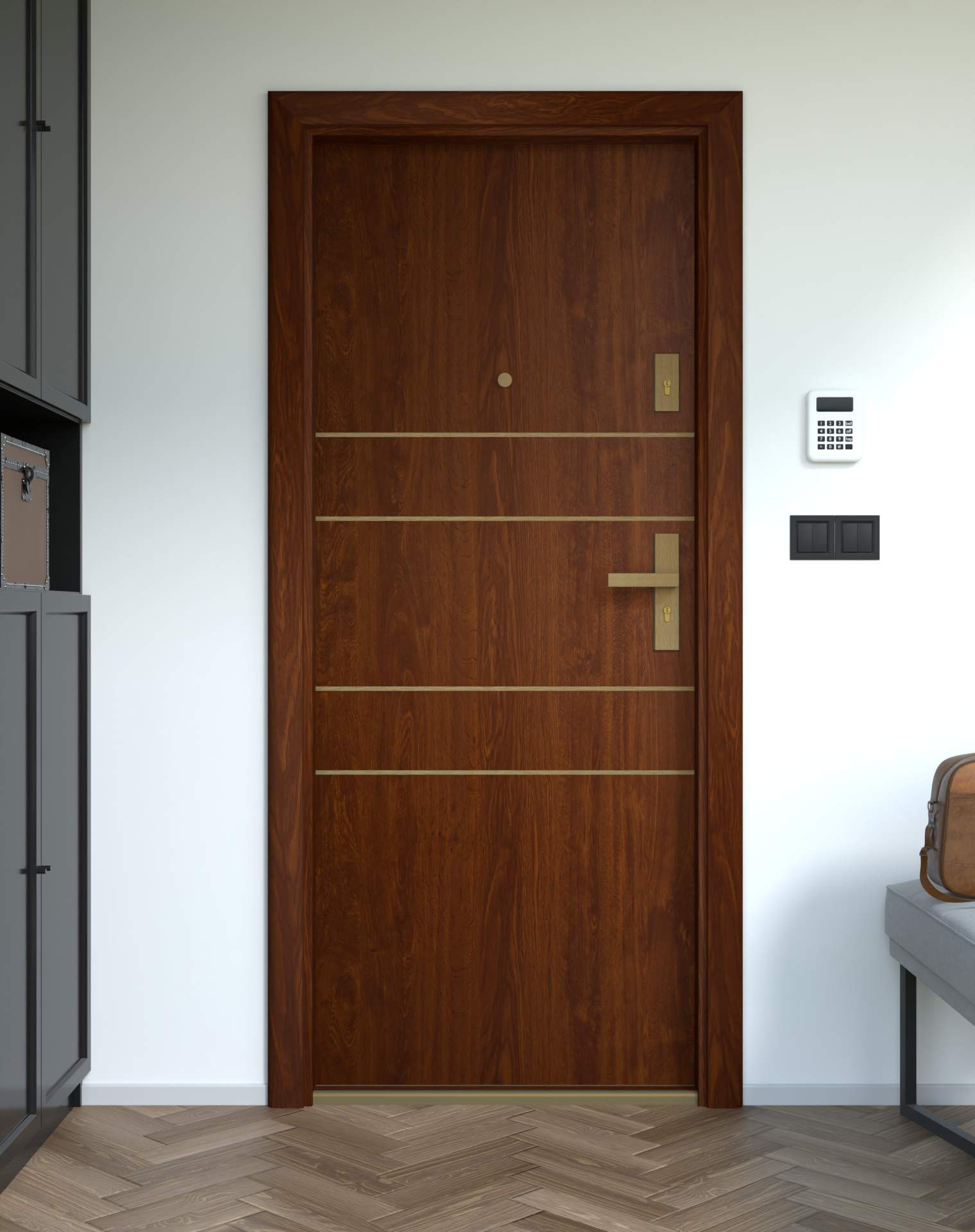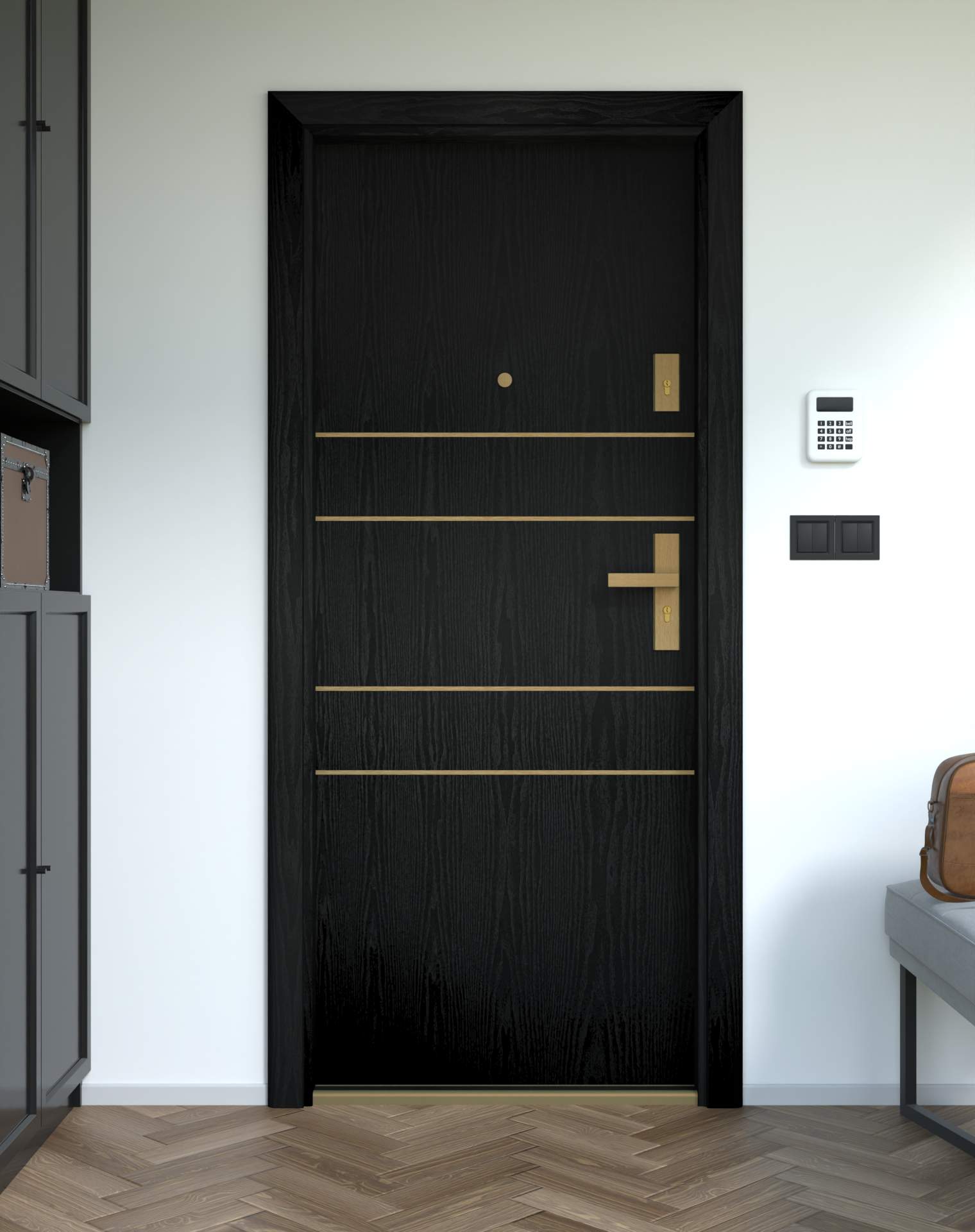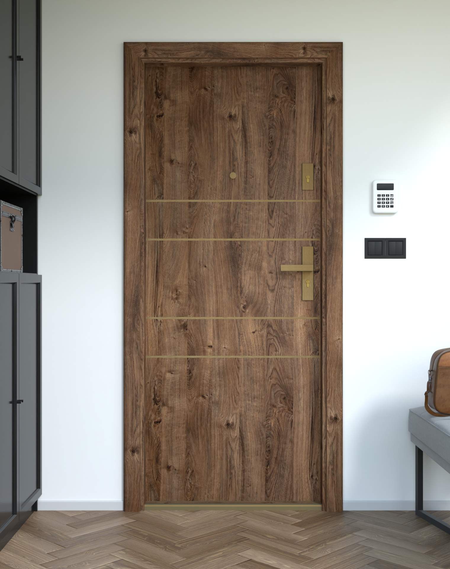 Nowoczesne drzwi wejściowe z poziomymi intarsjami z aluminium w kolorze starego złota.