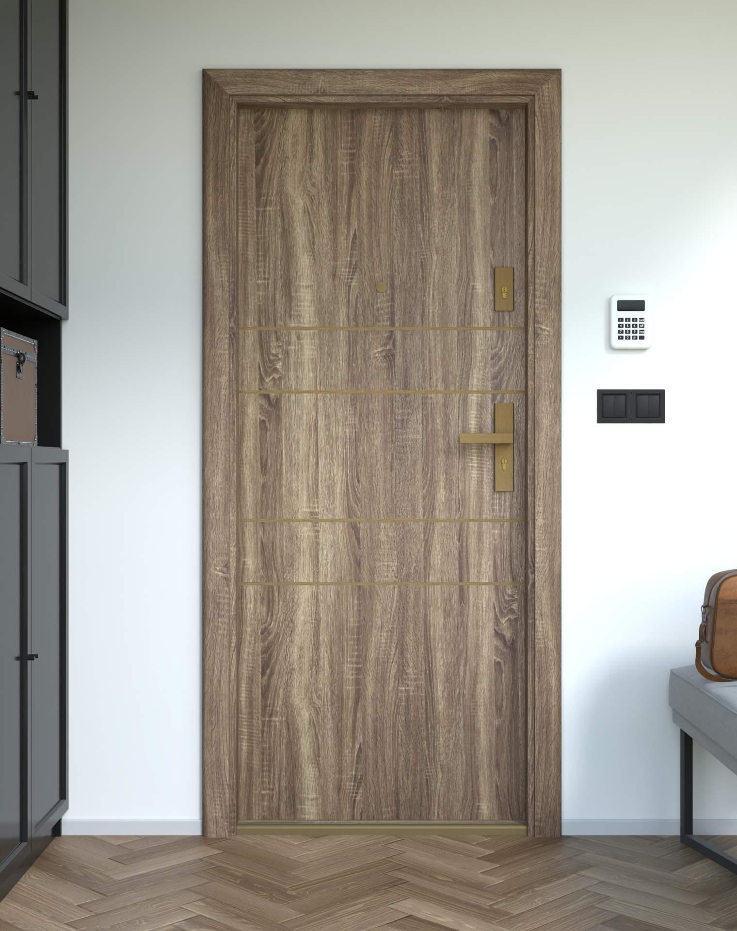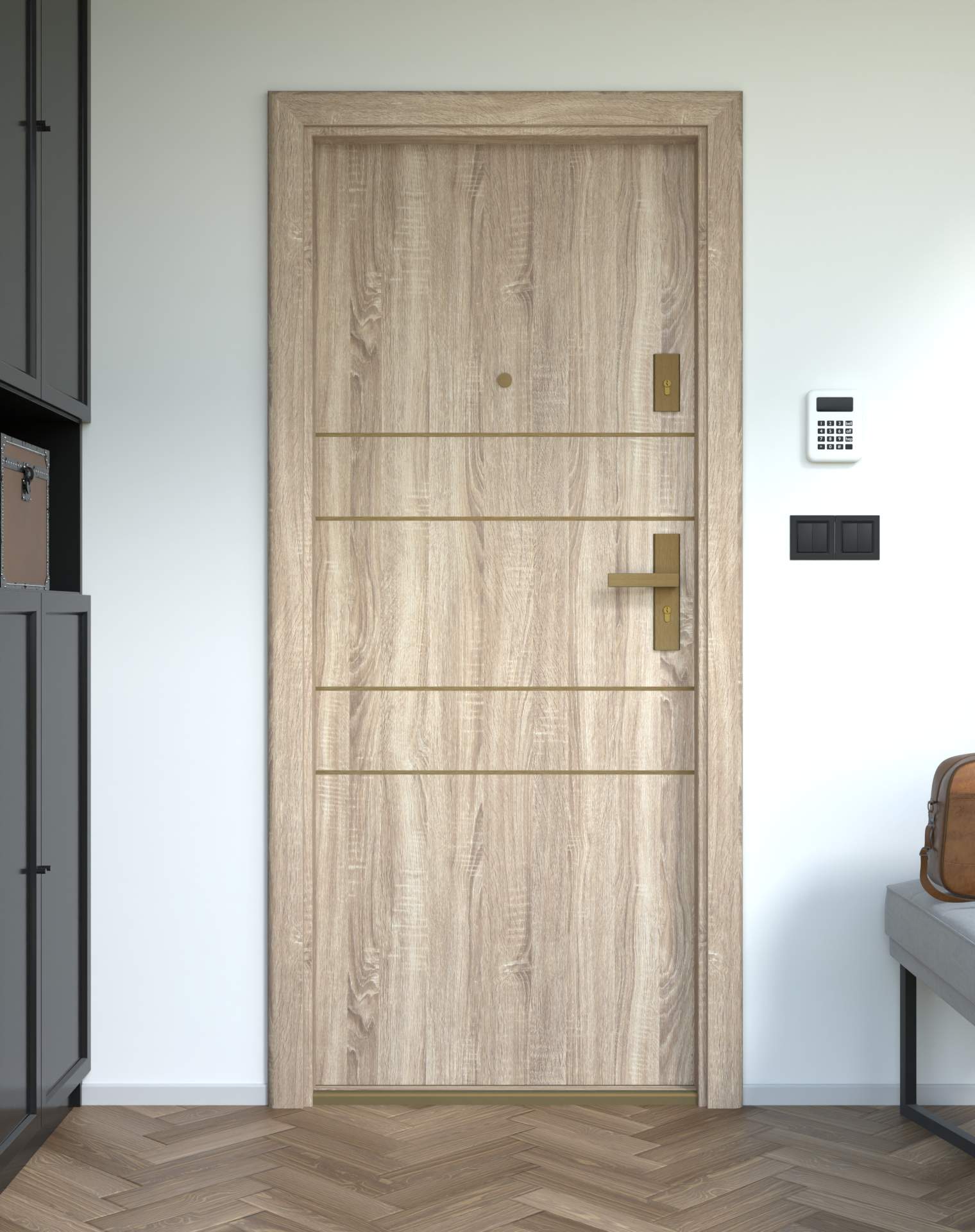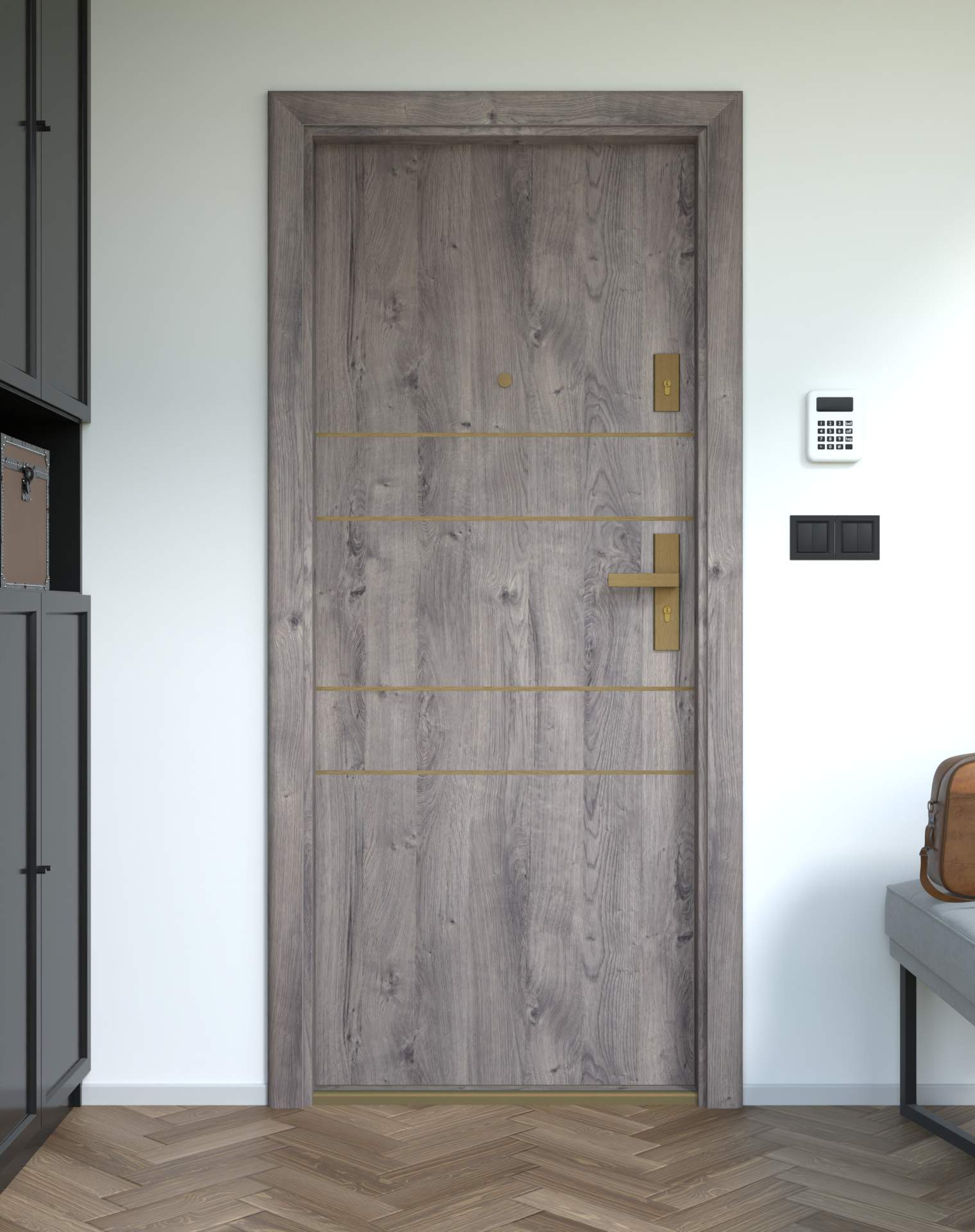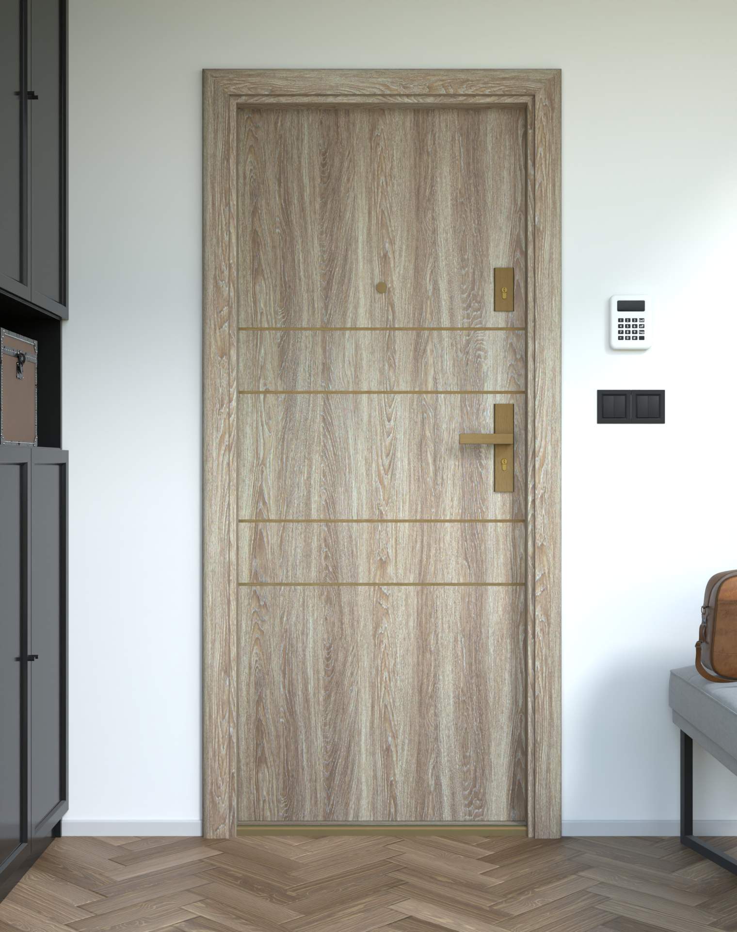 Nowoczesne drzwi wejściowe z poziomymi intarsjami z aluminium w kolorze starego złota.