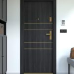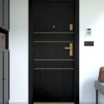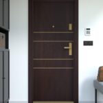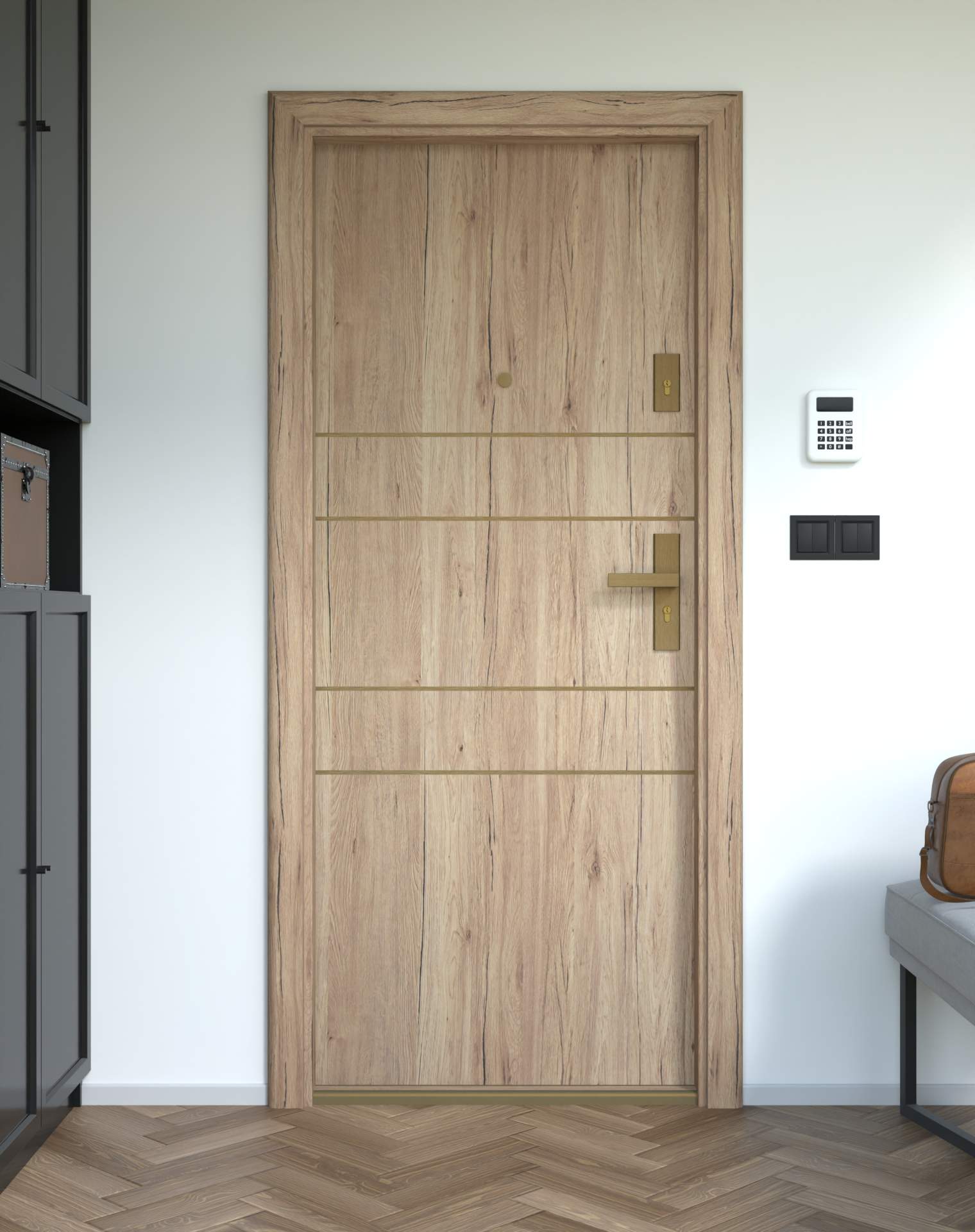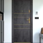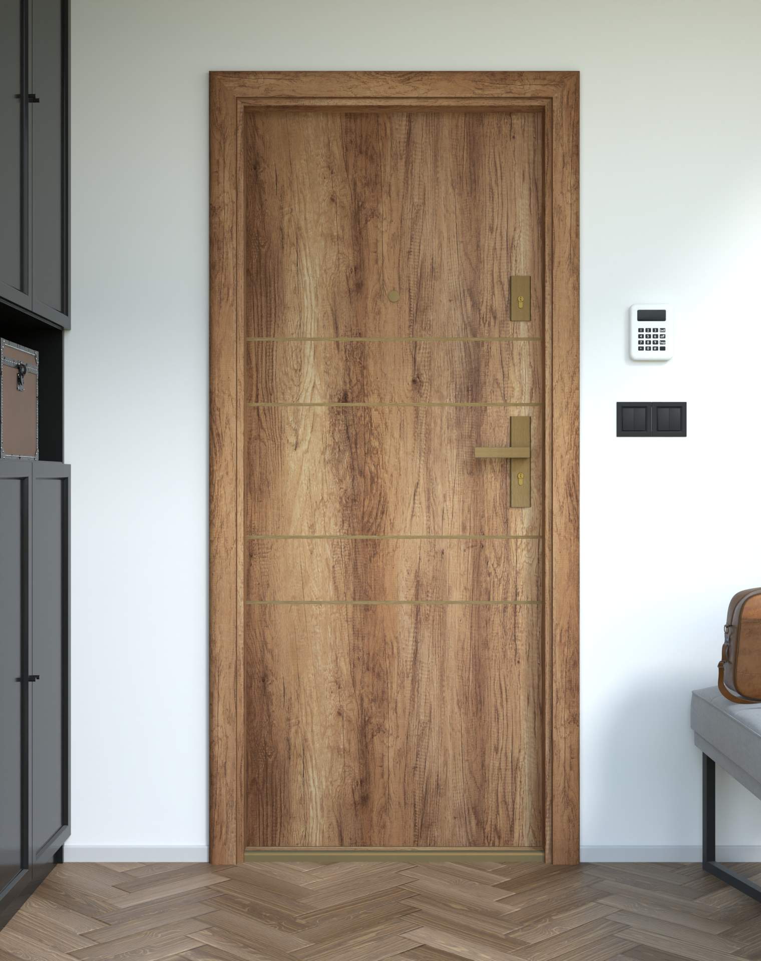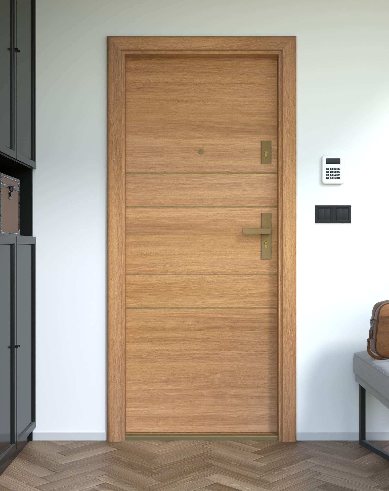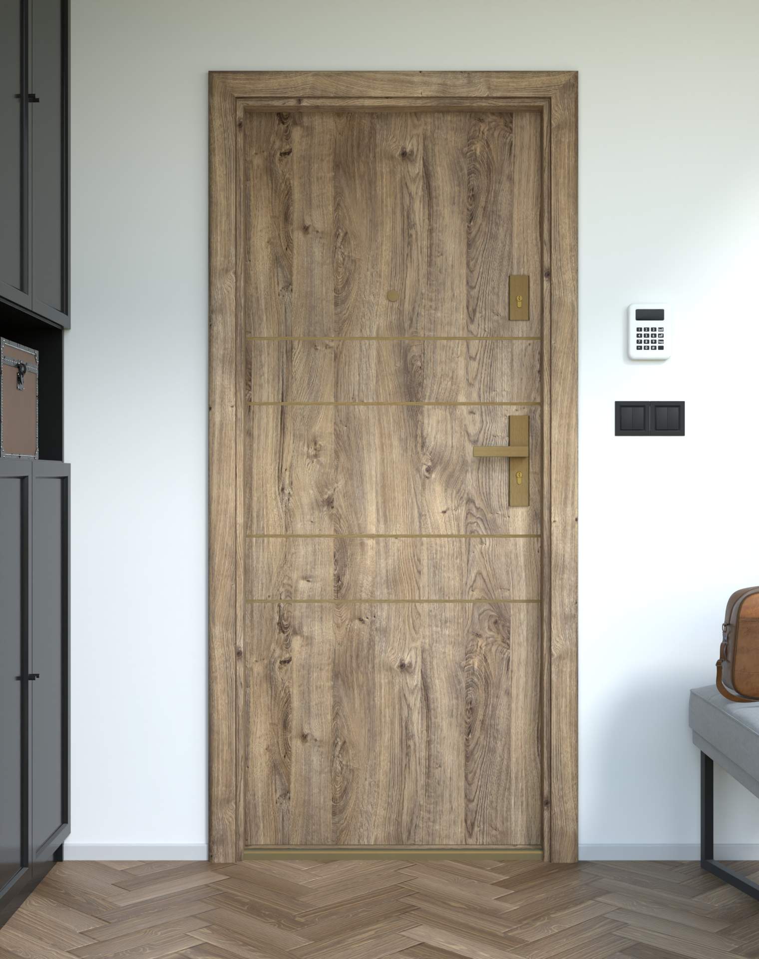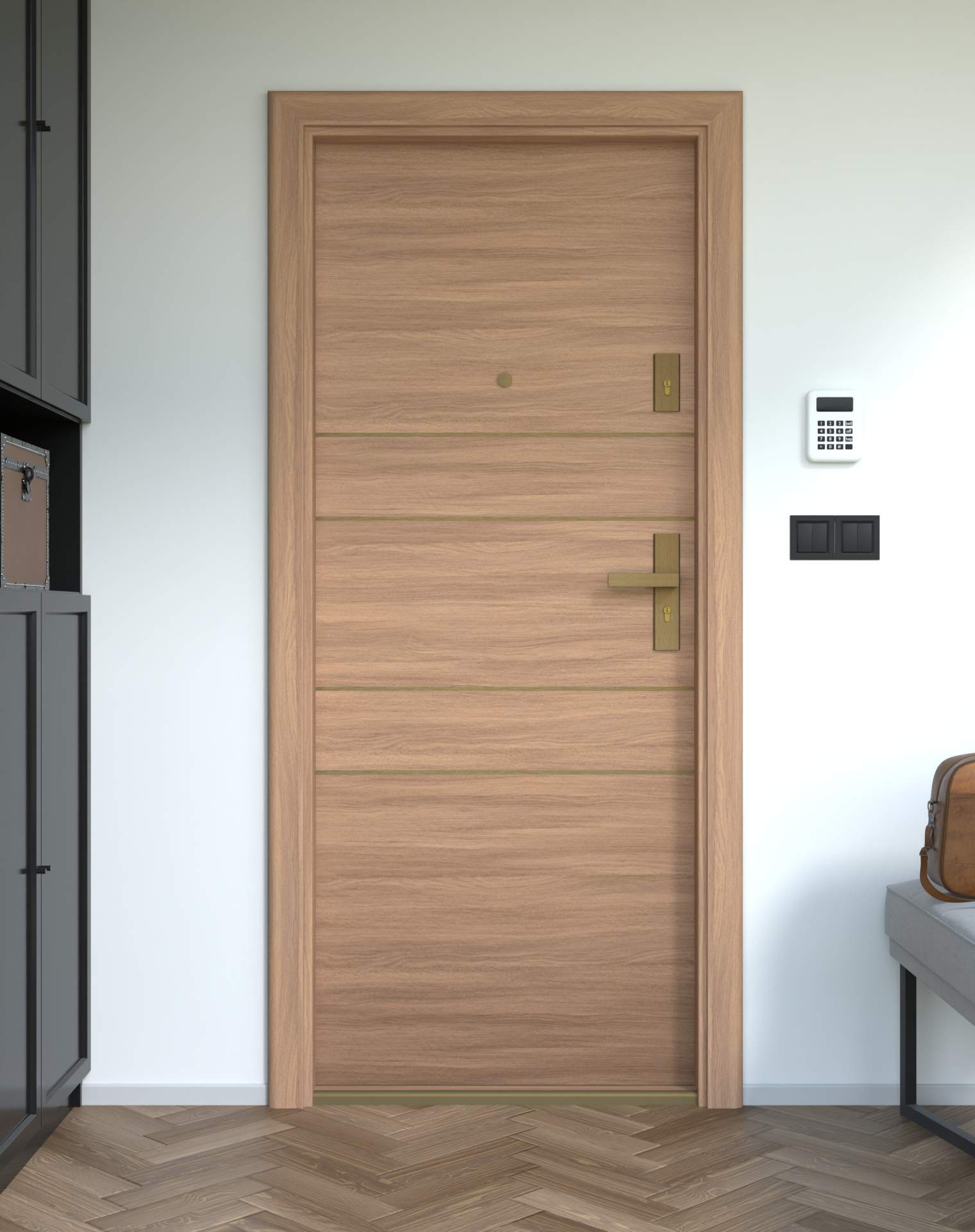 Nowoczesne drzwi wejściowe z poziomymi intarsjami z aluminium w kolorze starego złota.