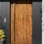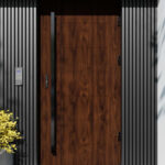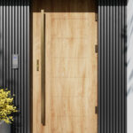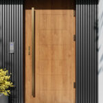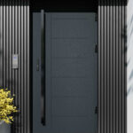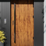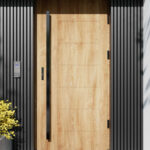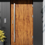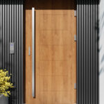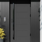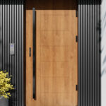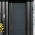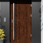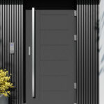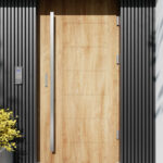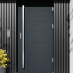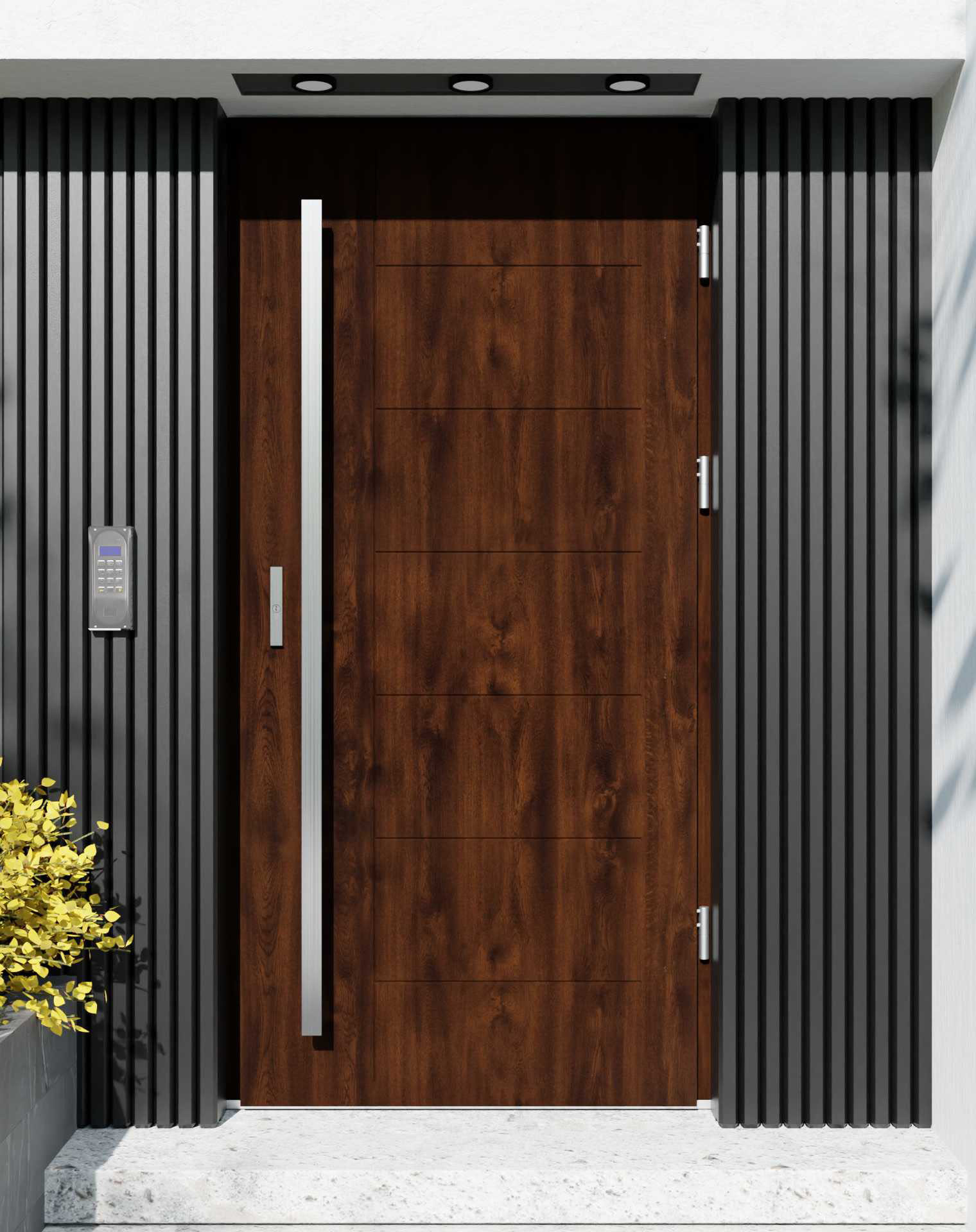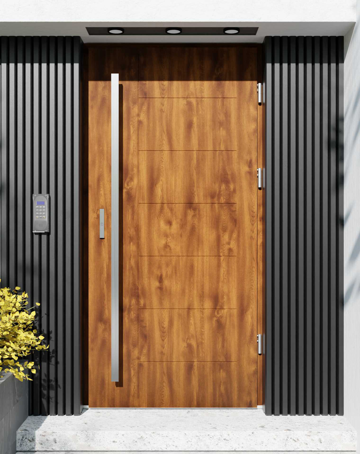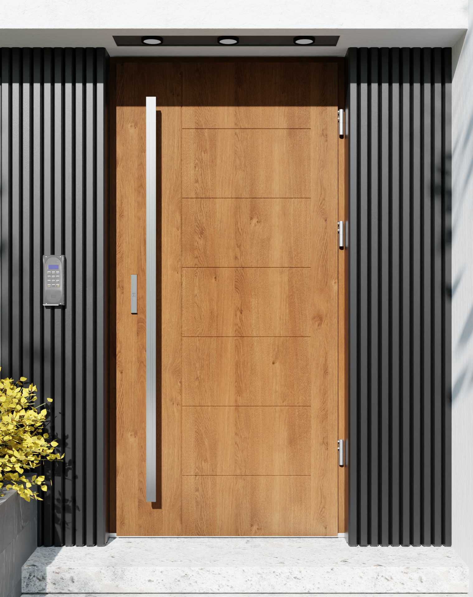 Nowoczesne drzwi zewnętrzne z pełnym skrzydłem i subtelnymi tłoczeniami, które nadają konstrukcji elegancki wygląd.