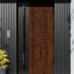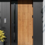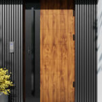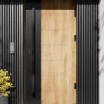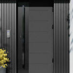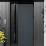 Nowoczesne drzwi zewnętrzne z tłoczeniami oraz panelem z aluminium malowanym proszkowo na kolor czarnego matu, stanowiącym główny efekt wizualny drzwi.