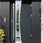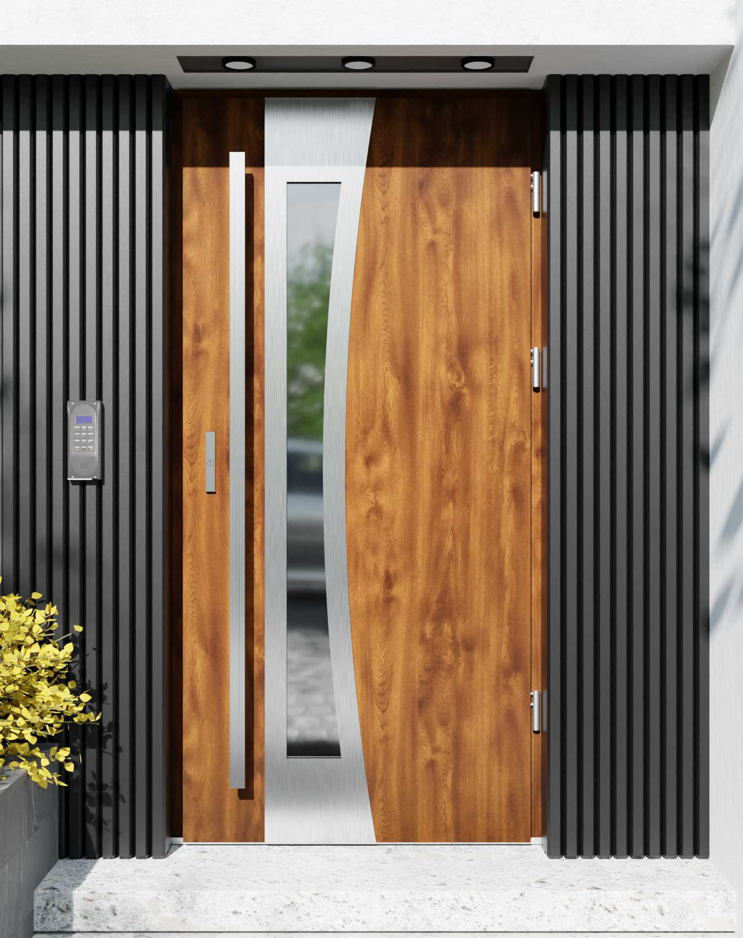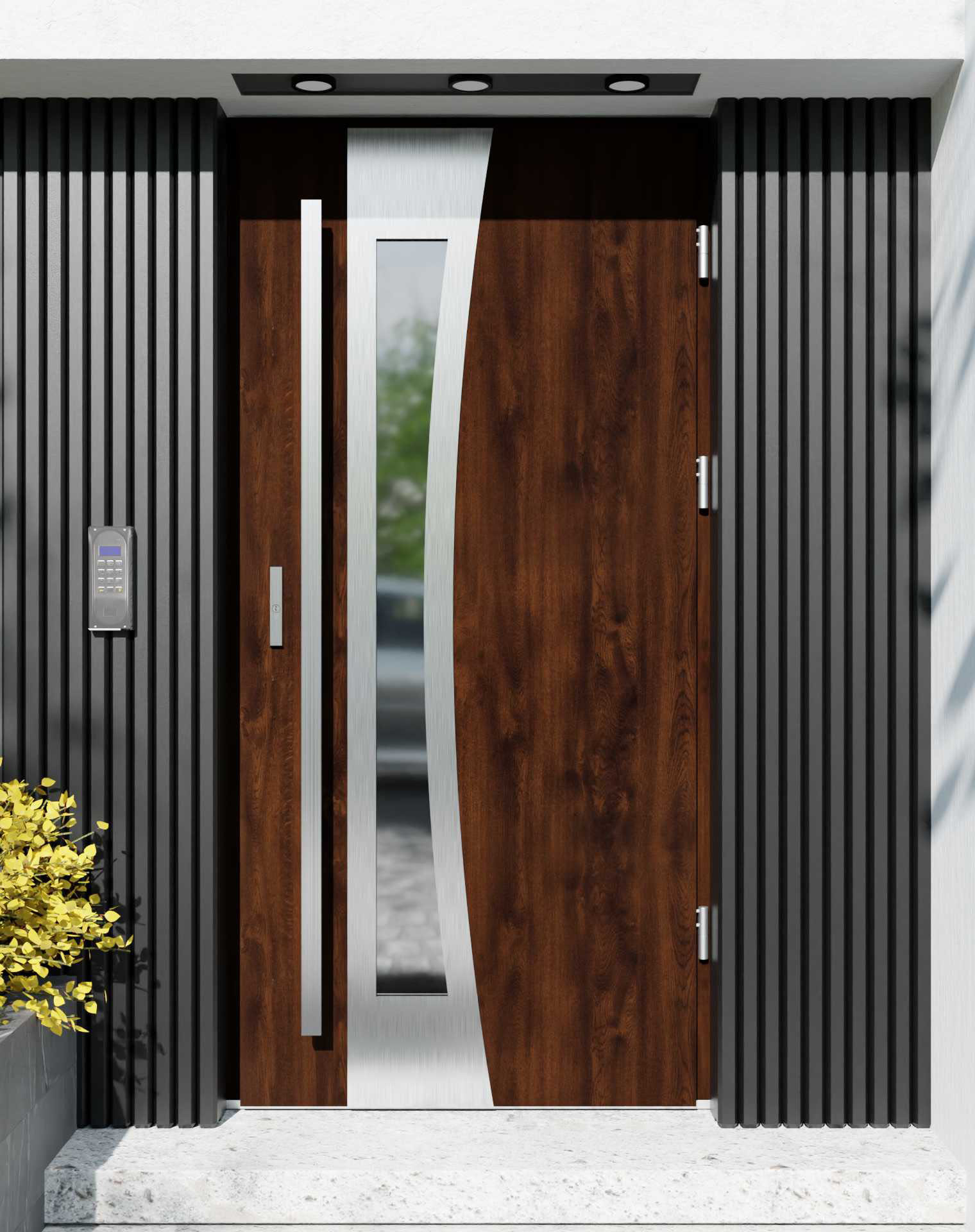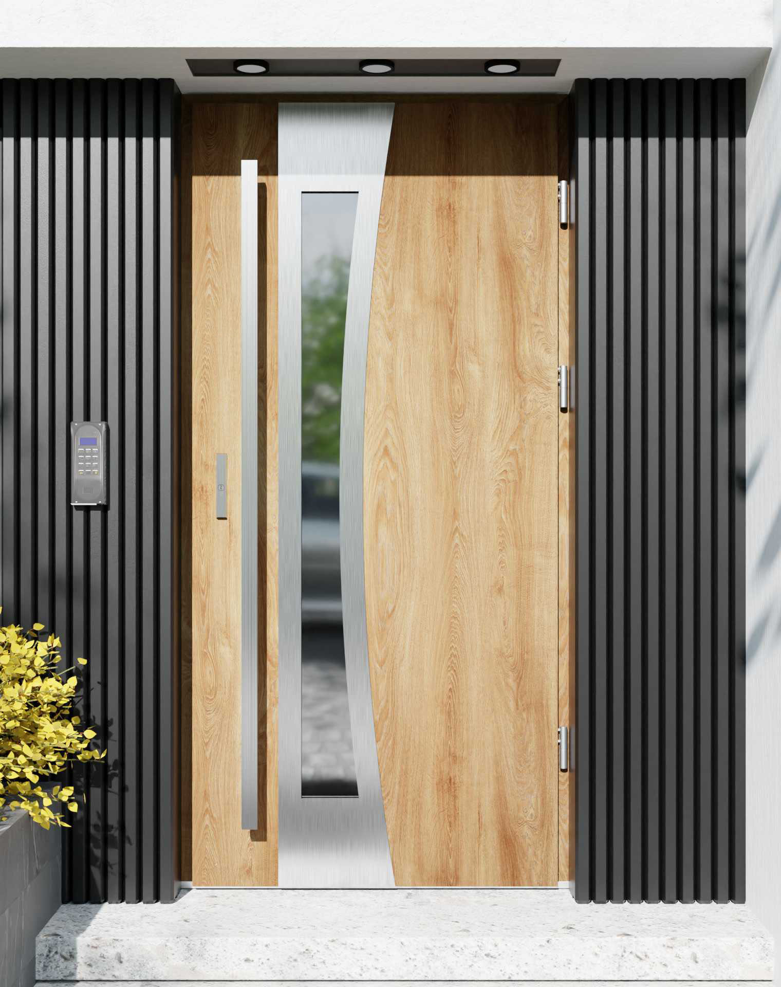 Drzwi zewnętrzne z szybą oraz panelem dekoracyjnym ze stali nierdzewnej w kształcie łuku. Wzór szyby i panelu nadaje drzwiom unikalny charakter.