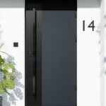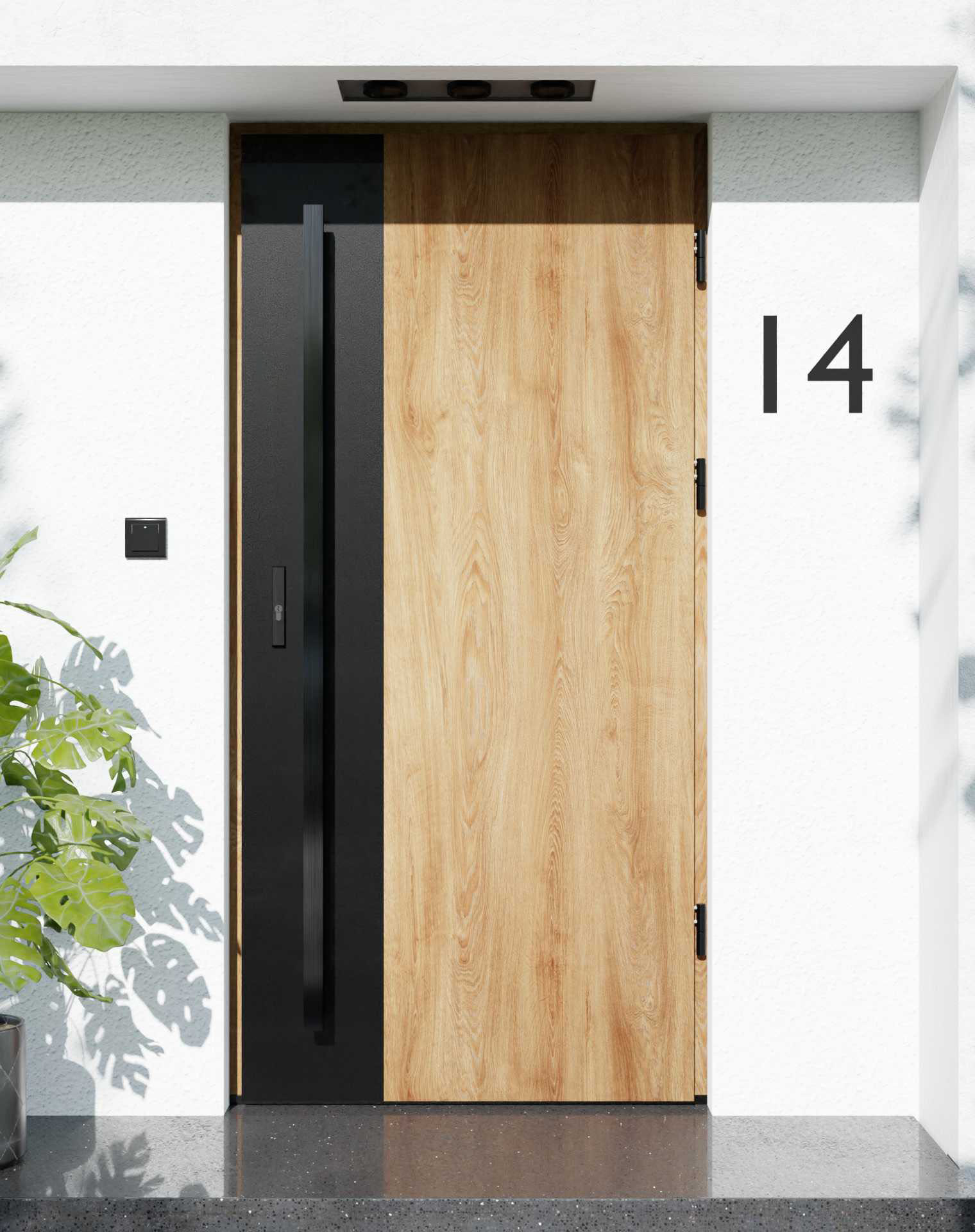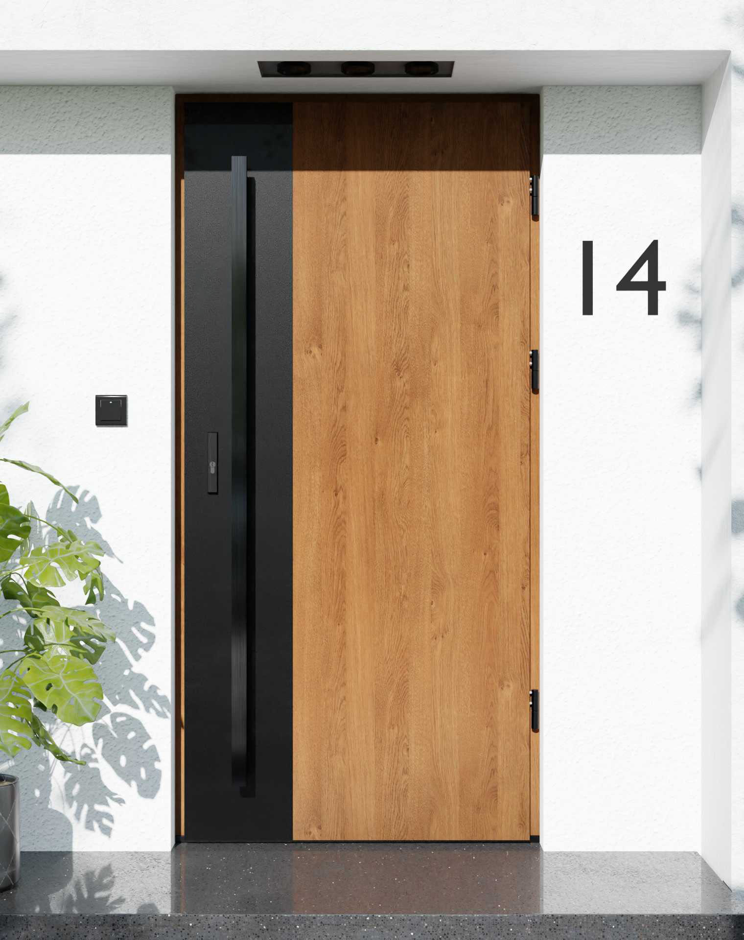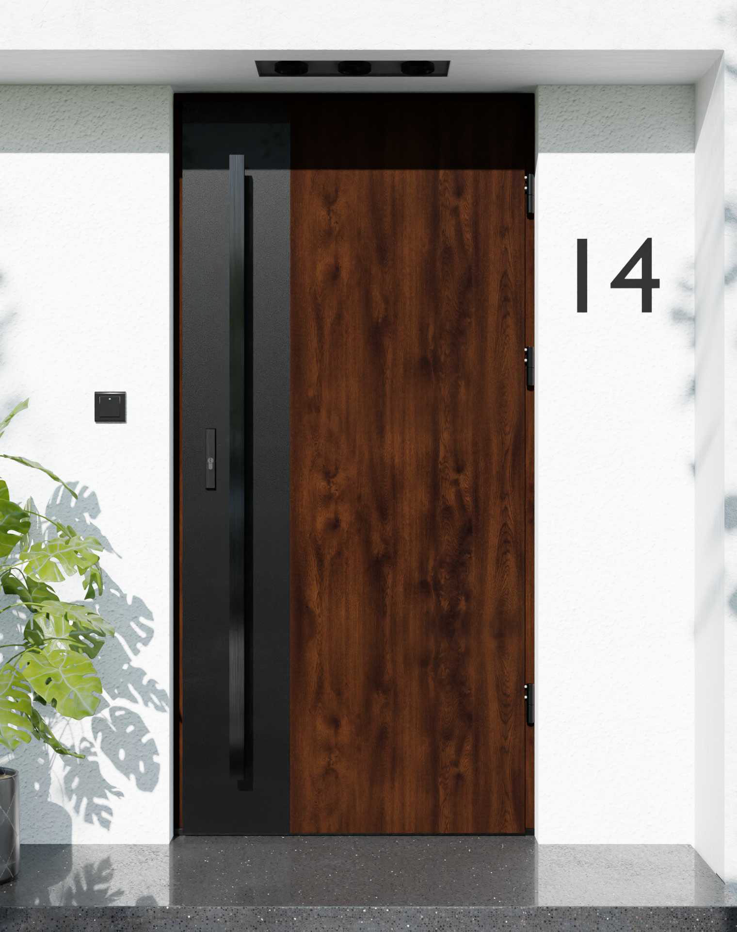 Gładkie drzwi zewnętrzne z panelem ozdobnym malowanym proszkowo na kolor czarnego matu, umieszczonym w bocznej części skrzydła.